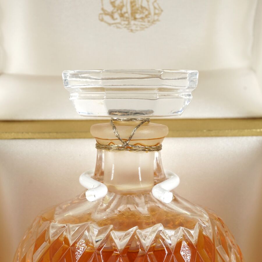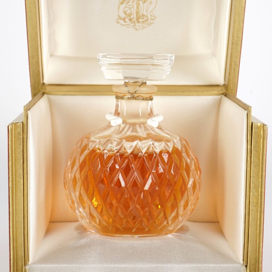 NINA RICCI - Marc LALIQUE (1900-1977) : "Capricci" (1964), flacon en cristal modèle pointe de diamant, bouchon scélé plat à pans coupés, modèle réalisé par la maison Lalique, bouche scellé, PDO, présenté dans son coffret d'origine en tissu marron, intérieur satiné, H. 8.5 cm.