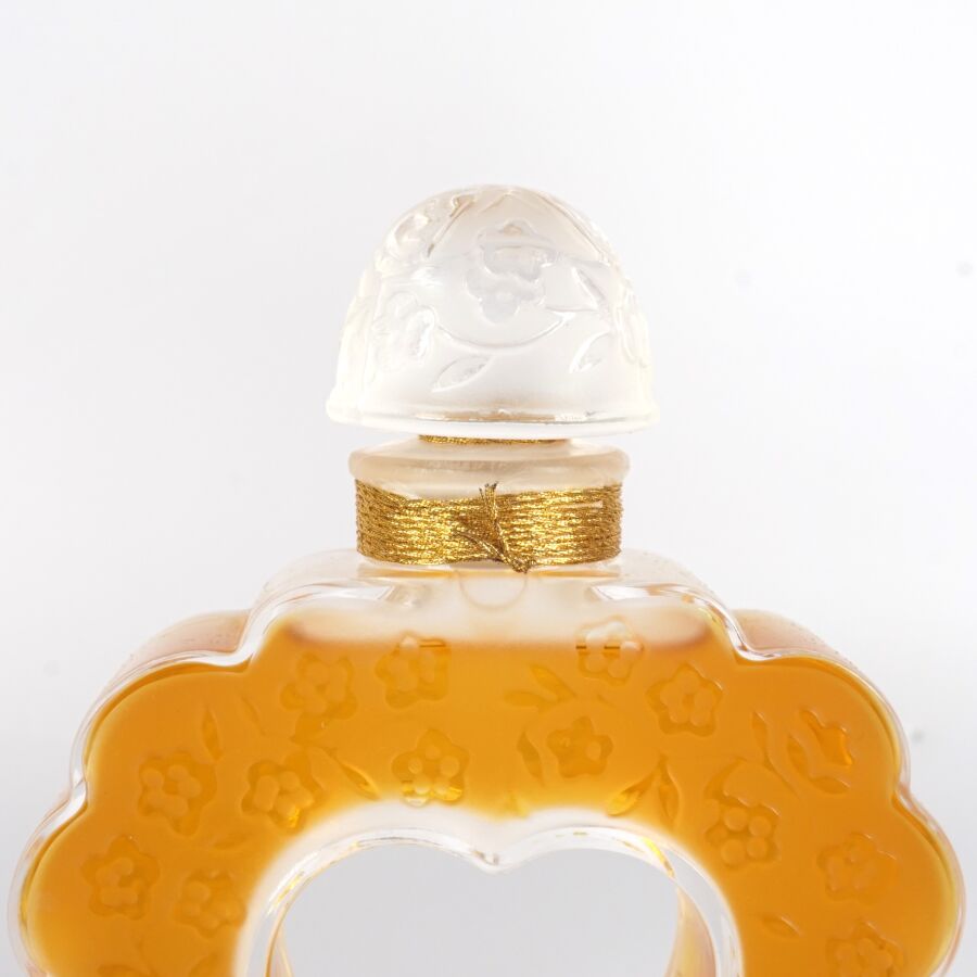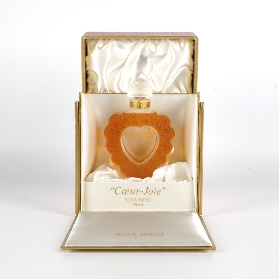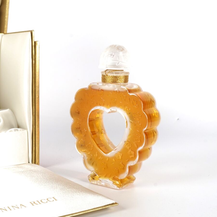 NINA RICCI - Marc LALIQUE : "Coeur-Joie", flacon en cristal incolore et dépoli moulé pressé à motif de fleurettes, pourtour festonné, numéroté dessous, bouchon scellé, présenté dans son luxueux coffret en carton gainé de satin rose et blanc, H. 11 cm (PDO).