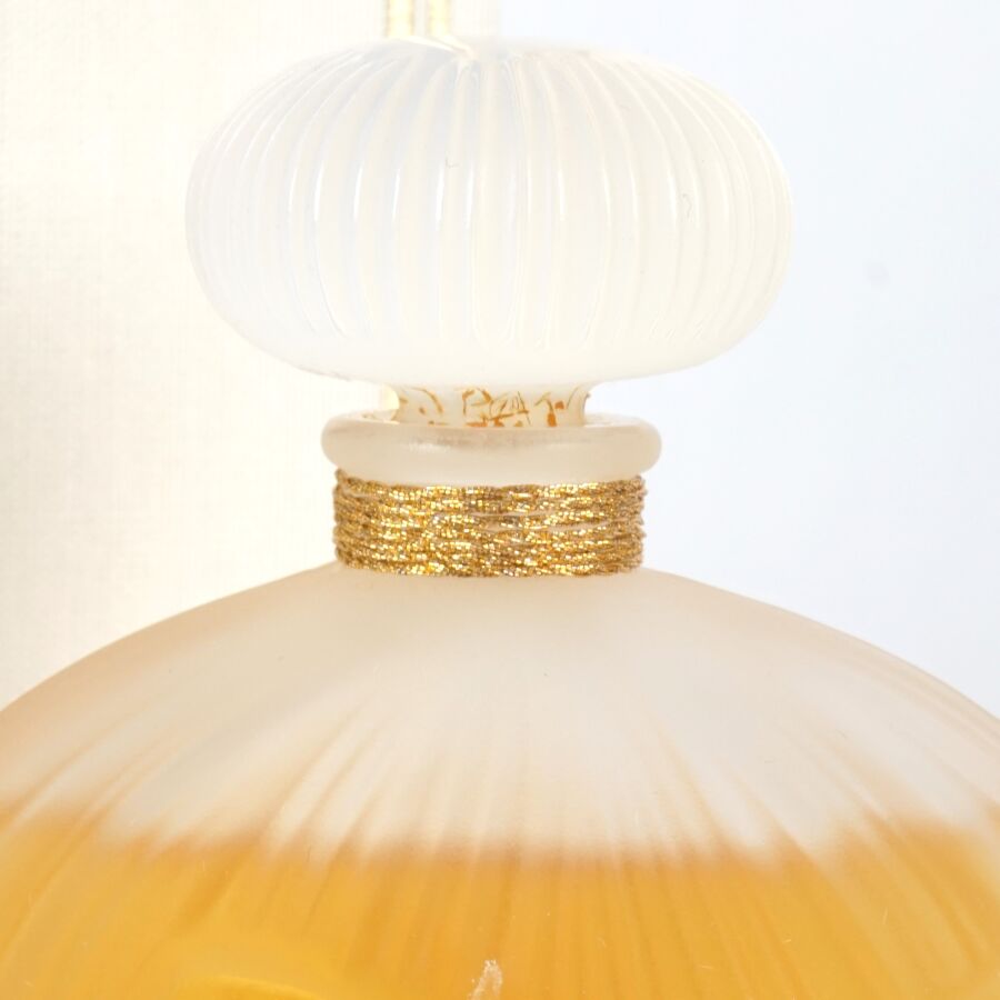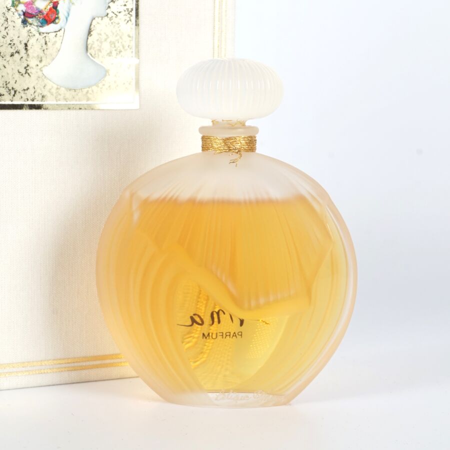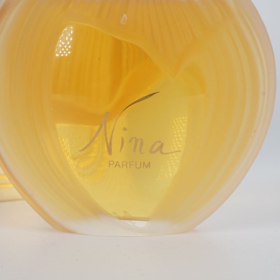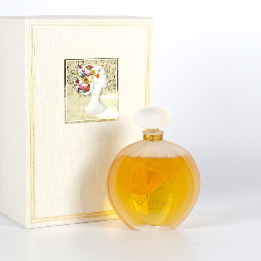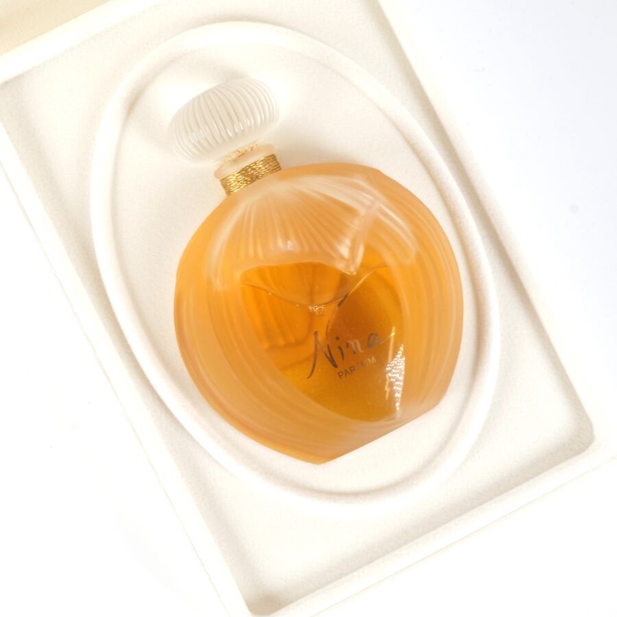 NINA RICCI : "Nina", flacon en verre moulé incolore partiellement satiné, inscriptions en sérigraphie dorée sur une face, bouchon sphérique rainuré, scellé, signé Lalique France à la pointe sur la base, PDO, présenté dans son coffret d'origine (56 ml).
