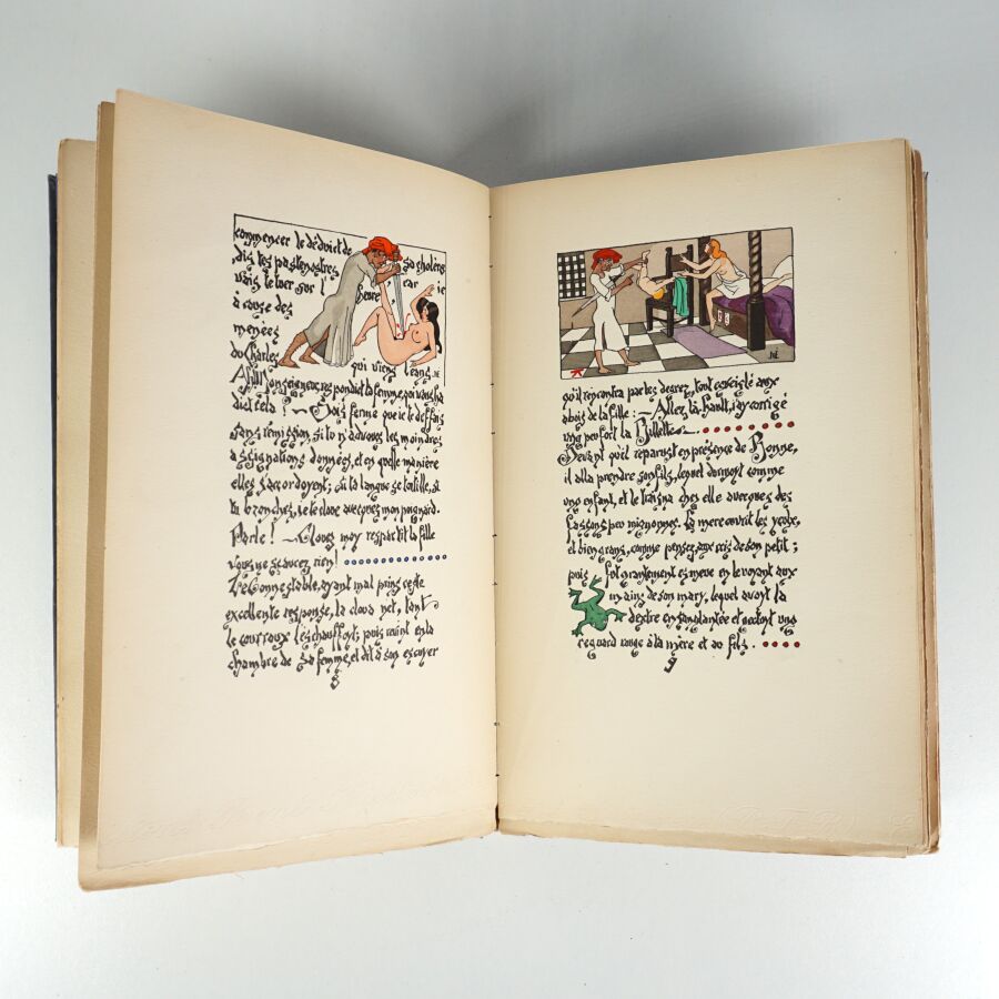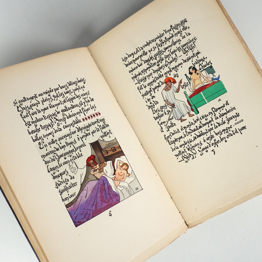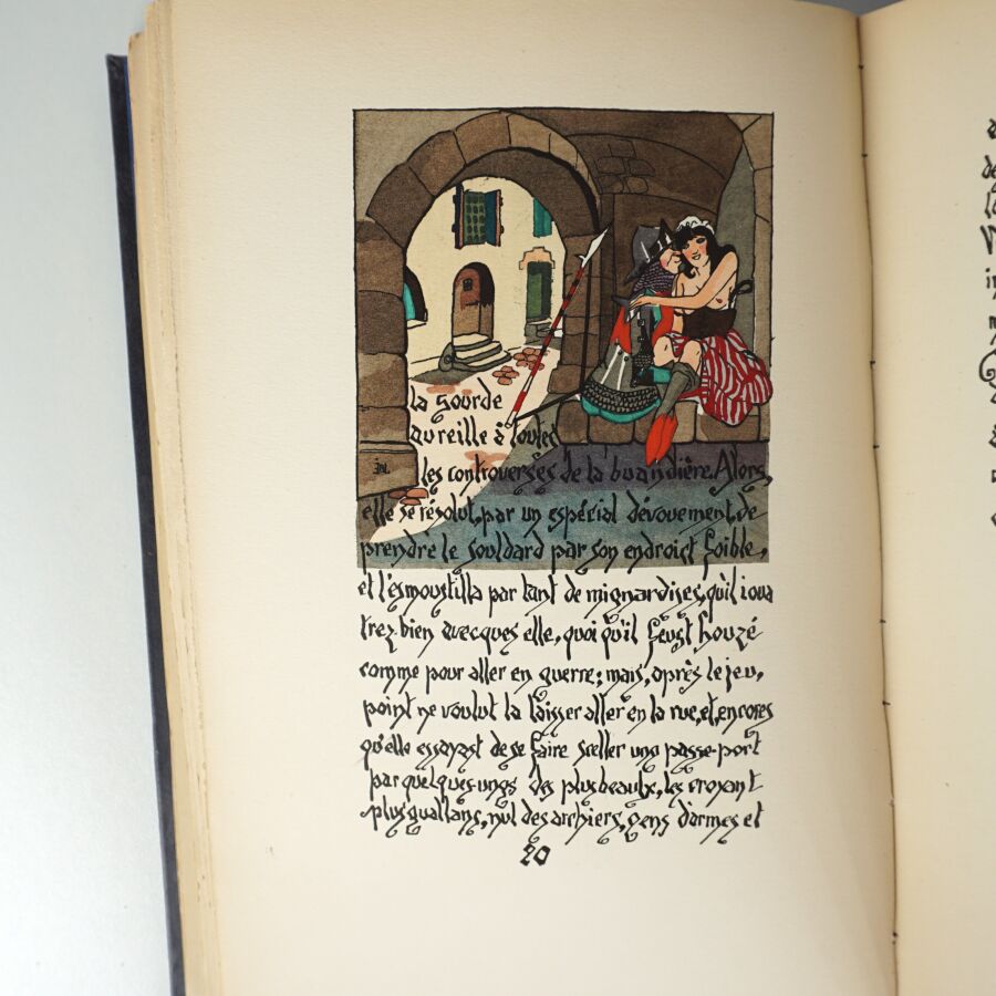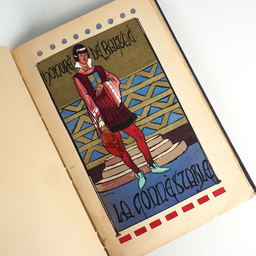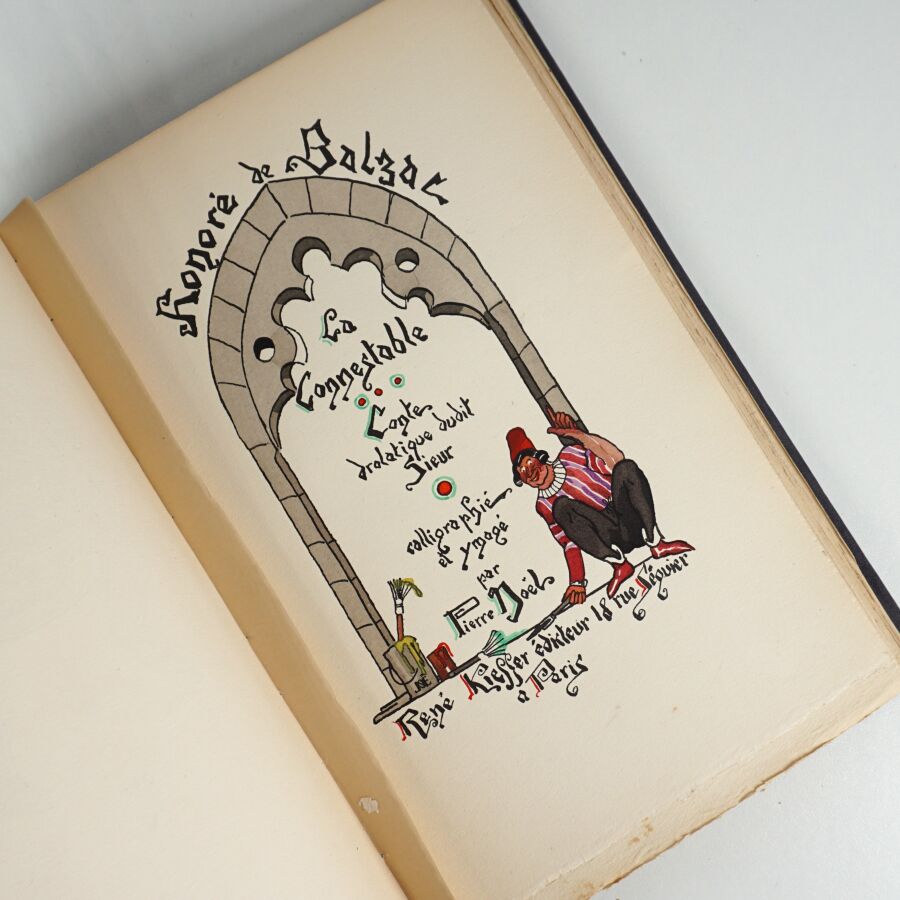 NOËL (Pierre) & BALZAC (Honoré de). La Connestable, contes drolatique dudit sieur, calligraphié et imagé par Pierre Noël. Paris, Kieffer, 1925. In-8 bradel demi-maroquin rouge, plats en veau gris anthracite, pièce de titre en maroquin rouge avec titre peint en lettres noires au premier plat, couverture illustrée en couleurs et dos conservées, sous emboîtage. Nombreuses illustrations rehaussées au pochoir.