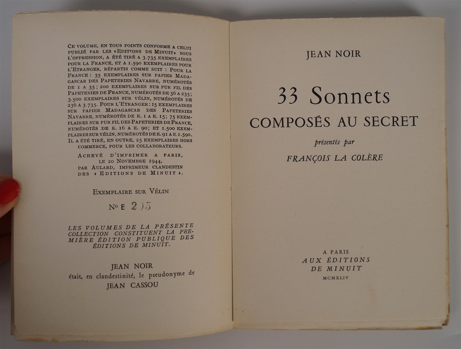 NOIR (Jean) [CASSOU (Jean)] - 33 sonnets composés au secret présentés par François la Colère [Aragon] - Paris ; Aux Editions de Minuit, 1944 - 1 volume In-12° broché sous couverture imprimée à rabats - 1ère édition publique des éditions de minuit - Exemplaire non coupé, numéroté sur vélin.