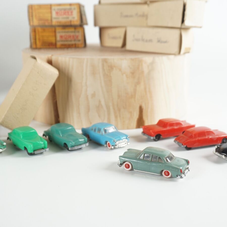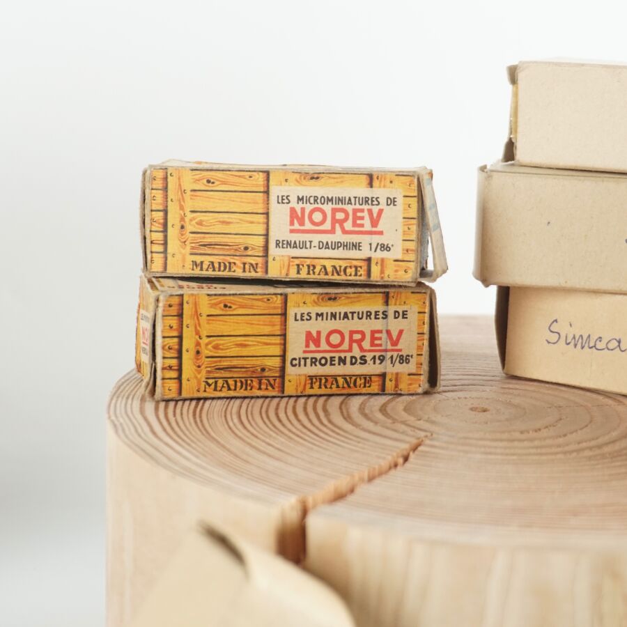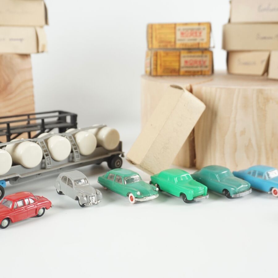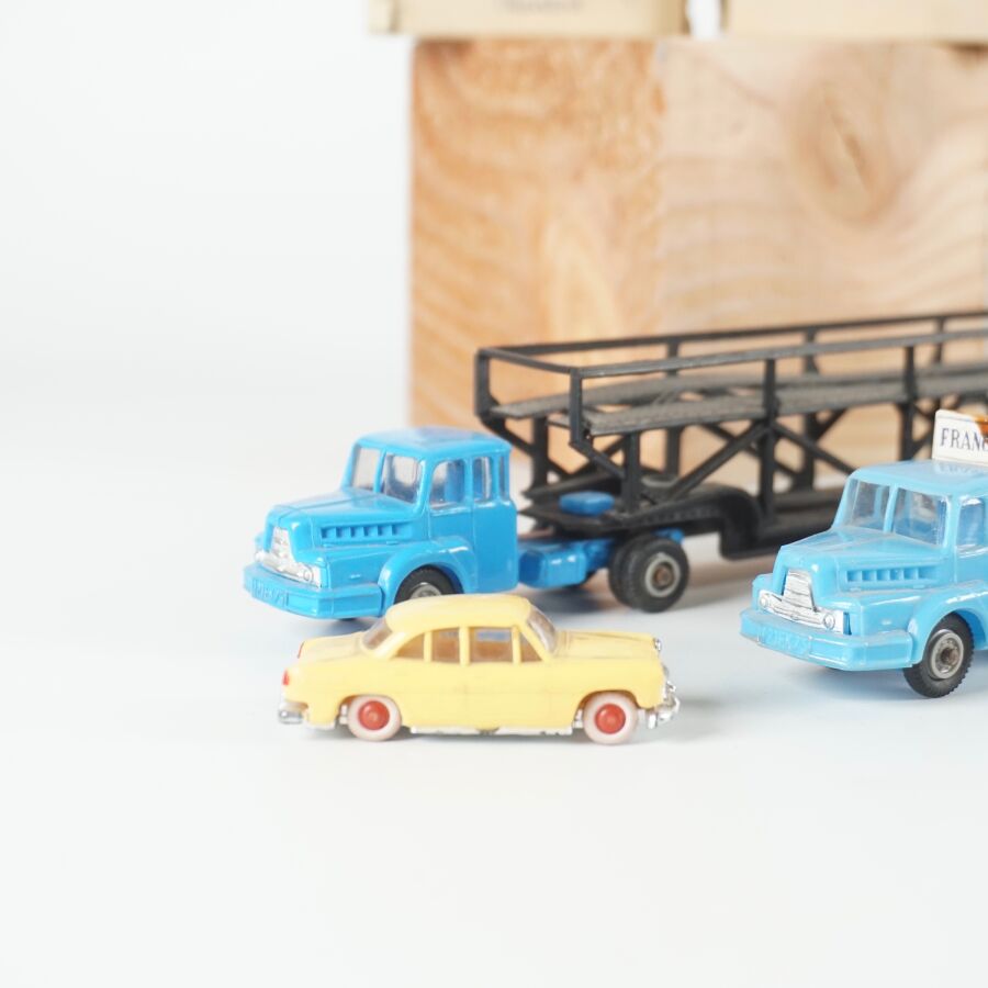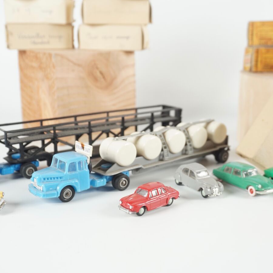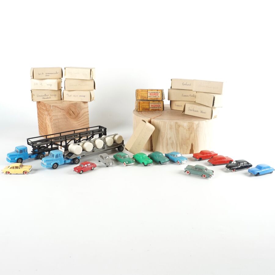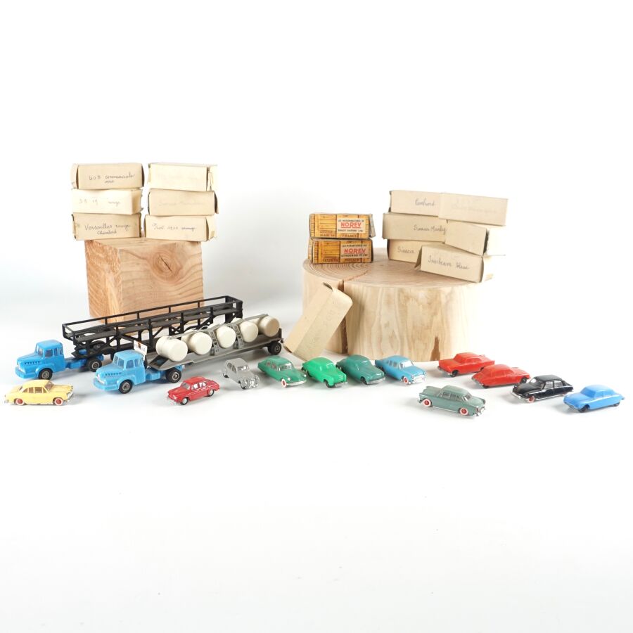NOREV - CADUM : Ensemble de 26 véhicules divers et 2 camions avec remorques, certains présentés dans leurs boîtes d'origine (usures, quelques traces).