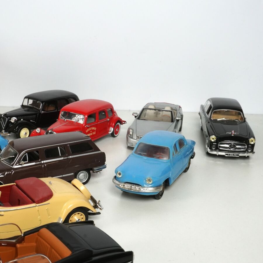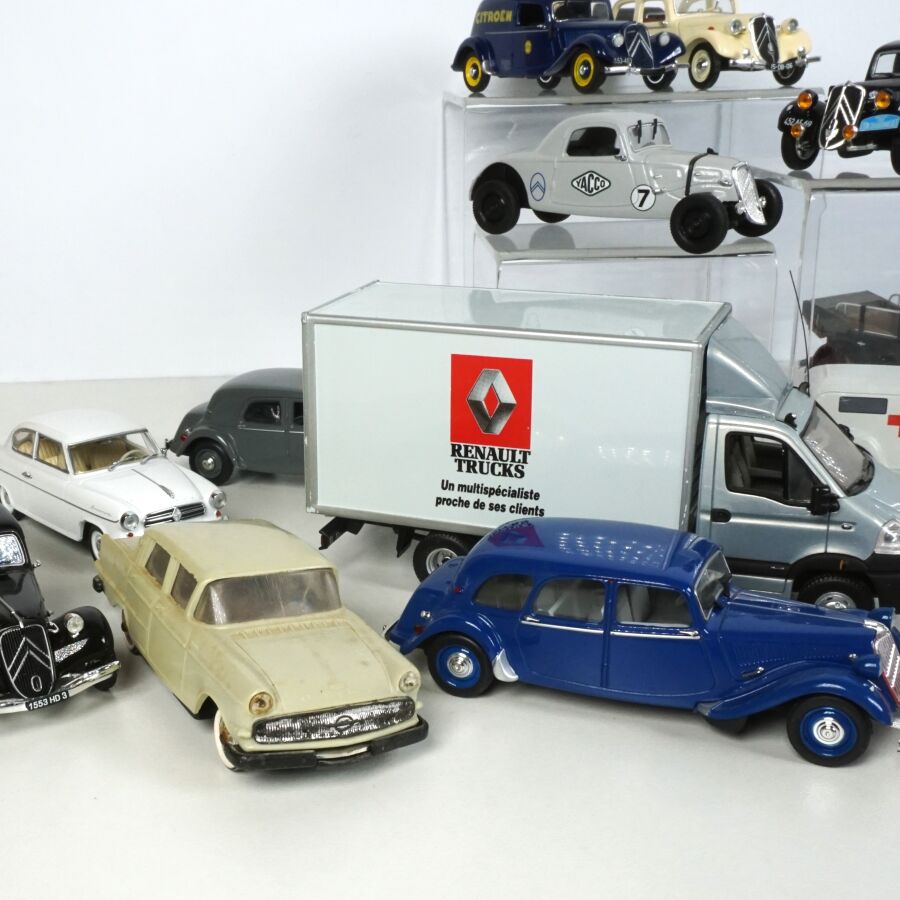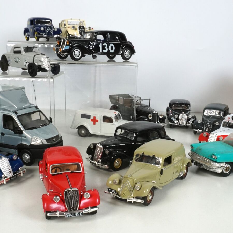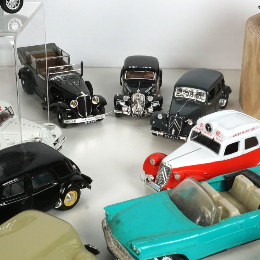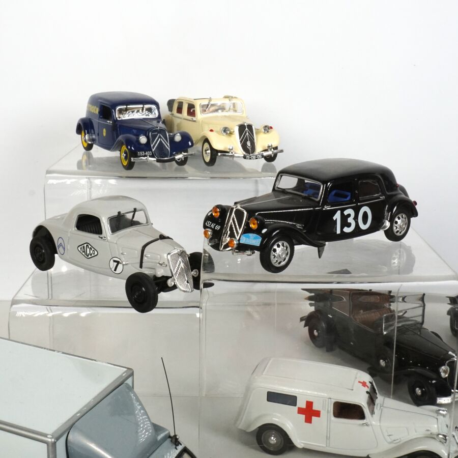 NOREV : Ensemble de 34 véhicules, échelle 1/43ème, comprenant notamment (1) Citroën Traction 15cv bleu marine ; (1) Borgward Isabella Limousine, blanche ; (1) Citroën 15cv Limousine Chapron, noire (1) Citroën traction avant Six Cylinder Slough, 1951, verte et (1) Chrysler New Yorker coupé décapotable, turquoise et sa caravane Henon, EH. 56.220 (usures, écaillures).