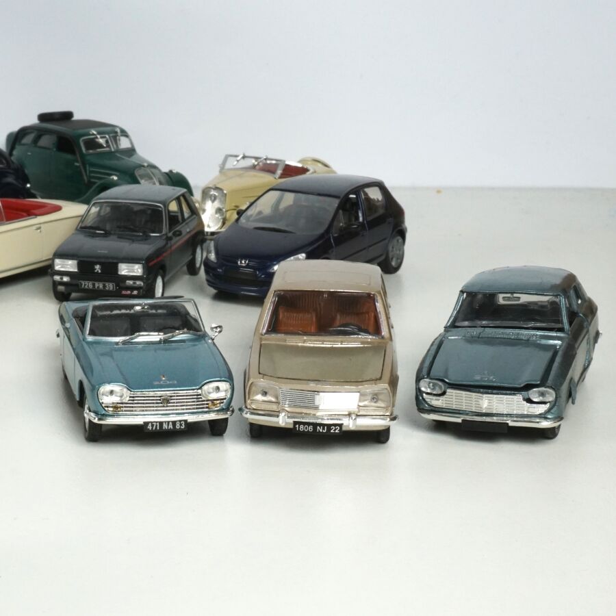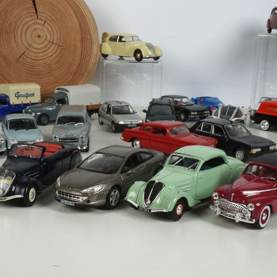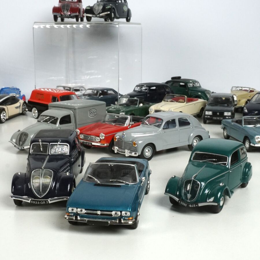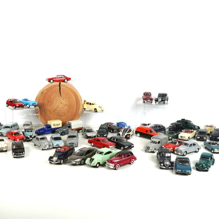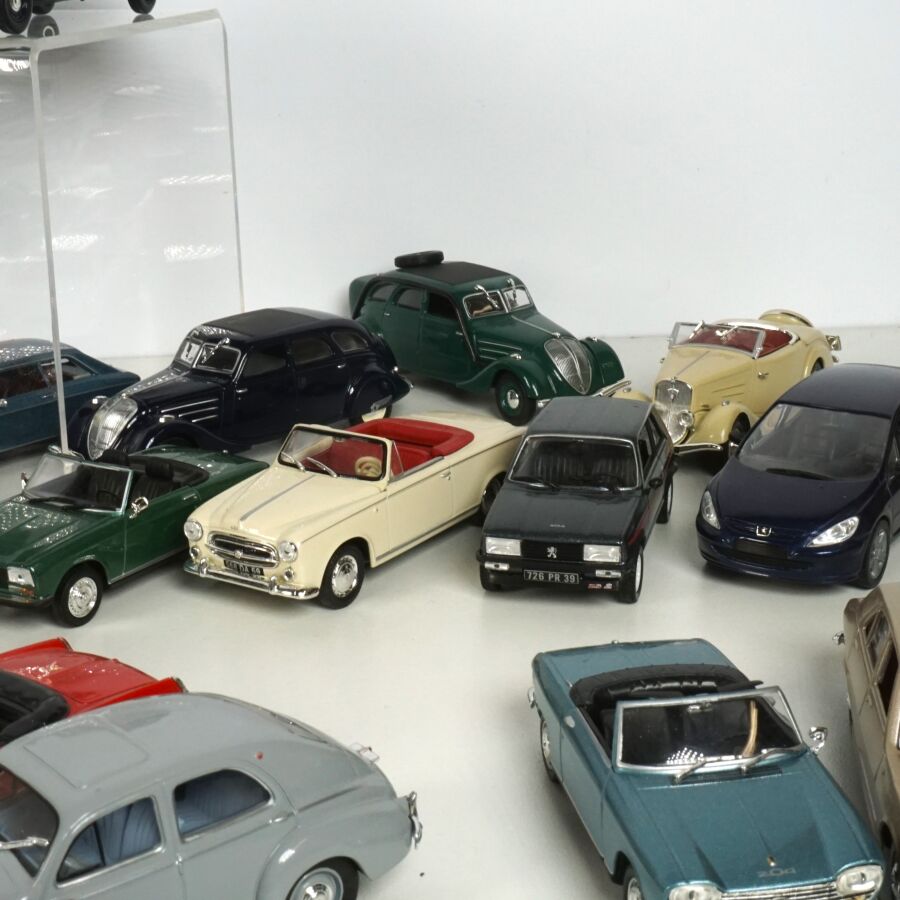NOREV : Ensemble d'environ 49 véhicules PEUGEOT, échelle 1/43ème, comprenant notamment (1) Peugeot 402 Andreau, beige, avec glaces ; (1) Peugeot 404 Diesel des Records, bleue ; (1) Peugeot 4002, beige, noire et argent ; (1) Peugeot 402, verte avec capote rétractable ; (1) Camionnette Peugeot 202 bleue et beige et (1) Peugeot 403 publicitaire "Parfumerie Felix Paris", noire et rouge (usures, écaillures).