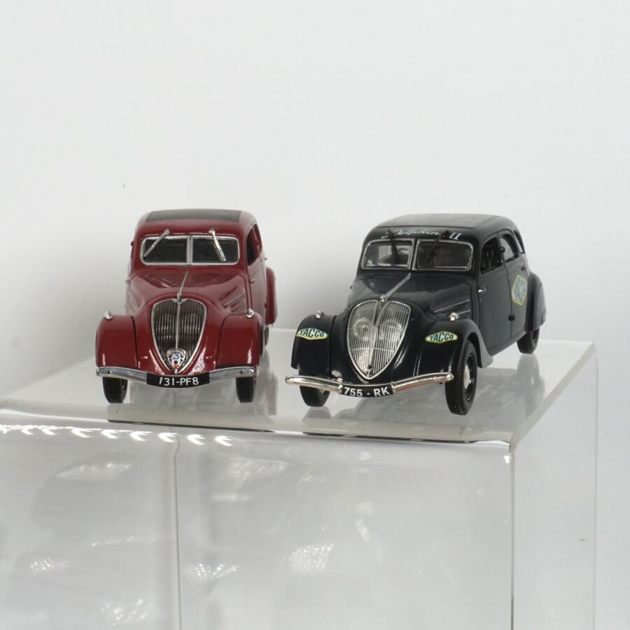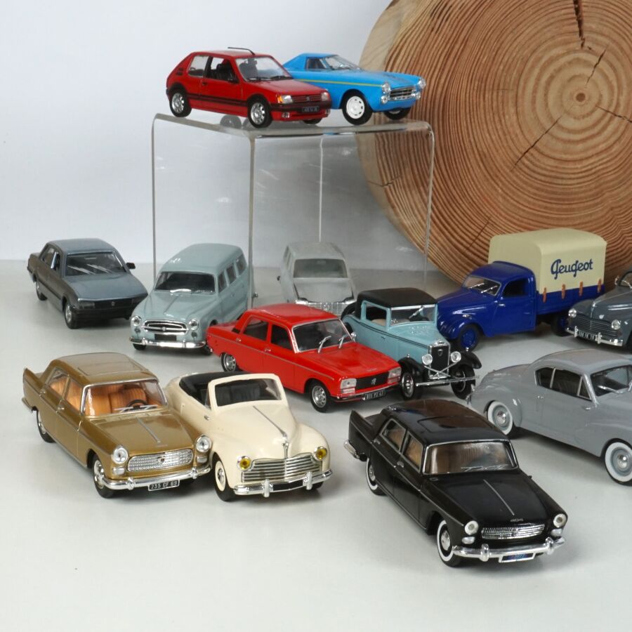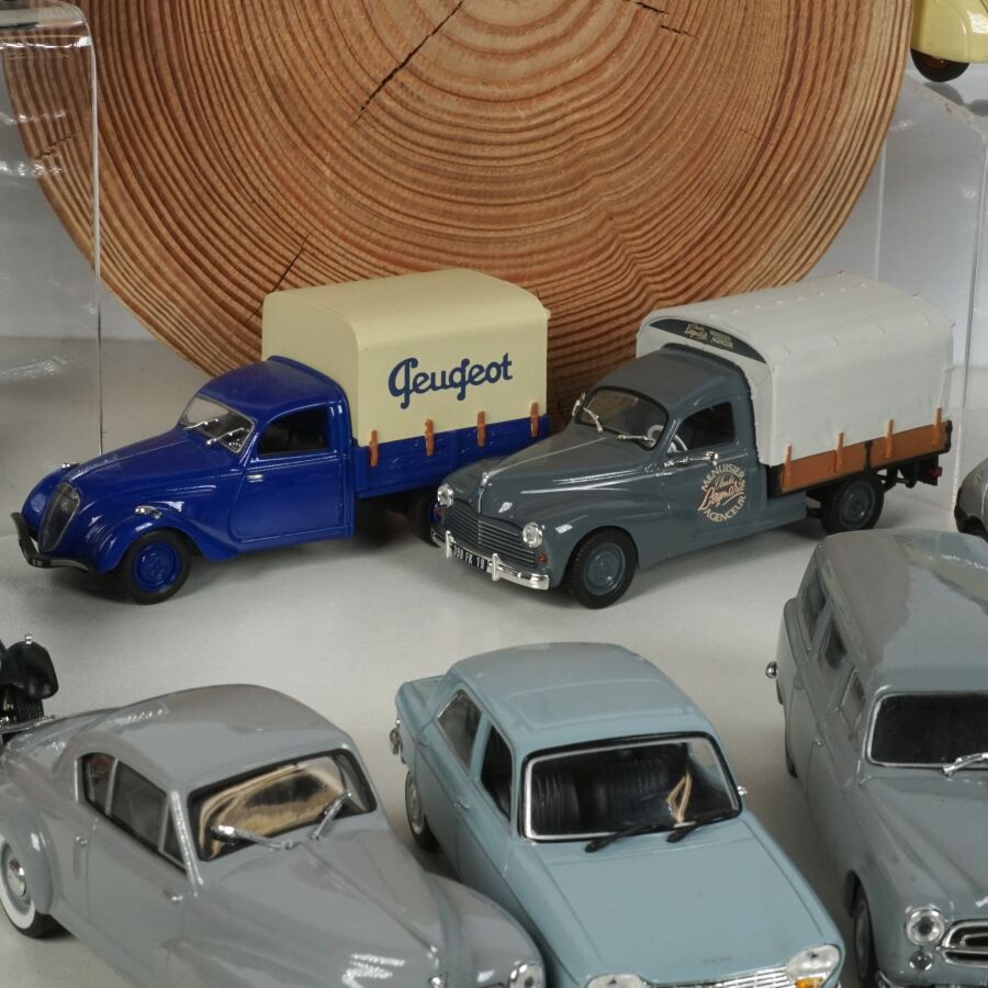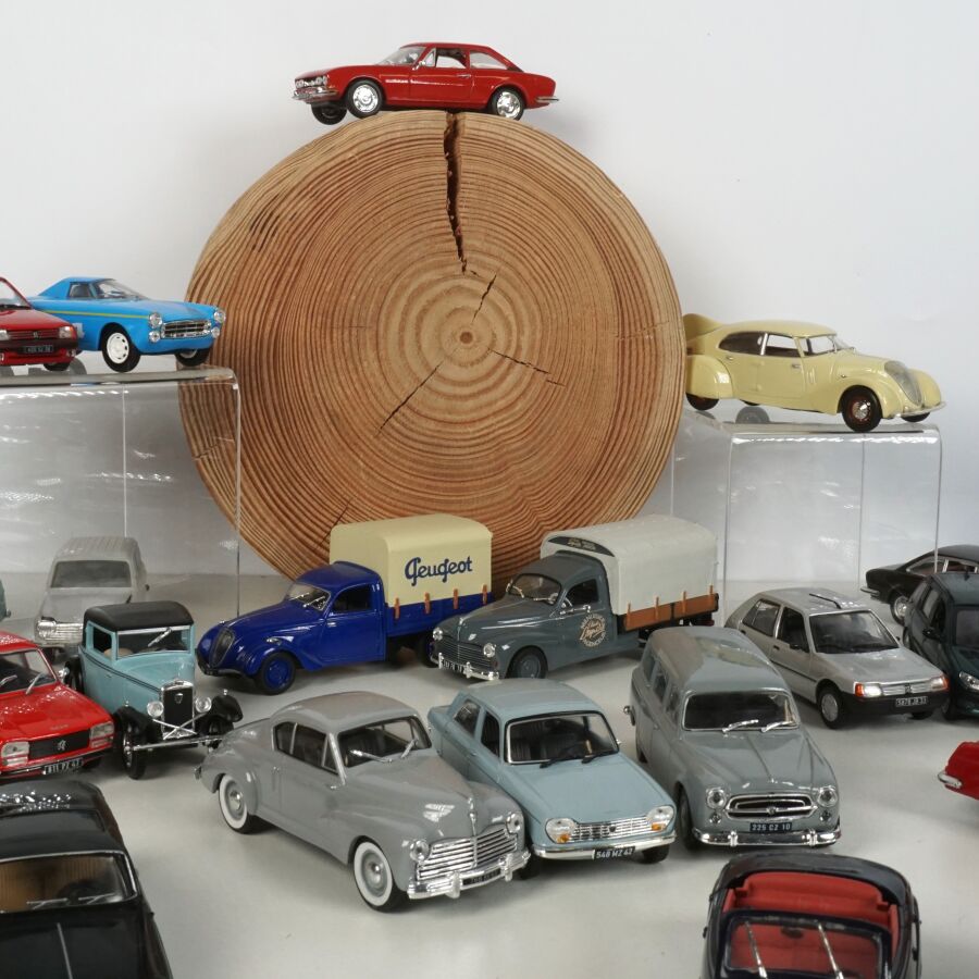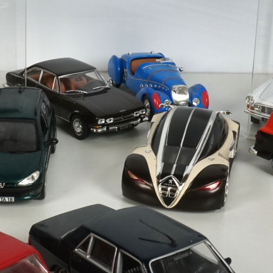 NOREV : Ensemble d'environ 49 véhicules PEUGEOT, échelle 1/43ème, comprenant notamment (1) Peugeot 402 Andreau, beige, avec glaces ; (1) Peugeot 404 Diesel des Records, bleue ; (1) Peugeot 4002, beige, noire et argent ; (1) Peugeot 402, verte avec capote rétractable ; (1) Camionnette Peugeot 202 bleue et beige et (1) Peugeot 403 publicitaire "Parfumerie Felix Paris", noire et rouge (usures, écaillures).