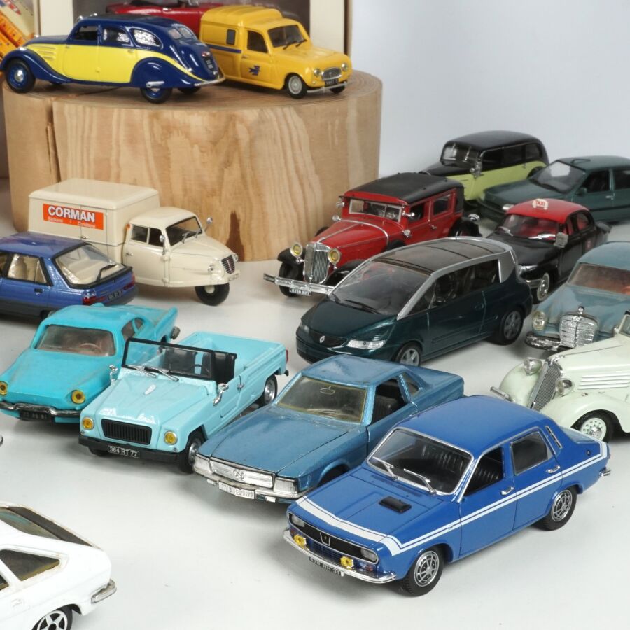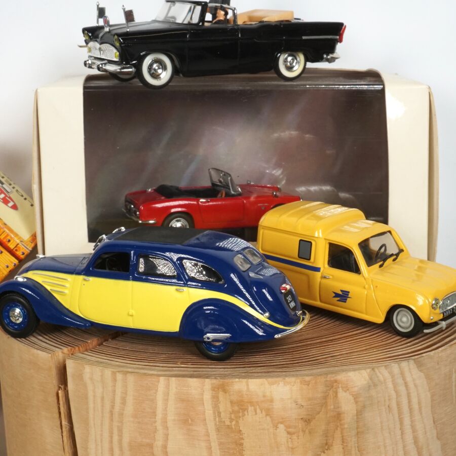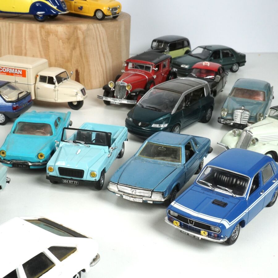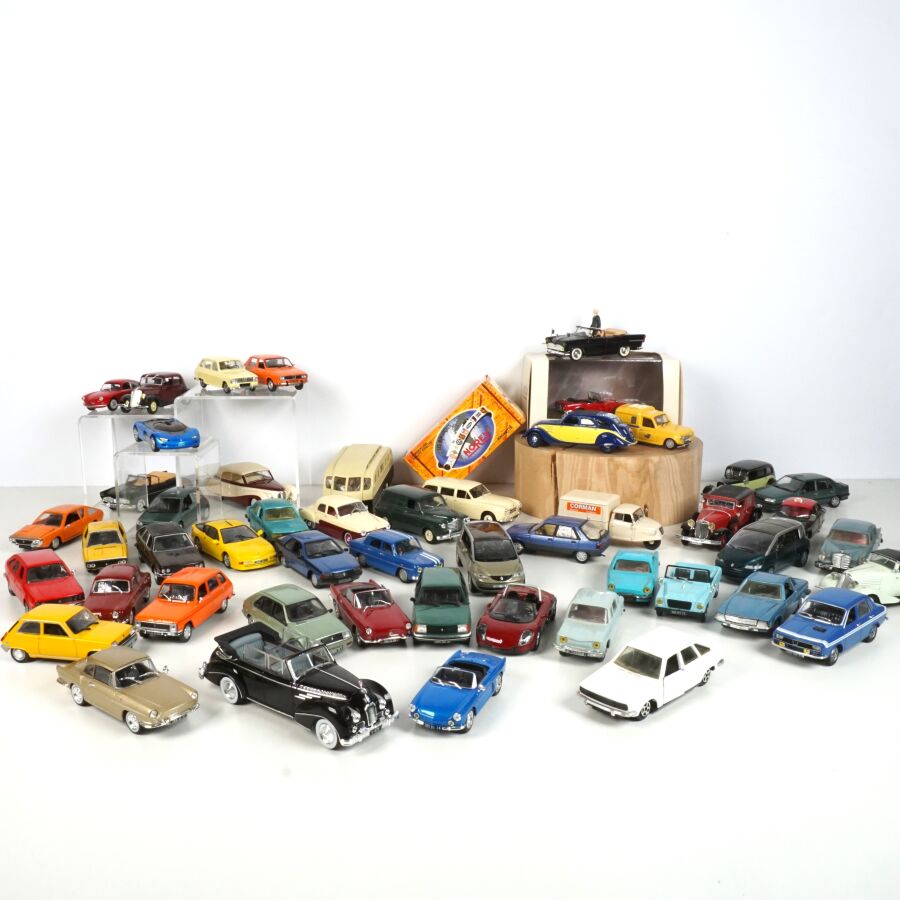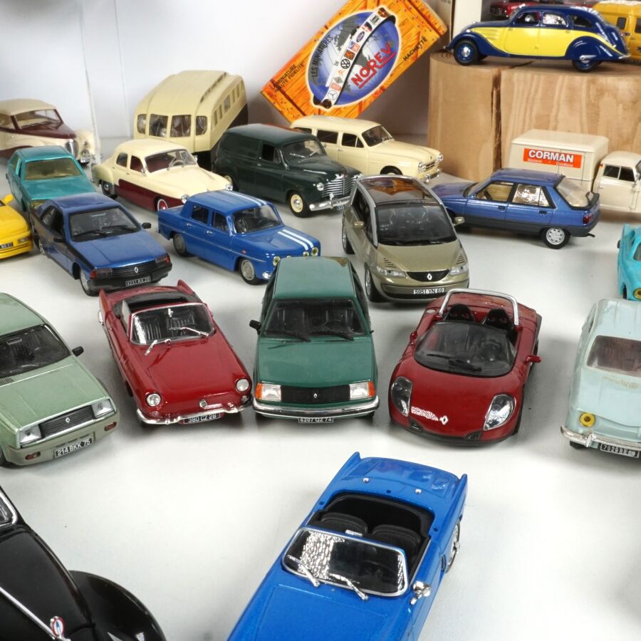 NOREV : Ensemble d'environ 51 véhicules, échelle 1/43ème, comprenant notamment (1) Honda S800 1966 rouge, avec socle et boîte d'origine ; (1) Fourgonnette La Poste Renault R4 1998 ; (1) Simca Présidentielle 1959, réf. 91, noire avec son conducteur et le Président ; (1) Renault Rodeo bleu clair ; (1) Renault Fregato Domaine beige ; (1) Austin Sheerline Princess crème et bordeaux ; et divers (usures, écaillures, manques).