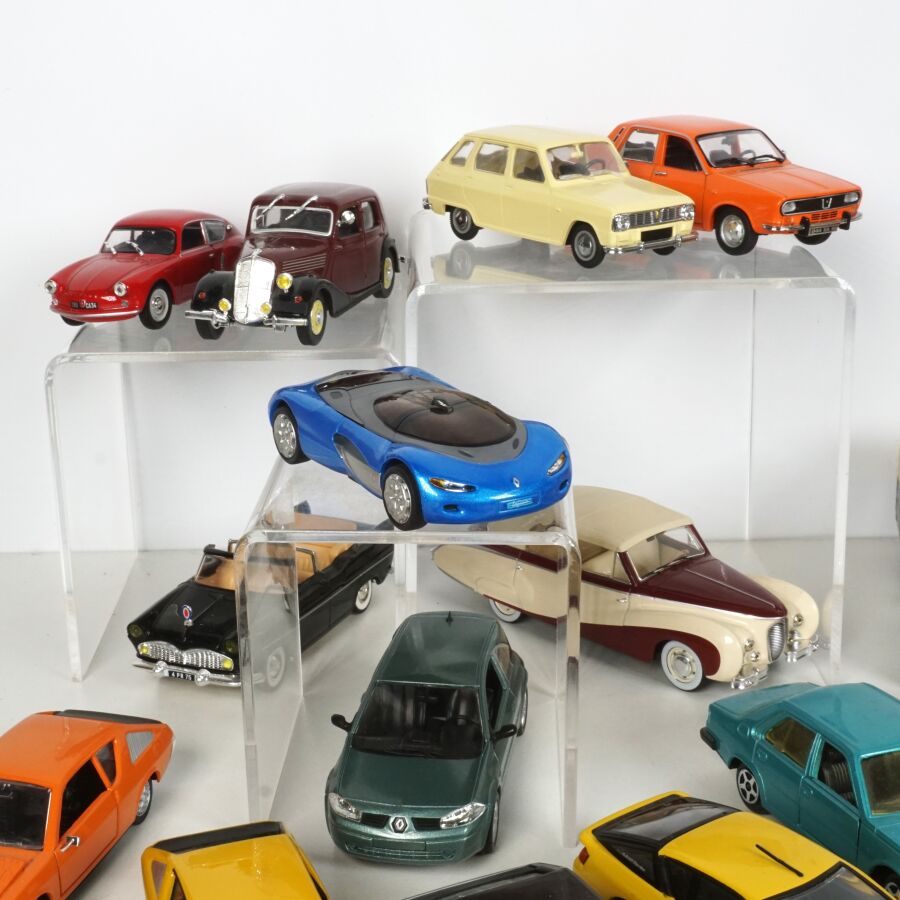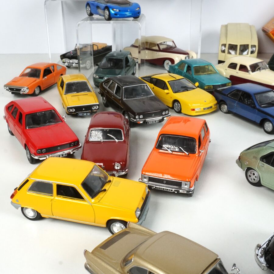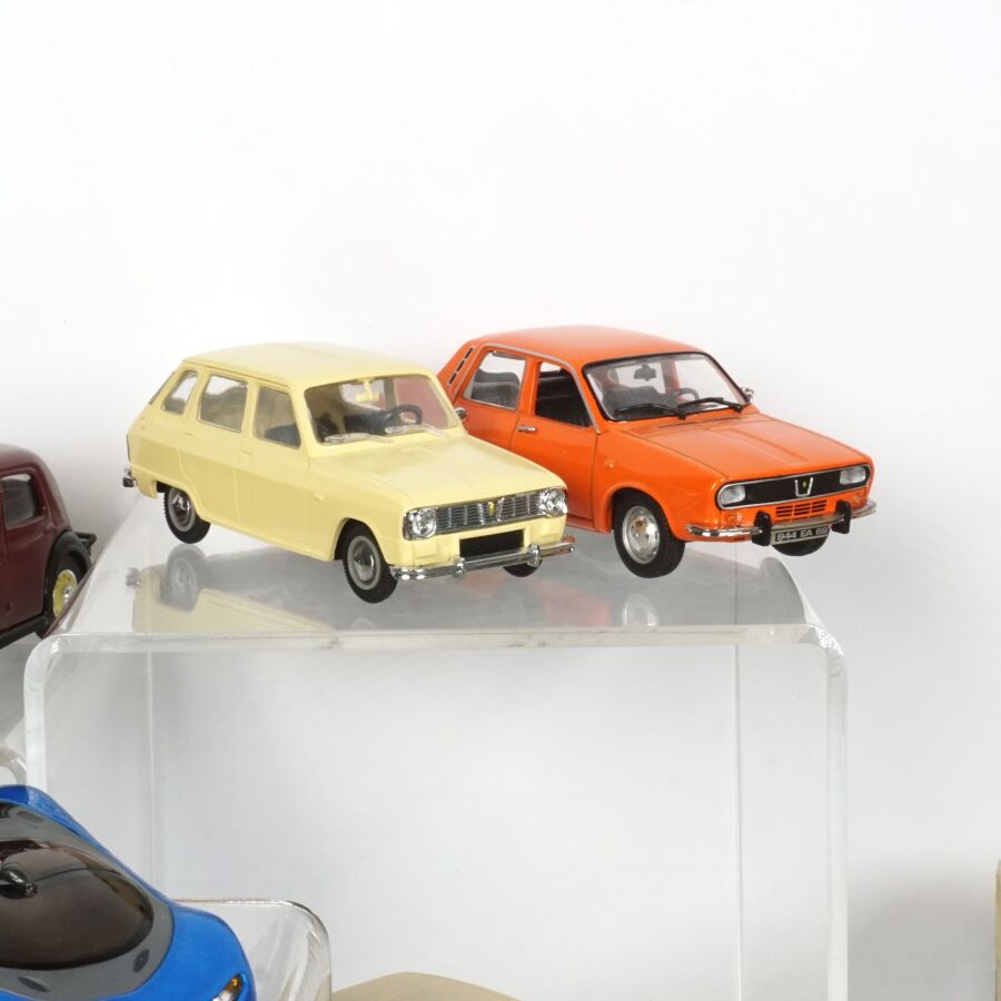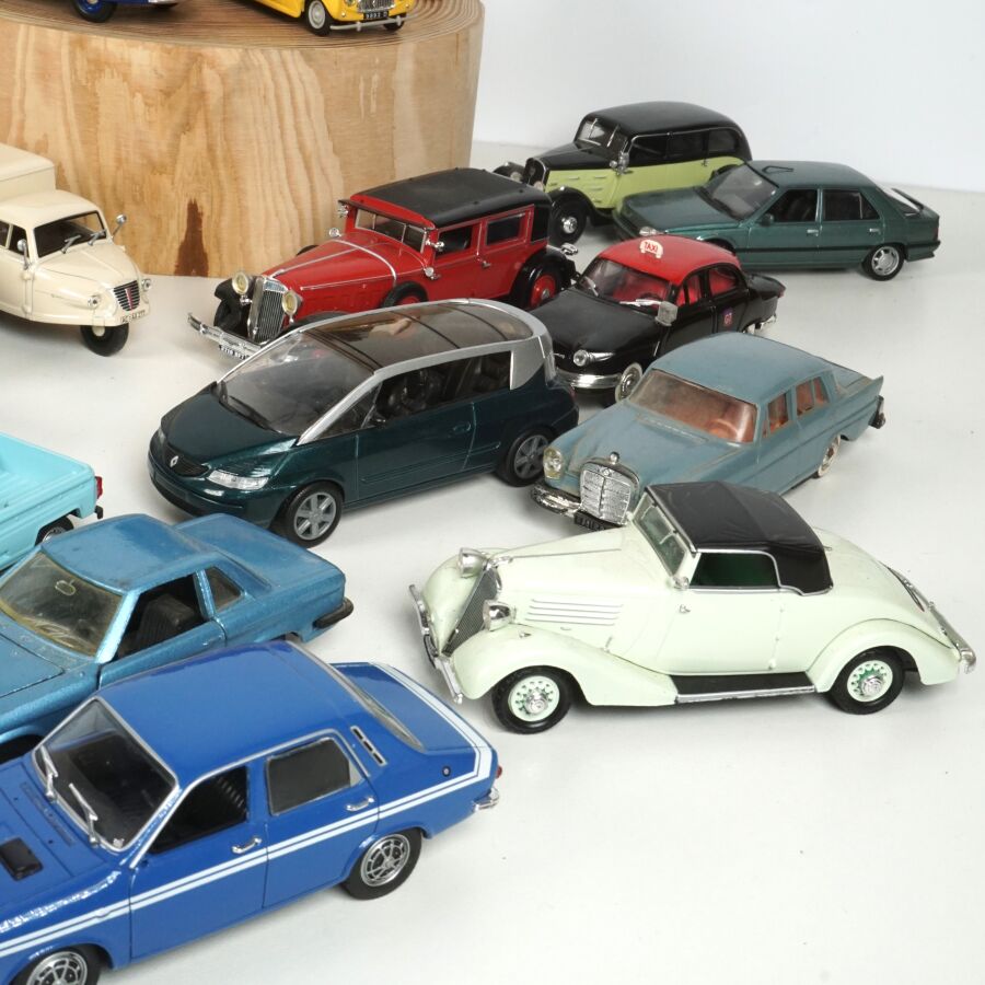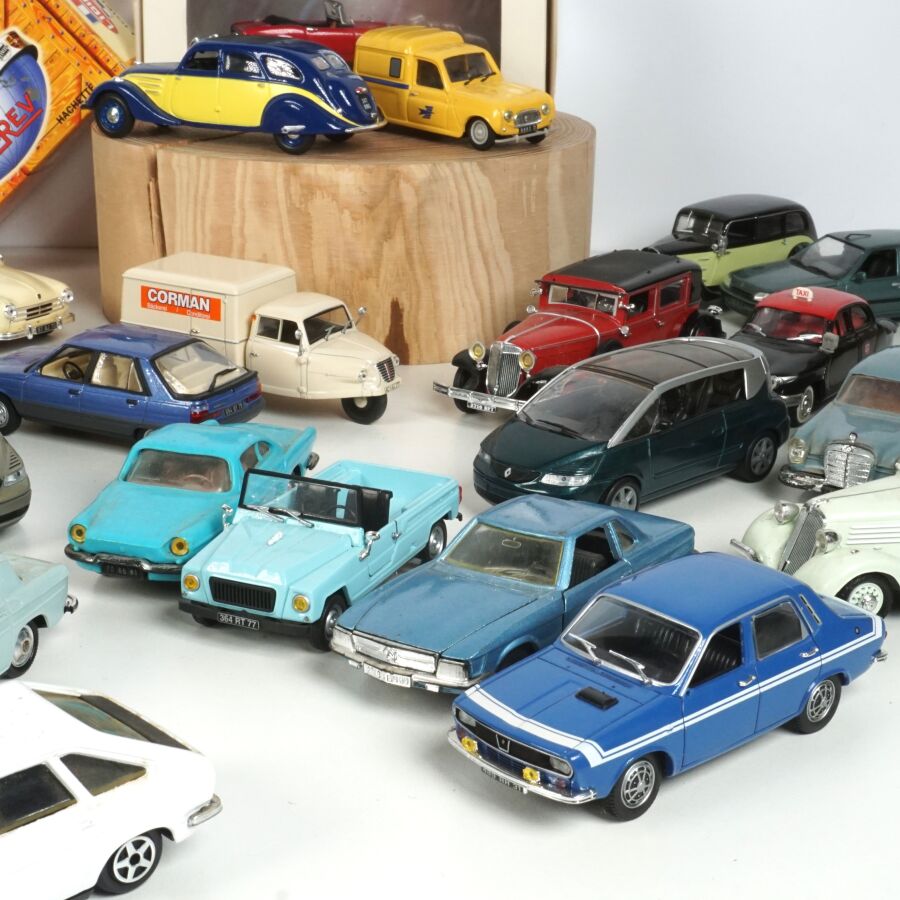 NOREV : Ensemble d'environ 51 véhicules, échelle 1/43ème, comprenant notamment (1) Honda S800 1966 rouge, avec socle et boîte d'origine ; (1) Fourgonnette La Poste Renault R4 1998 ; (1) Simca Présidentielle 1959, réf. 91, noire avec son conducteur et le Président ; (1) Renault Rodeo bleu clair ; (1) Renault Fregato Domaine beige ; (1) Austin Sheerline Princess crème et bordeaux ; et divers (usures, écaillures, manques).