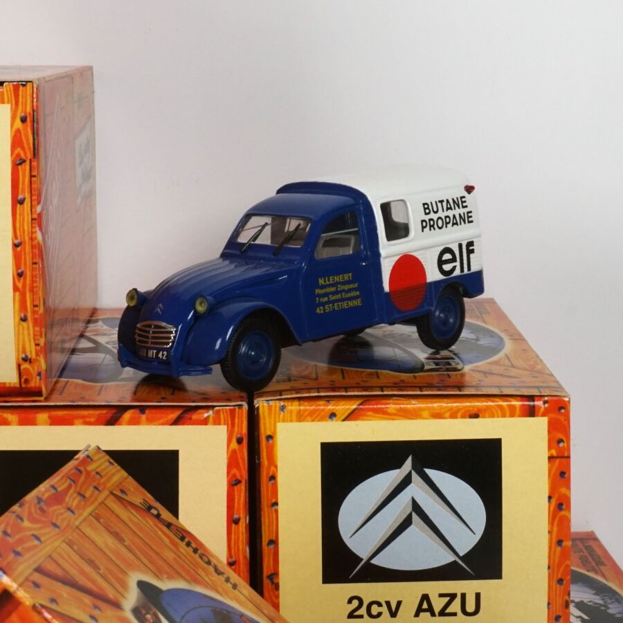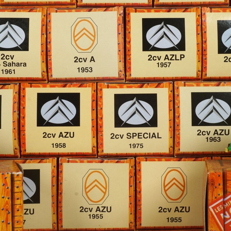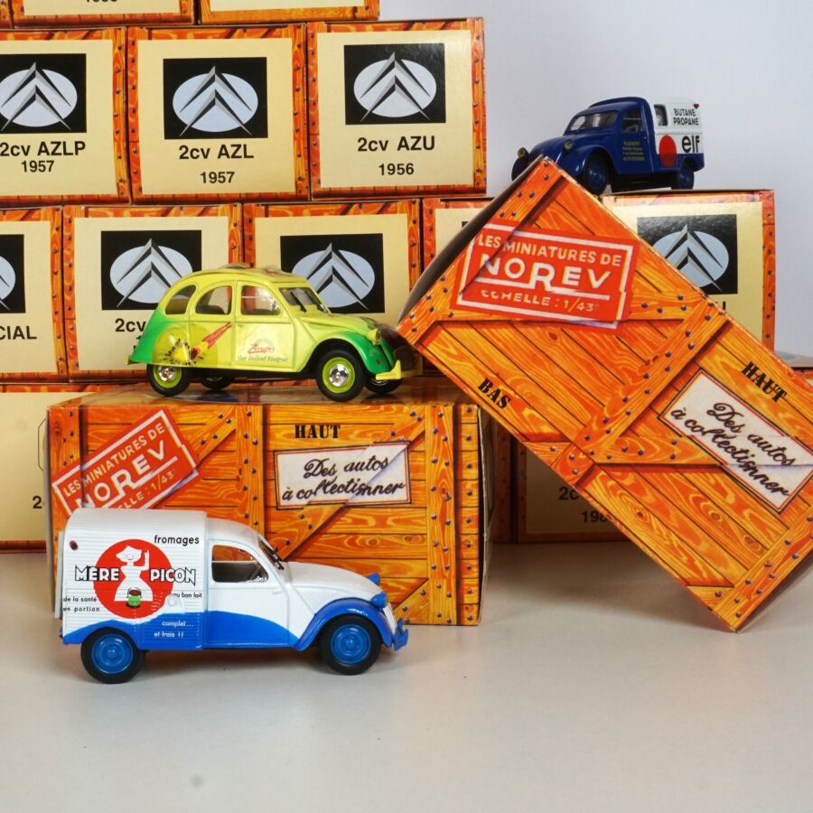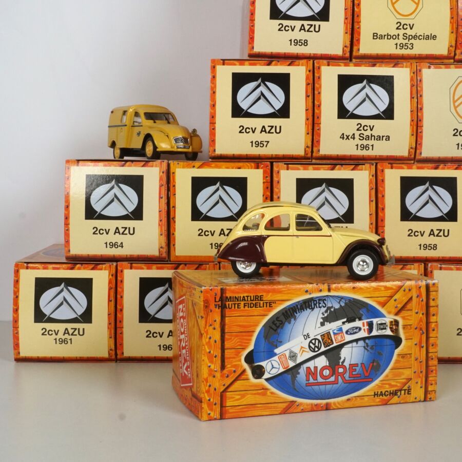 NOREV - HACHETTE : Ensemble de 43 véhicules CITROËN 2CV, échelle 1/43ème, comprenant notamment (1) Citroën 2CV Barbot Spéciale 1953, réf. EU7948, bleu clair ; (1) Citroën 2CV Azelle 1992, réf. OH6454, jaune ; (1) Citroën 2CV AZLP 1957, réf. FN1309, grise ; (1) Citroën 2CV SPECIAL 1975, réf. QT3020, jaune ; (1) Citroën 2CV 4x4 Sahara, réf. BX 4138, grise ; et divers, présentés en boite d'origine.