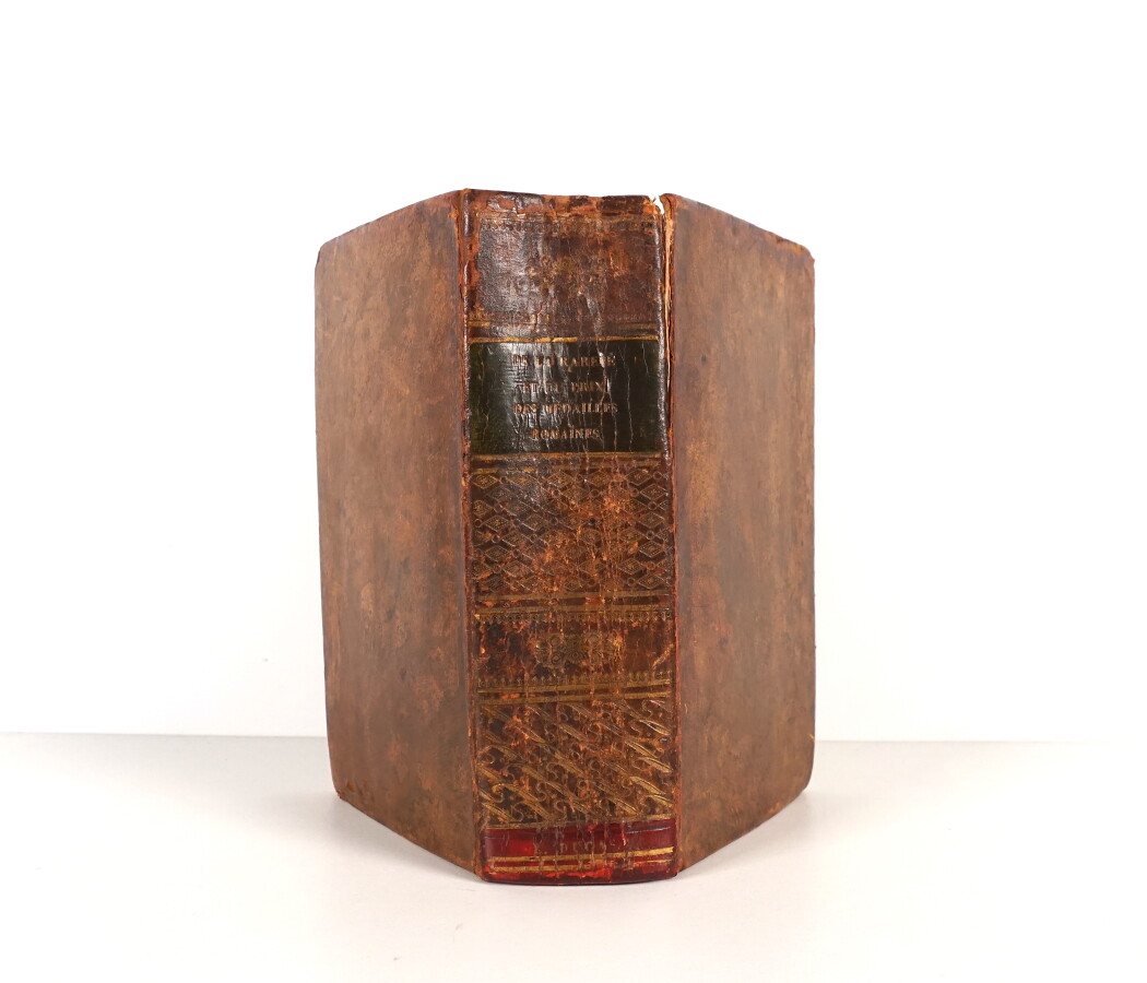 [NUMISMATIQUE] - MIONNET (T. E.) - De la rareté et du prix des médailles romaines, ou recueil contenant les types rares et inédits des médailles d'or, d'argent et de bronze frappées pendant la durée de la République et de l'Empire Romain. Seconde édition revue, corrigée et augmentée - Paris ; Chez l'auteur, de Bure, 1827 - 2 tomes en 1 fort volume In-8° - Odeur intérieure de tabac froid, des rousseurs éparses, parfois prononcées, des feuillets jaunis, des annotations manuscrites marginales - 39 planches gravées hors texte et des vignettes gravées rapportées - Reliure de l'époque veau havane marbré (3 coins usés, 1er mors partiellement fendu) - Dos lisse orné (petits accidents aux coiffes et frottements) avec ex-libris doré en son bas : L. Ducas - Pièce de titre maroquin noir - Cachet humide ex-libris au 1er contre plat : Fleury Jacquets à Rochecardon près Lyon - Tranches jaunes.