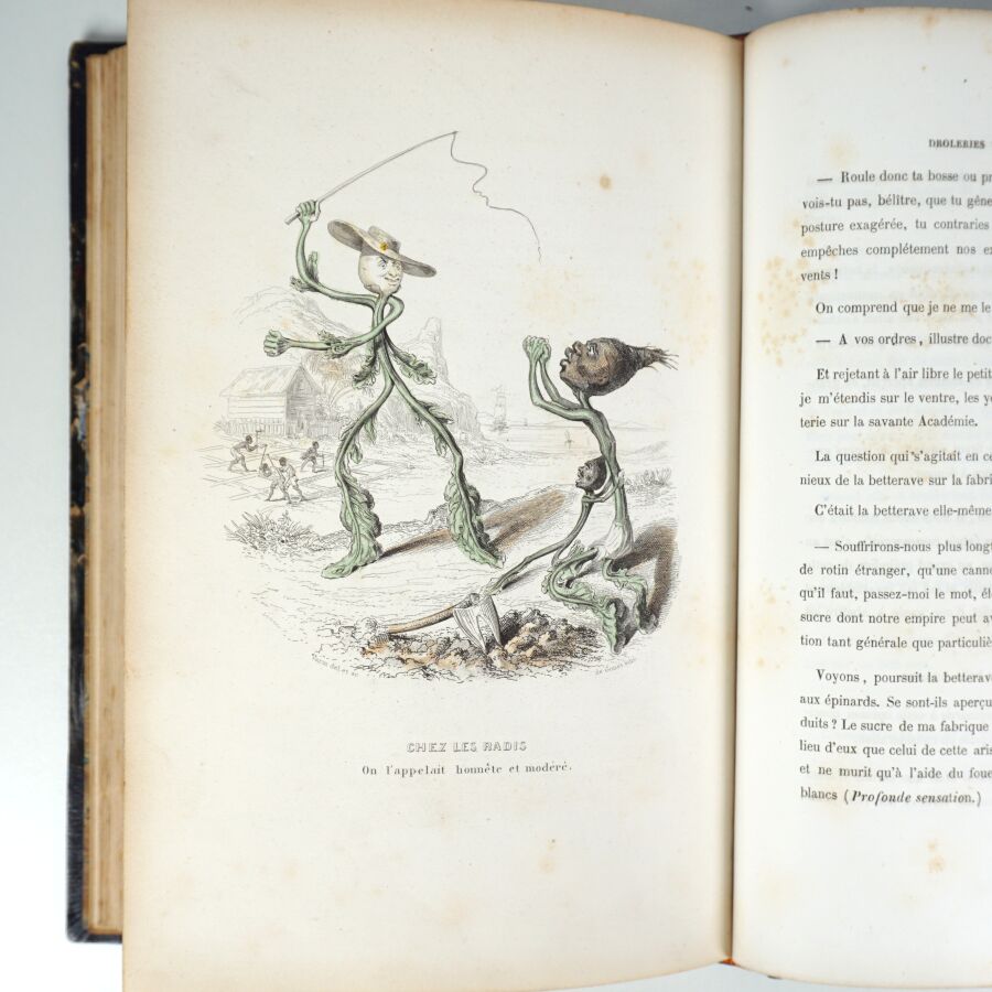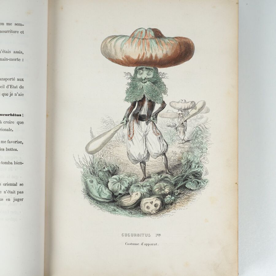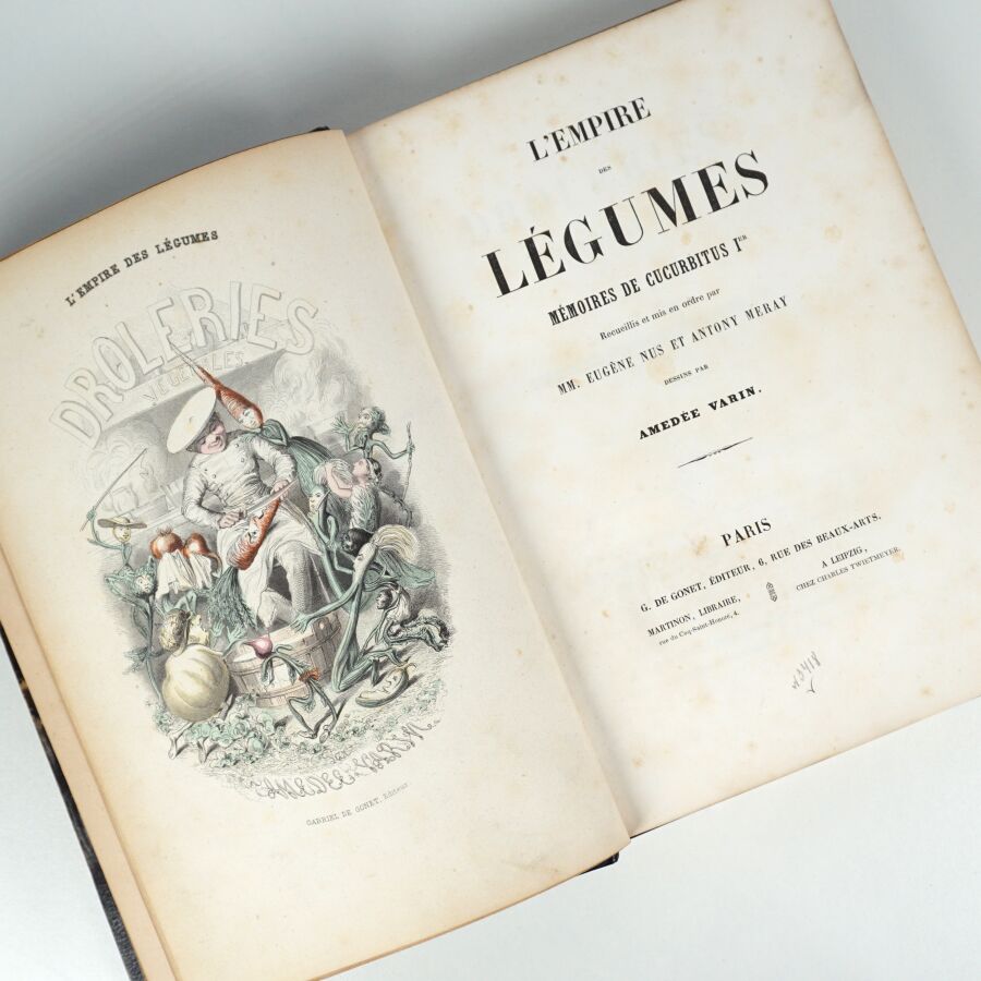 NUS (Eugène) & MÉRAY (Antony). Drôleries végétales. L'Empire des Légumes. Mémoires de Cucurbitus Ier. Paris, G. de Gonet, éditeur, Martinon, libraire, Leipzig chez Charles Twietmeyer, sd. Grand in-8, demi-maroquin long grain bleu foncé à coins, dos lisse finement orné, titre doré, filet doré sur les plats, non rogné (Canape).