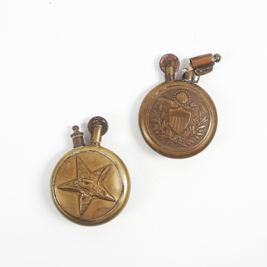 OBJETS DE TRANCHEE - TRAVAUX DE POILUS - Ensemble comprenant : 2 BRIQUETS, CENDRIER en verre à décor d'un poilu, QUART en alu aux initiales " RY " marqué " Souvenir 1914-17 ", COUPE-PAPIER marqué " Souvenir " et DOUILLE D'OBUS DE 75mm à décor gravé et marqué " LA MIETTE 1917 ", BE.
