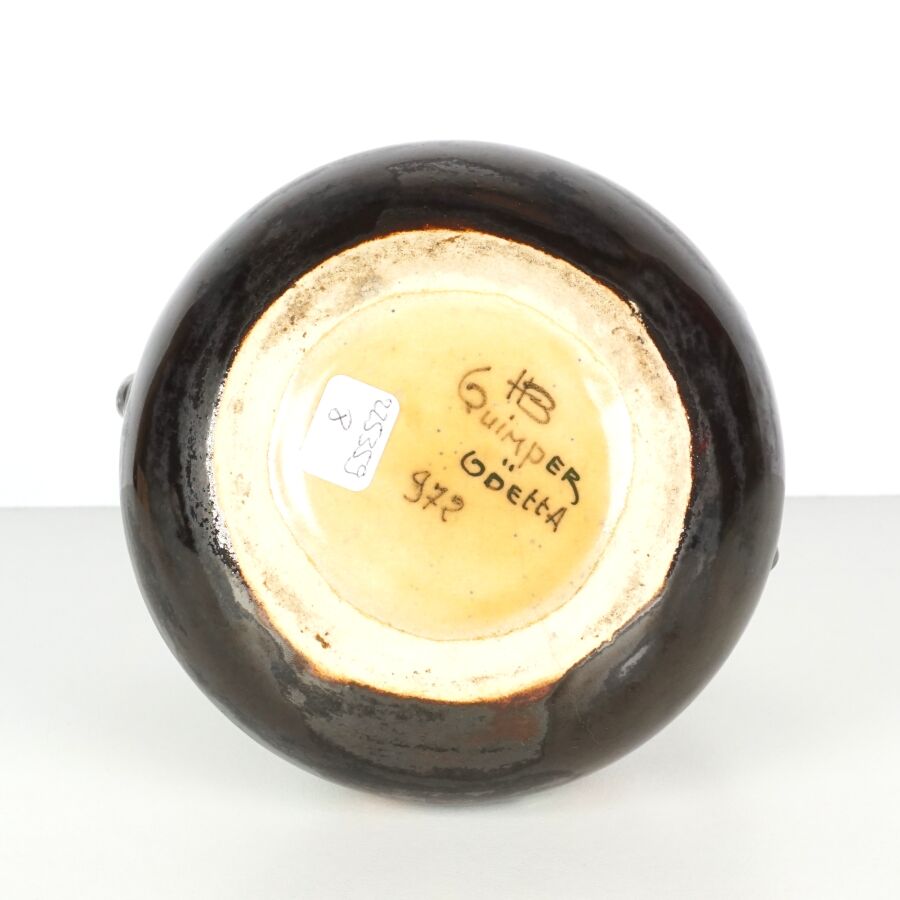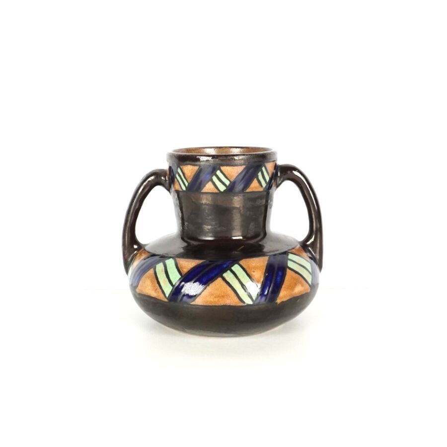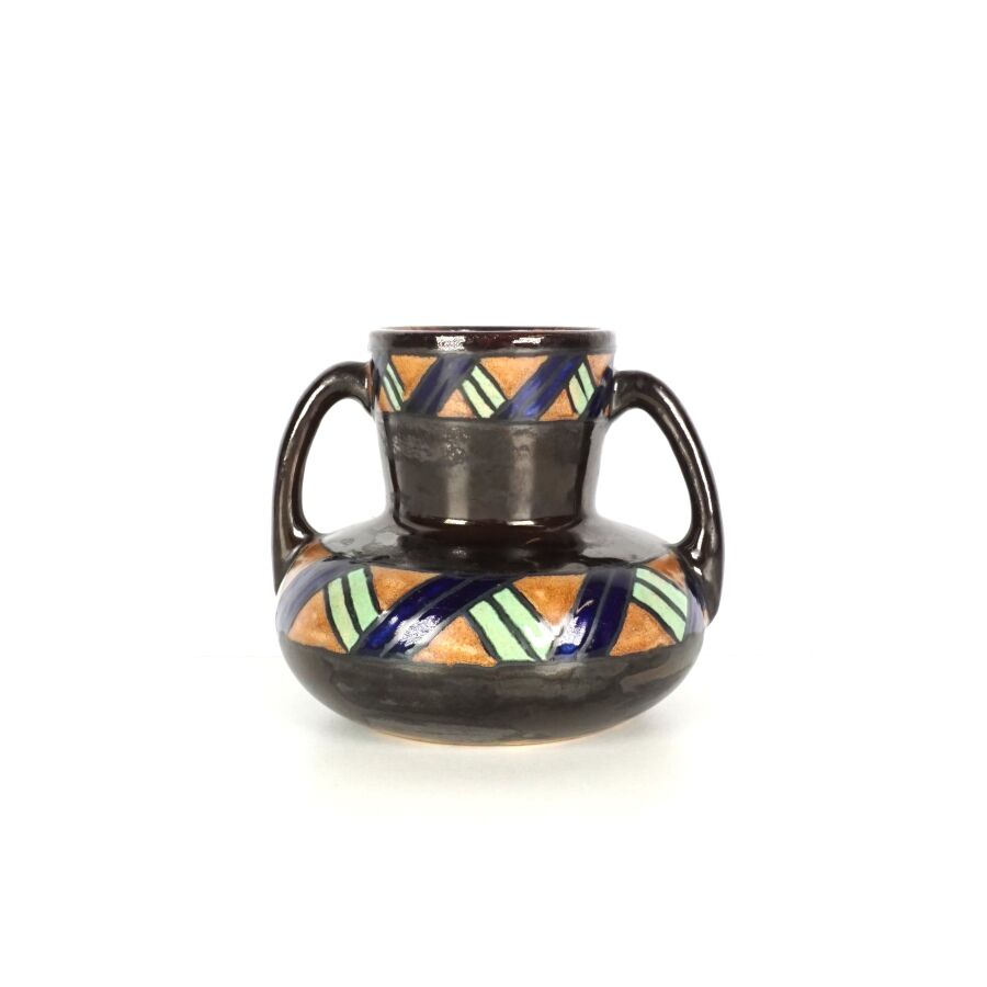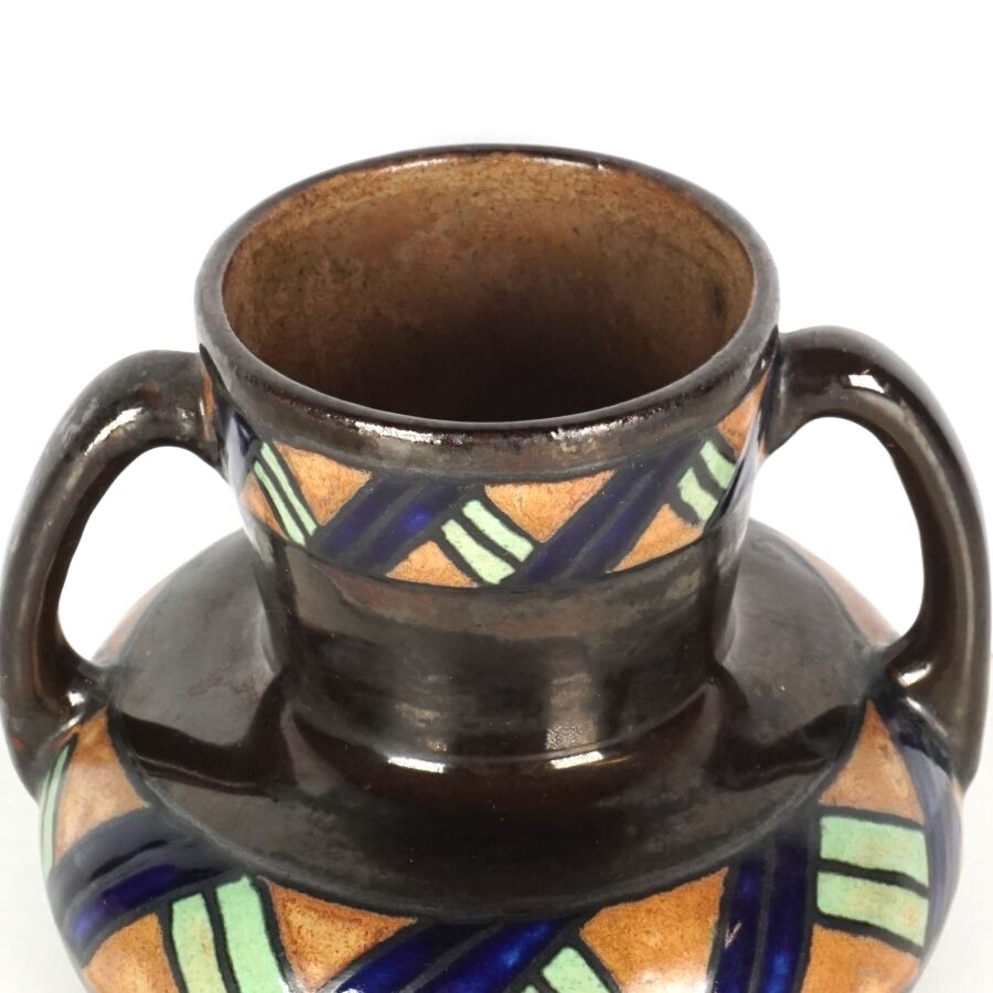 ODETTA - HB QUIMPER : Vase de forme aplatie à deux anses en grès émaillé polychrome à décor d'une frise ornée d'un ruban, signé et numéroté 972 sous la base, H. 14 cm (léger fêle de fond).