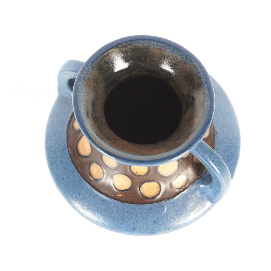 ODETTA - HB QUIMPER : Vase en grès émaillée à décor de pastilles au col ocre sur fond bleu et marron, marqué dessous "HB Quimper Odetta - 52 - 1289", H. 20 cm.