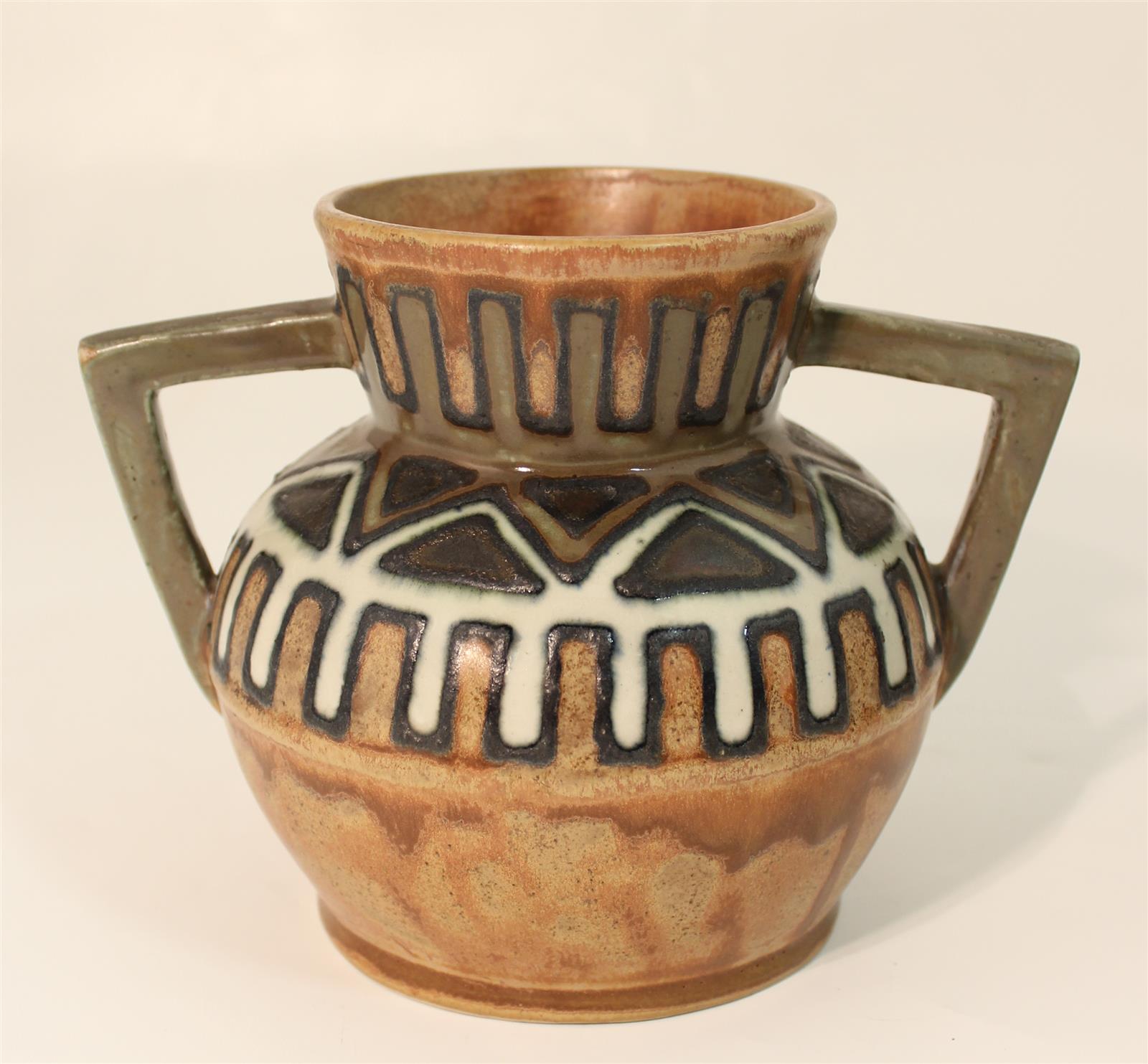 ODETTA - HB QUIMPER : Vase pansu à deux anses, décor géométrique gris bleu sur fond brun et gros tubé sur le col, signé et numéroté 165-1056 au-dessous, H. 15 cm
