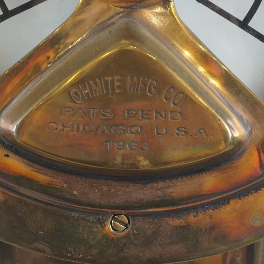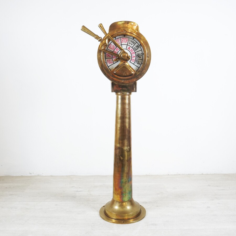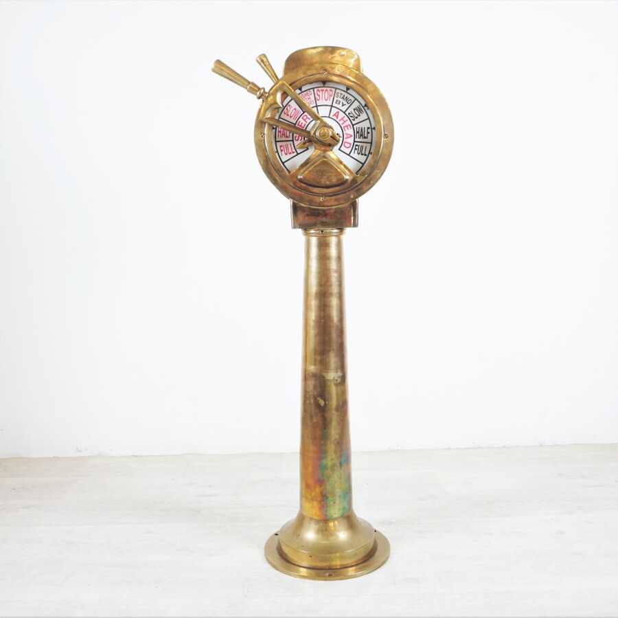 OHMITE - CHICAGO : Chadburn ou donneur d'ordre, laiton poli, cadran à fond blanc, porte des inscriptions sur le laiton "Ohmite MFG. Co, Pads Pend, Chicago US 1963", H. 100 cm.