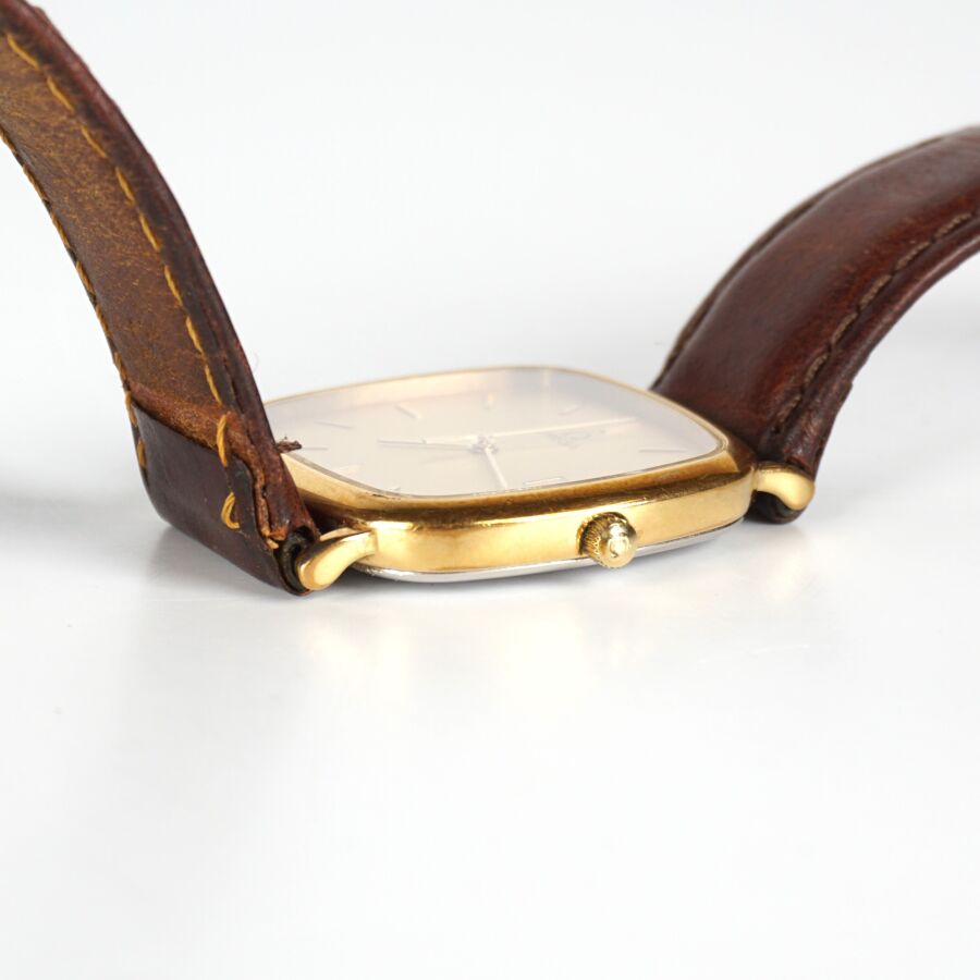 OMEGA : Montre bracelet, boîtier en métal doré à bord arrondi, cadran rainuré doré et signé, index appliqués pour les heures, guichet dateur à 3H, fond à clip marqué "Deville", bracelet en cuir marron et boucle ardillon (rapportés), circa 1980, mouvement à quartz, Dim. Boîtier : 3 x 3 cm (petites usures d'usage).
