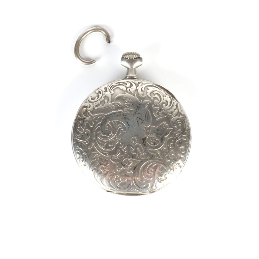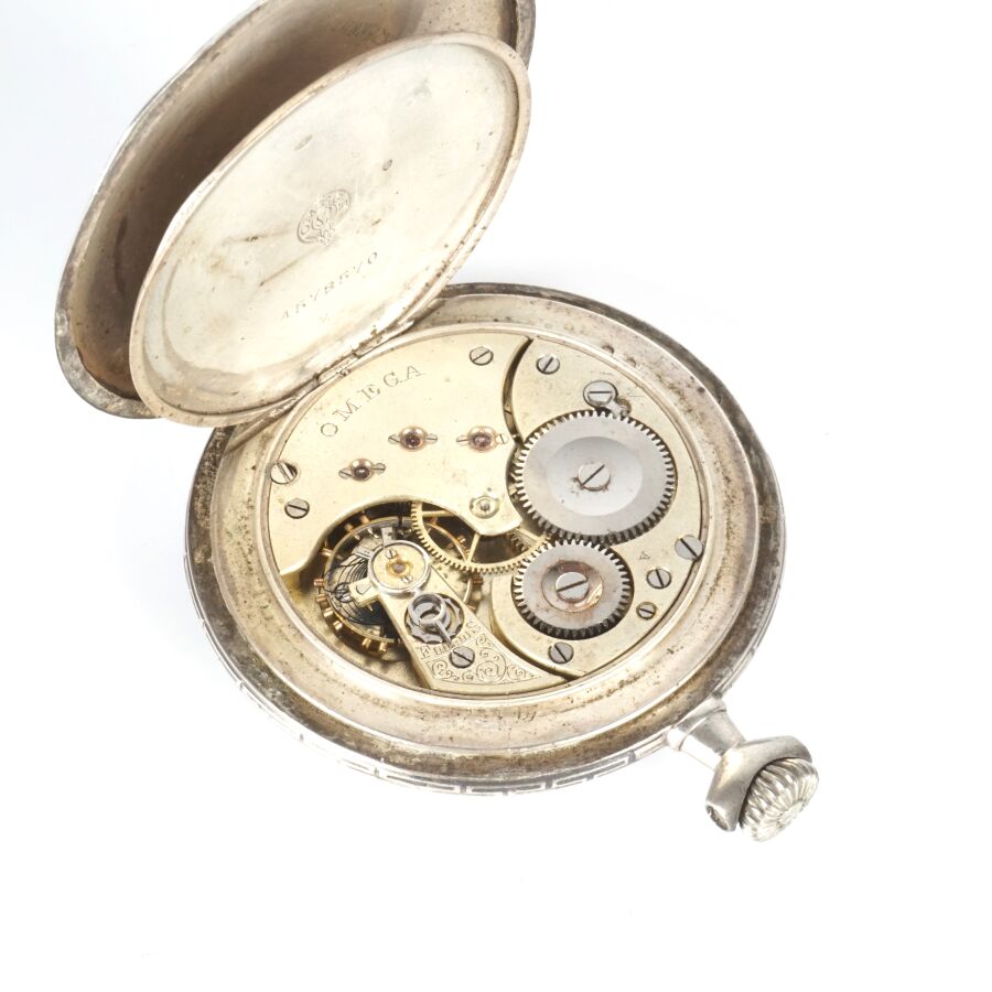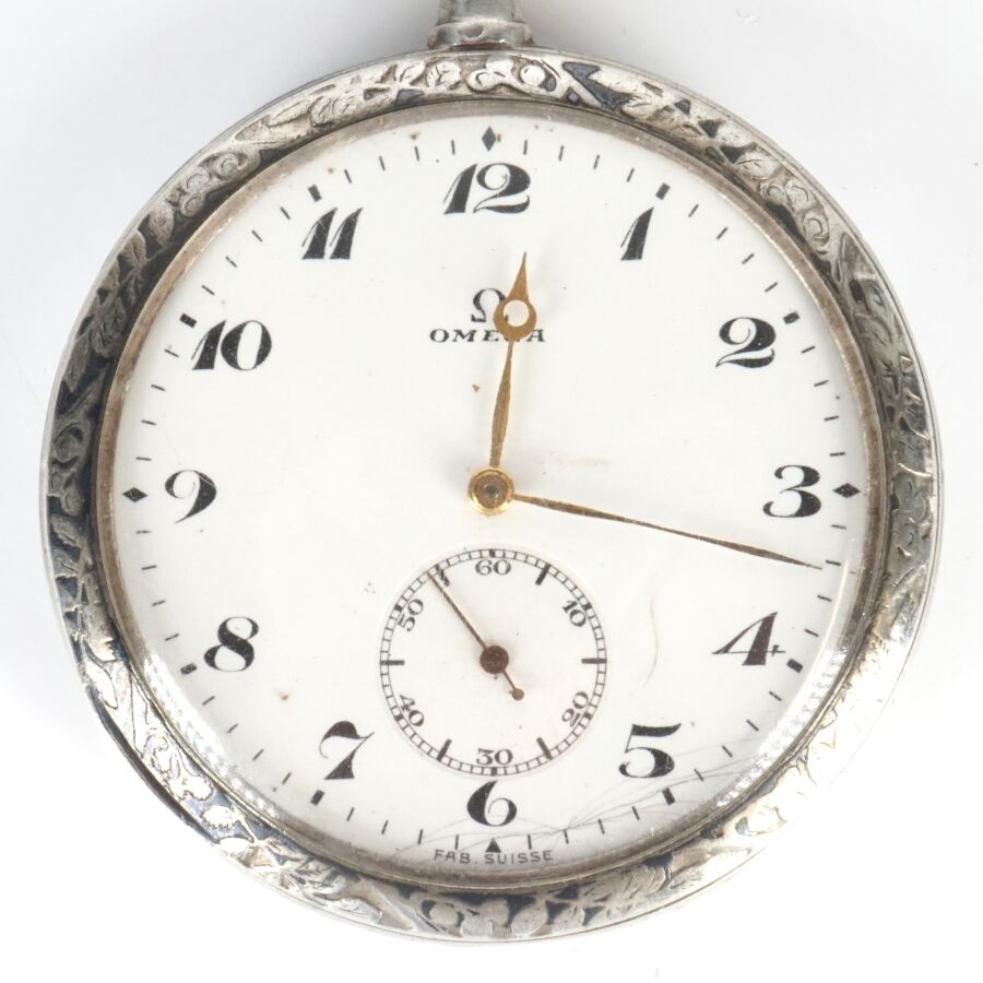 OMEGA : Montre de poche en argent (800/oo), fond émaillé blanc signé,, chiffres arabes pour les heures, cadran des secondes à 6H, alentour et revers du boîtier à décor en repoussé d'un dragon parmi des feuillages stylisés, Diam. 5.1 cm. Poids brut : 80 g environ (bélière à refixer).