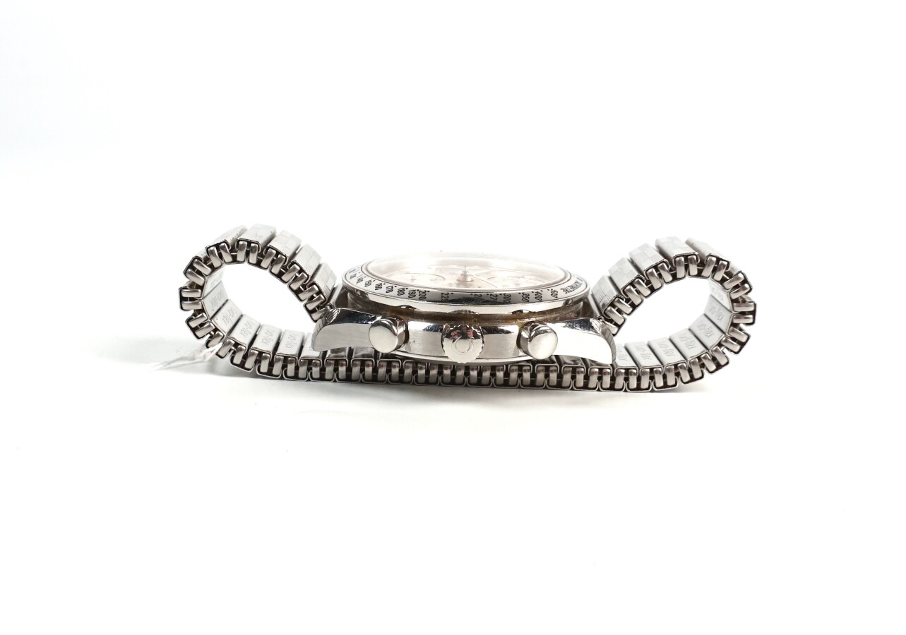 OMEGA : Montre d'homme modèle "Speedmaster Automatic", boitier rond en acier, 40 mm, numéroté 56431552, cadran fond champagne à index, 3 compteurs, dateur à 3h, lunette tachymétrique, mouvement mécanique à remontage automatique, bracelet élastique en métal rapporté.