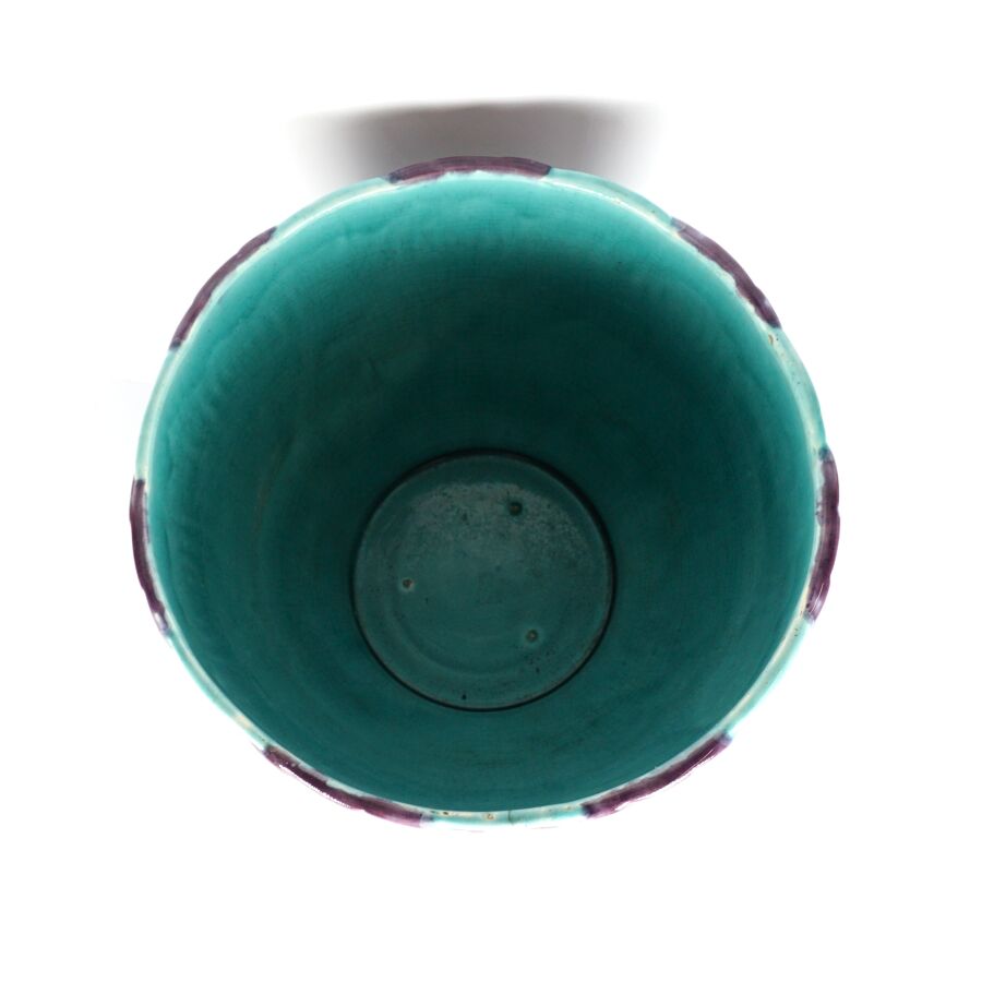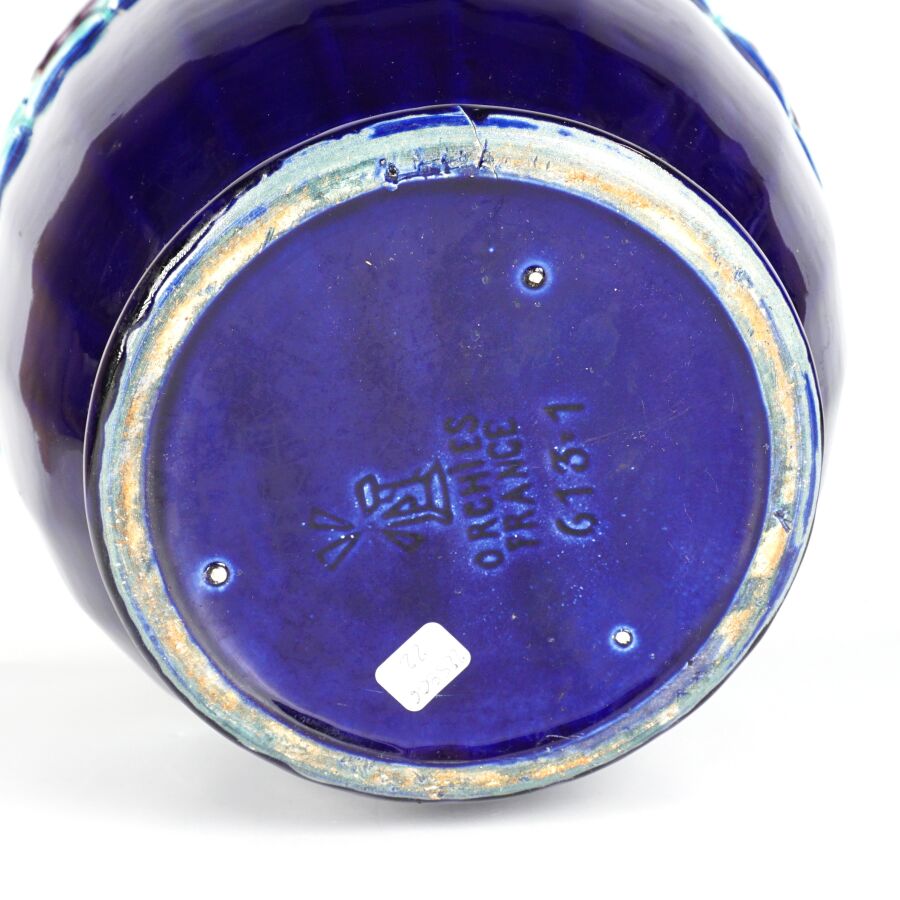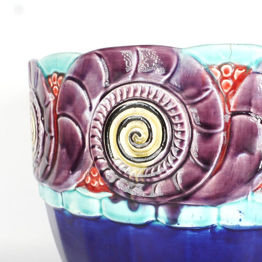 ORCHIES : Grand cache-pot en faïence émaillée polychrome à fond bleu orné d'une frise de nautiles, marqué au revers, H. 26 cm (fêles).