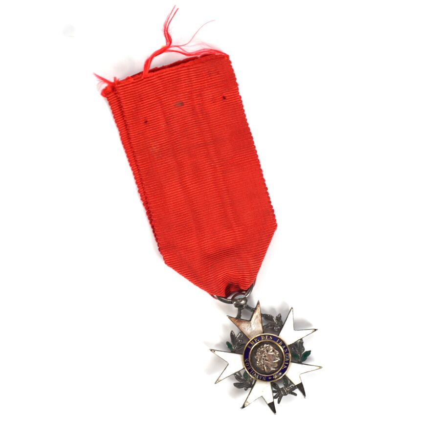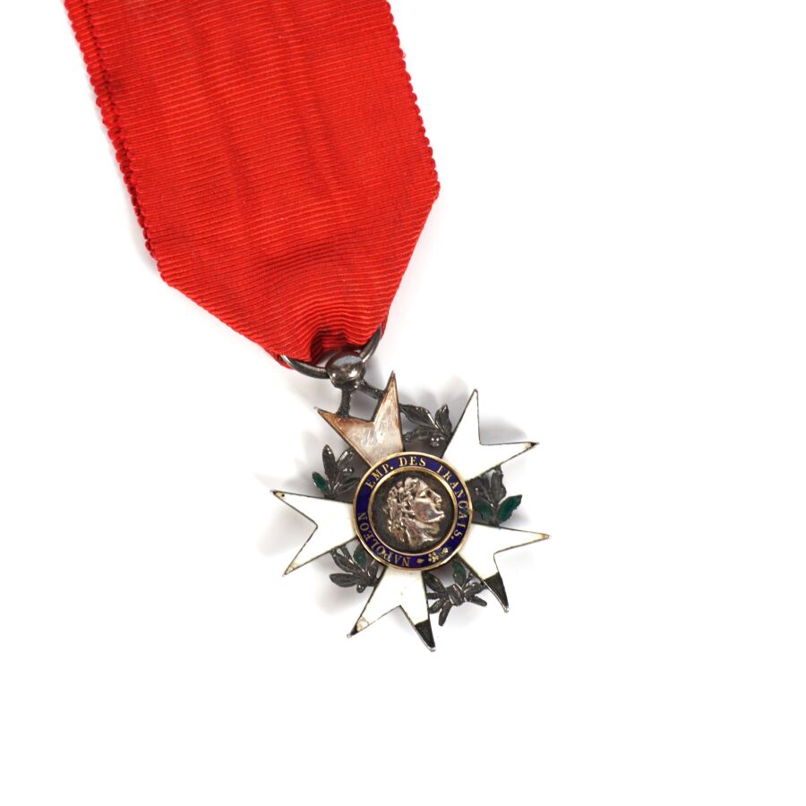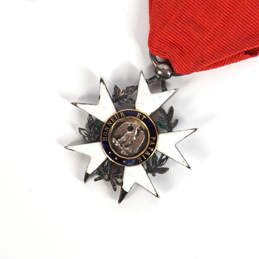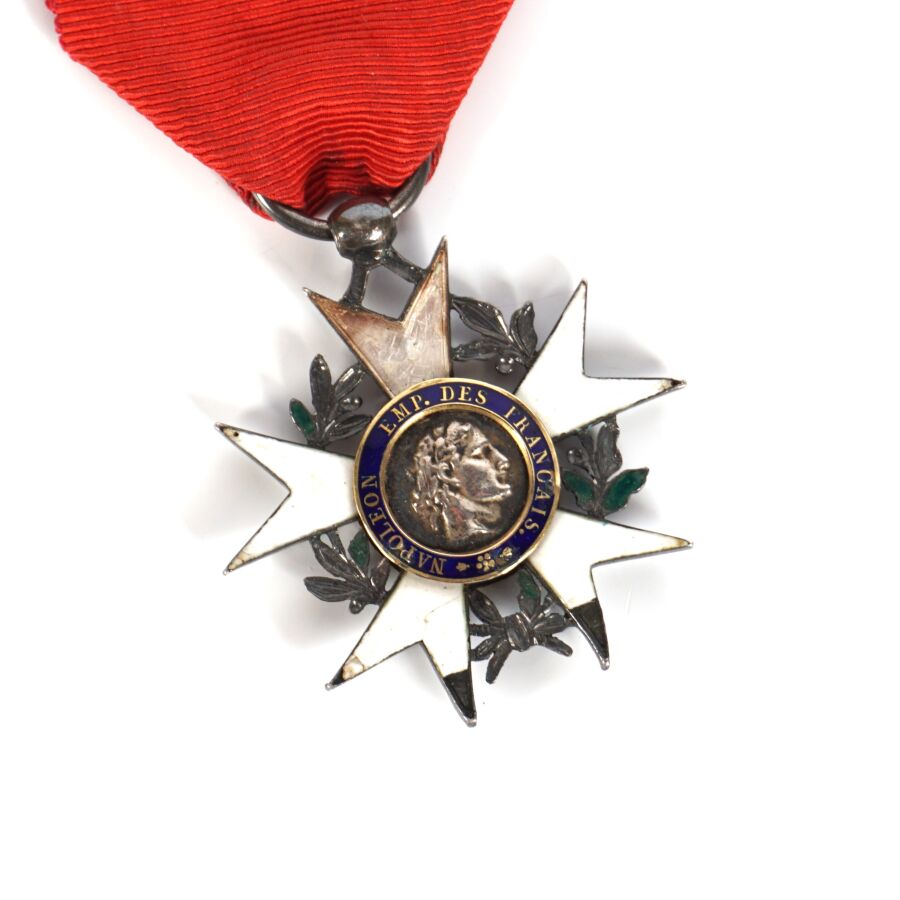 ORDRE DE LA LEGION D'HONNEUR (1802) - PREMIER EMPIRE (1804-1814) - AIGLE DU PREMIER TYPE (1804-1806), en argent ciselé et émail, centres en vermeil et or émaillés en deux parties, 37 x 39 mm, centre de l'avers à grosse tête sur fond rayonnant avec la légende " NAPOLEON EMP. DES FRANÇAIS ", celui du revers avec aigle tête tournée vers la gauche, traces de dorure entre les branches, importants éclats et manques à l'émail vert du feuillage et des branches, ruban conforme mais postérieur, DANS L'ETAT.