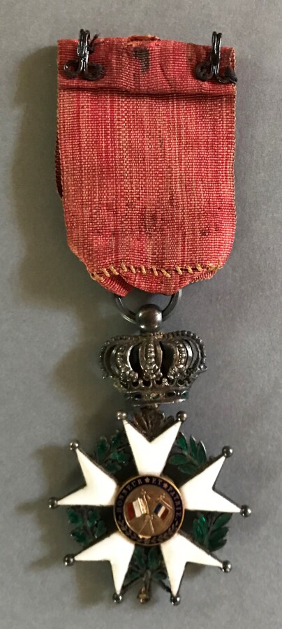 ORDRE DE LA LEGION D'HONNEUR (1902) - MONARCHIE DE JUILLET (1830-1848) - ETOILE DE CHEVALIER, en argent ciselé en émaillé, centres émaillés en or, poinçon tête de sanglier, 44,5 x 65 mm, éclat à l'émail blanc dans l'épaisseur d'une pointe d'une branche de l'avers ainsi qu'à l'émail circulaire du centre du revers, léger enfoncement à la couronne, ruban de 39 mm de large, ABE.
