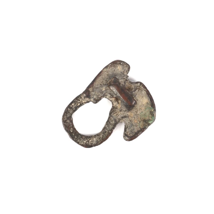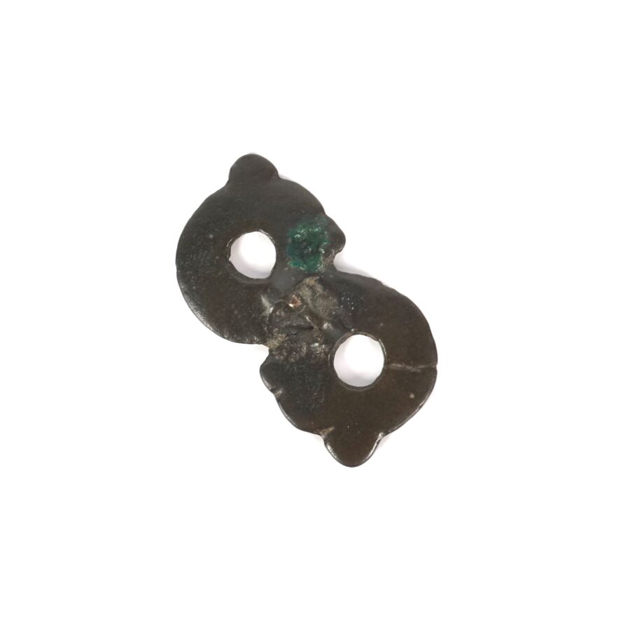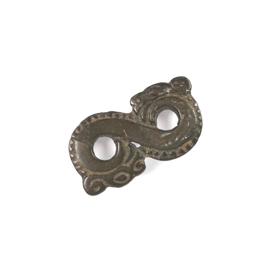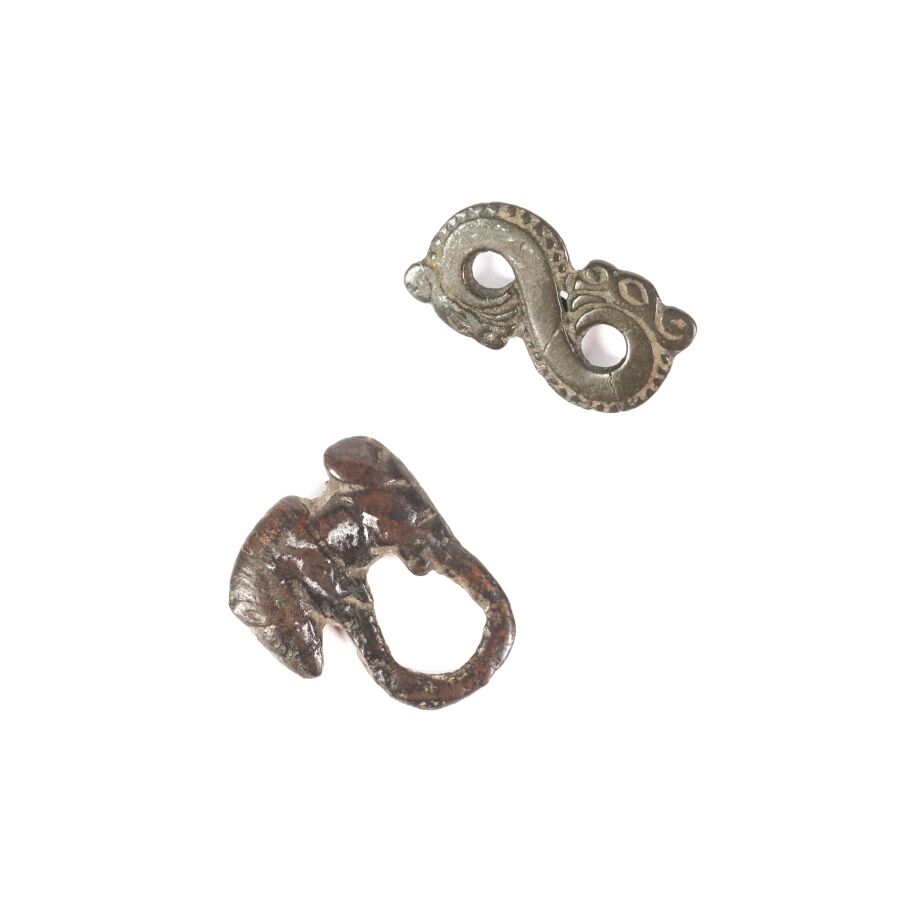 Ornement de ceintures en bronze à patine brune, l'un figurant un dragon enroulé, l'autre à motif d'un cheval, art des steppes - ordos, circa IIIe-Ie siècles avant notre ère, L. 3.5 cm et 3.8 cm.