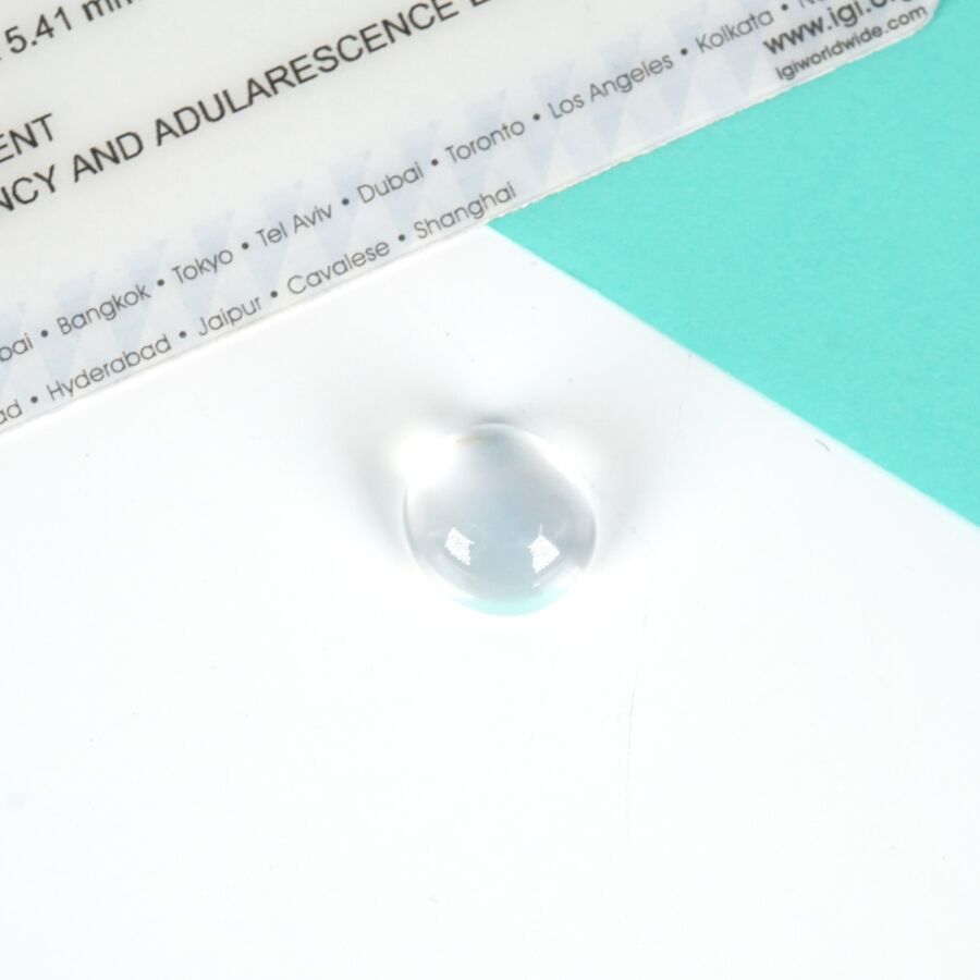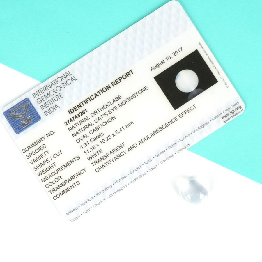 Orthoclase sur papier, taille ovale cabochon, blanc, calibrant 4.34 ct, Dim. 11.1 x 10.2 x 5.4 mm, présenté avec son certificat de l'International Gemological Institute India en date du 10 août 2017.