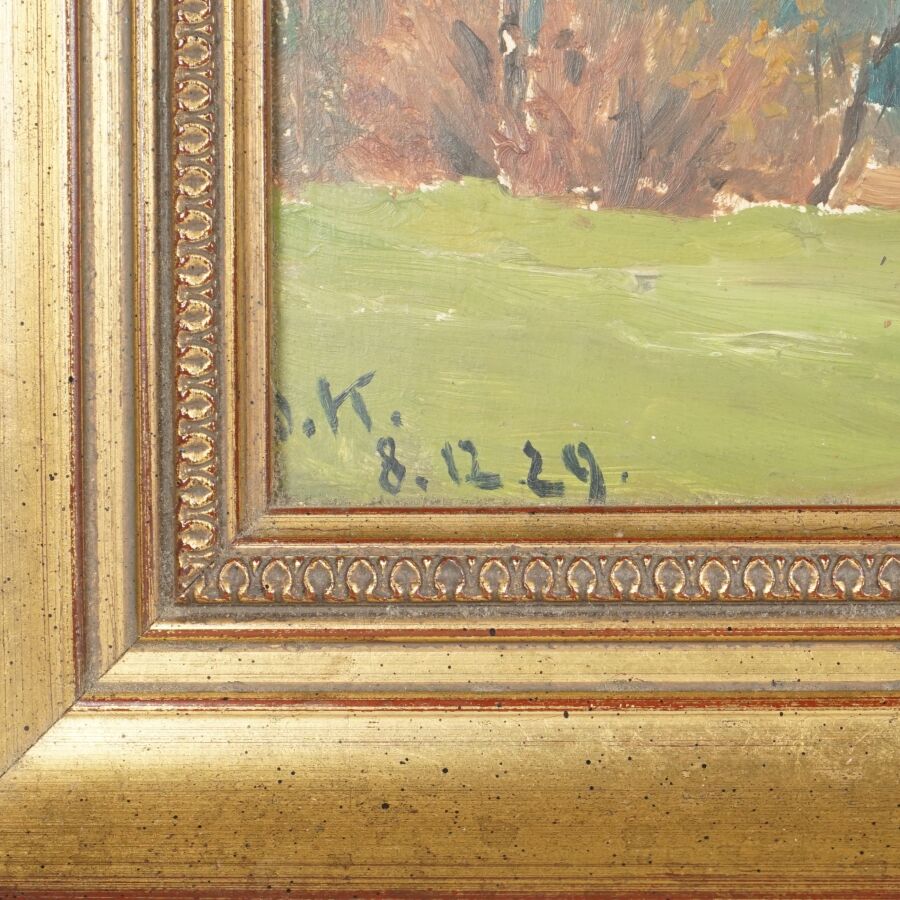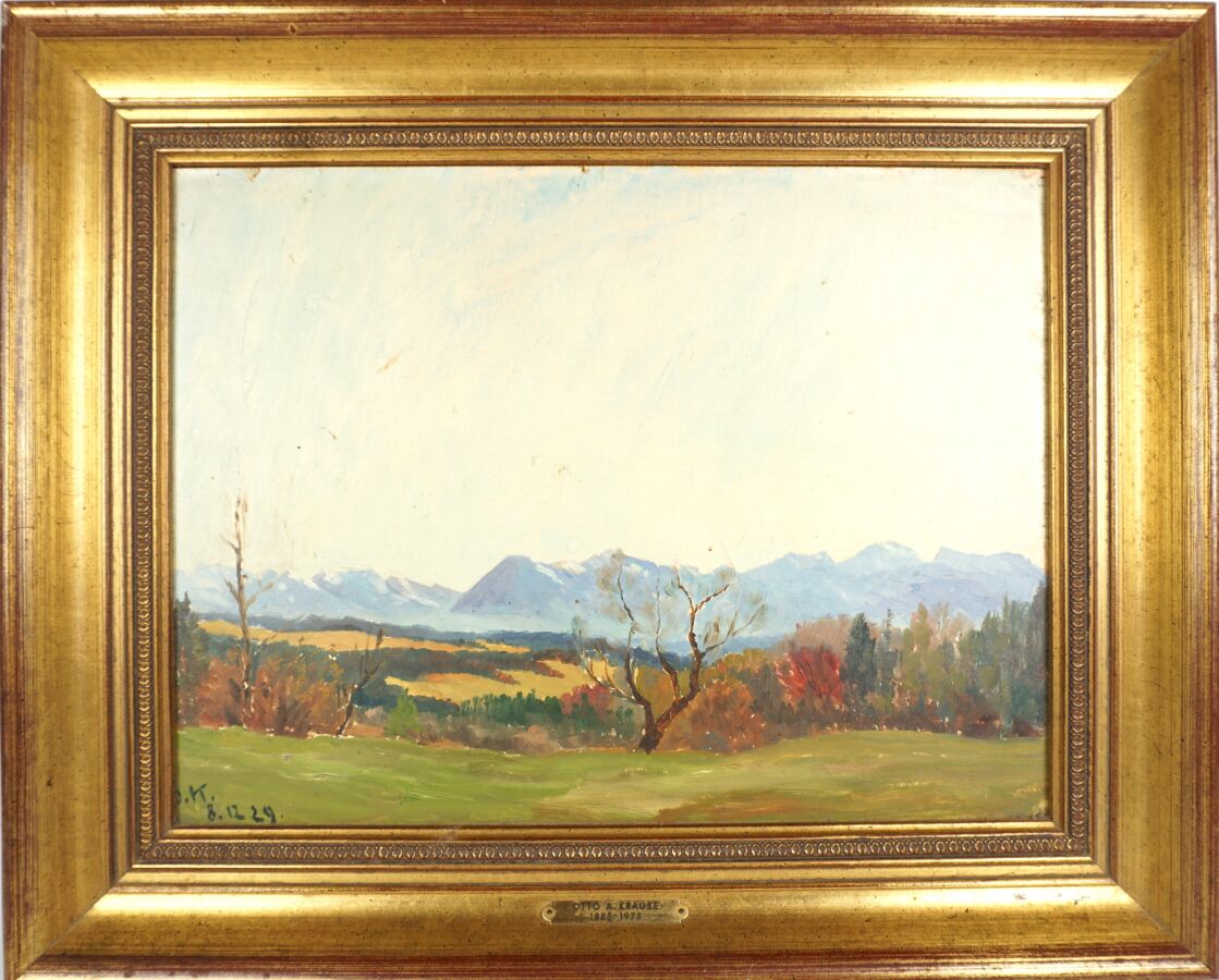 Otto A. KRAUSE (1885-1975), "Paysage" 8.12.29, huile sur carton signée et datée en bas à gauche, 31 x 41 cm (légers manques).