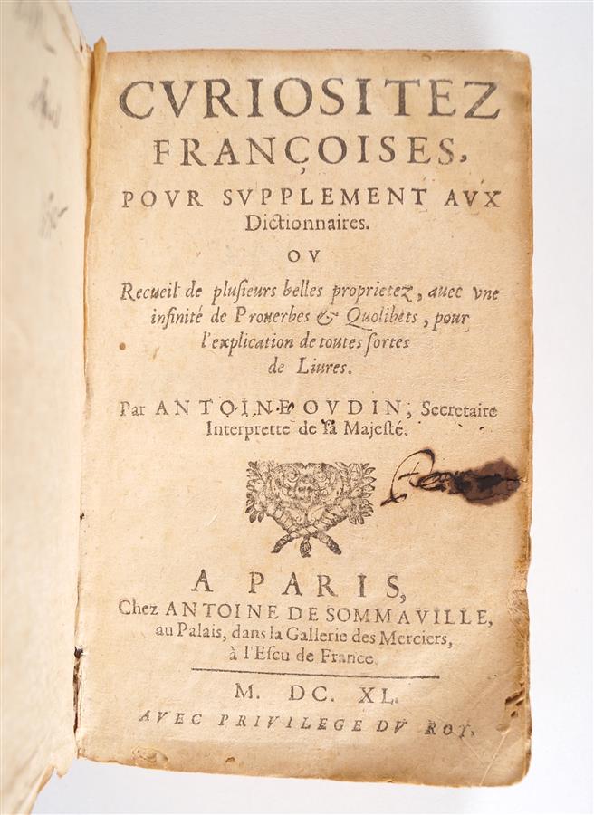 OUDIN (Antoine) - Curiositez françoises, pour Supplément aux dictionnaires. Ou Recueil de plusieurs belles proprietez, avec une infinité de proverbes & quolibets, pour l'explication de toutes sortes de livres - Paris ; Antoine de Sommaville, 1640 - 1 volume In-8° de 8 pages non chiffrées, 608 pages (sur 615, les 7 dernières pages sont manquantes) - 1ère garde manquante, des auréoles éparses, de petits manques de papier angulaires en début d'ouvrage - Reliure de l'époque vélin souple (quelque peu sali, 2 coins et 1 coupe usés) - Dos lisse titré à l'encre (1 fente en partie supérieure) - Ex-libris manuscrit ancien au titre ayant entraîné 1 tache d'encre noire aux 1ers feuillets - Édition originale de ce recueil de proverbes, de maximes morales et aussi d'expressions populaires aujourd'hui oubliées.