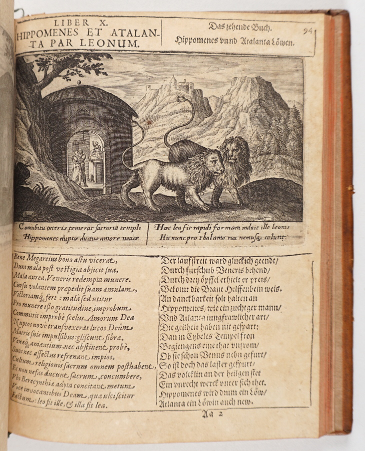 [OVIDE] - CRISPIN DE PASSE L'ANCIEN - SALSMANN (Wilhelm) P. Ouid Nasonis XV Metamorphoseon libroru[m] figurae Responsibility elegantissime a Cr[i]spiano Passaeo laminis aeneis incisae ; quibus subiuncta sunt epigra[m]mata Latine ac Germanice conscripta, fabularum omnium summam breuiter ac erudite comprehendentia, autore Guilhelmo Salsmanno [...] - [Cologne] : Prostant apnd [sic] Crisp. Passaeum chalcographum Coloniense[m] et Joannem Jansonium typographum Arnhemiensem, anno [1607, date du chronogramme aVrea MeDIoCrItas] - 1 volume petit In-4° - [4] pages, [1], 130 feuillets (les feuillets 44 et 116 manquants) - Feuillets brunis, les 2 premiers feuillets restaurés, 1 petite déchirure latérale sans perte au 3ème feuillet non chiffré et au feuillet 42, 1 déchirure latérale avec perte de marge au feuillet 32, feuillet 46 restauré, déchirure horizontale sans perte au feuillet 54, manque angulaire au feuillet 55, petit manque en bas des feuillets 82 à 85 et 97 à 99, auréoles aux feuillets 98 à 100, déchirure en bas du feuillet 86, petit manque angulaire au feuillet 132, contre plats, gardes et titre partiellement brunis - Titre gravé, et 131 gravures in texte dues à Crispin de Passe gravées par Jan Jansson, texte en latin et allemand par Wilhelm Salsmann - Caractères italiques et gothiques - Reliure XVIIIème siècle veau havane marbré (1ère charnière fendue, coupes frottées) - Filet aux coupes - Dos lisse orné de filets, de fleurs et de coqs dorés (de légers frottements et dédorures) - Pièce de tire maroquin noir - Tranches rouges - Ex-libris gravé et armorié : A. Brölemann au 1er contre plat.