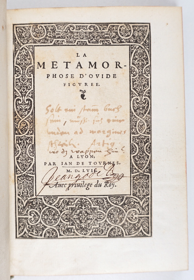 [OVIDE] - La métamorphose d'Ovide figurée - Lyon ; Jan [Jean] de Tournes, 1557 - 1 volume In-12° - Titre à encadrement contrecollé sur feuillet blanc (des annotations anciennes) - 1 feuillet de dédicace à Monsieur de la Rivoire, aumônier de Monsieur le Dauphin, puis [178] feuillets sur bois à encadrement, tirées des 2 côtés des feuillets, avec 1 huitain explicatif imprimé en italiques en-dessous de chaque planche, le tout dans des bordures arabesques ou allégoriques gravées sur bois - 43 planches joliment enluminées, parfois gommées, en coloris du XVII ou XVIIIème siècle, certaines coloriées aux gravures centrales, certaines aux gravures centrales ainsi qu'aux encadrements - Des pages avec annotations anciennes en latin à l'encre noire en marge de 23 pages - Titre remonté, quelques feuillets probablement lavés, quelques rares taches et rousseurs, trace de cachet de cire à l'angle supérieur de la 1ère page de dédicace, 1 angle restauré - Reliure XVIIIème siècle veau blond glacé - Plats encadrés d'1 triple filet doré - Dos lisse orné à la grotesque - Pièce de titre maroquin bordeaux avec date de 1557 - Tranches rouges - Ex-libris manuscrit ancien au titre (illisible) et ex-libris gravé et armorié : A. Brölemann au 1er contre plat - - Rare et bel exemplaire en 1ère édition.