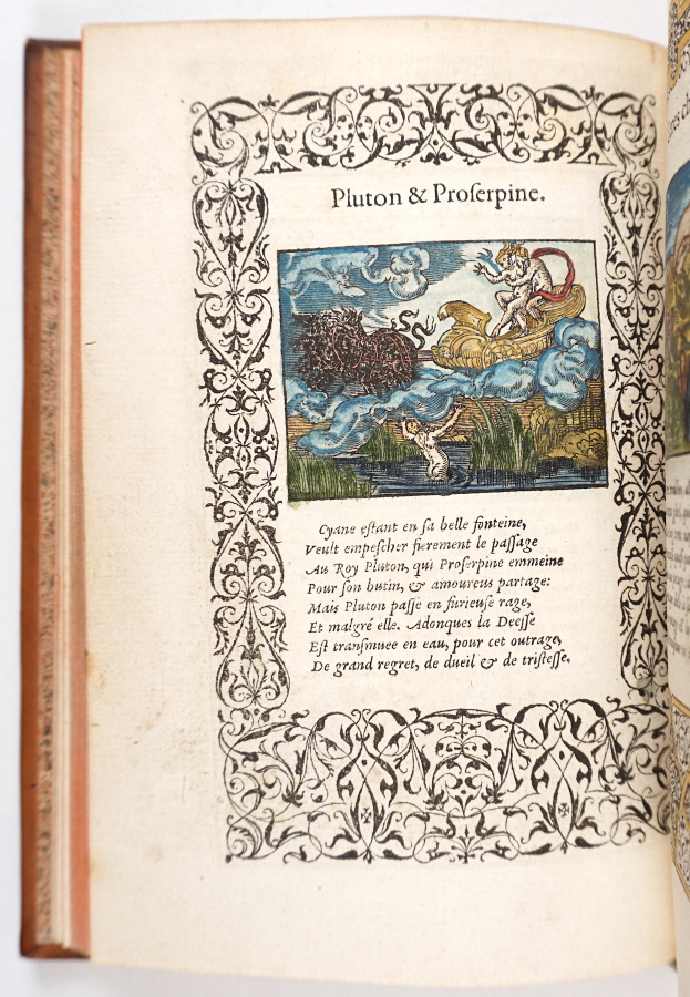Cette traduction en huitains des 64 premières " Métamorphoses " serait attribuée soit à Barthélémy Aneau, soit à Charles Fontaine, soit à Jean de Vauzelles, la jolie suite de bois gravés est généralement attribuée à Bernard Salomon, dit Petit-Bertrand, peintre, dessinateur et graveur lyonnais - Jean de Tournes, imprimeur des plus compétents et importants de Lyon à la fin du XVIème siècle publia Dante et Pétrarque. Ses livres se caractérisent par 1 mise en page élégante et des caractères bien lisibles.