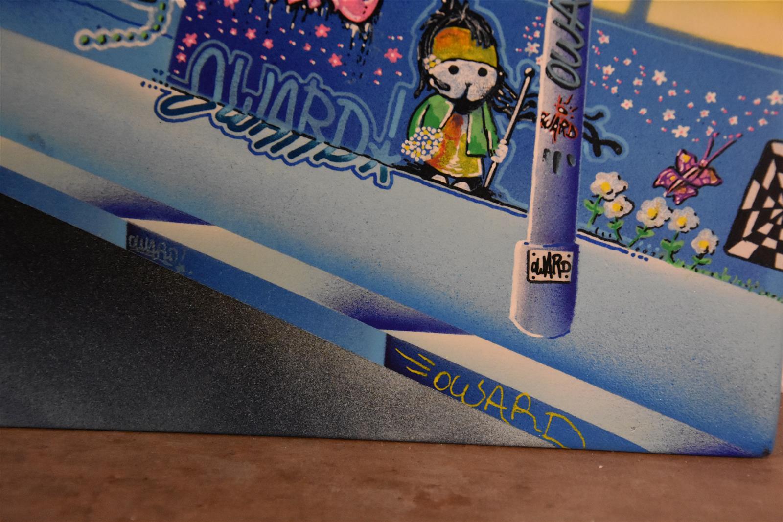 OWARD (XXe), "Ville futuriste" 2011, peinture à la bombe et acrylique sur panneau, signée et datée au dos, 55 x 110 cm.