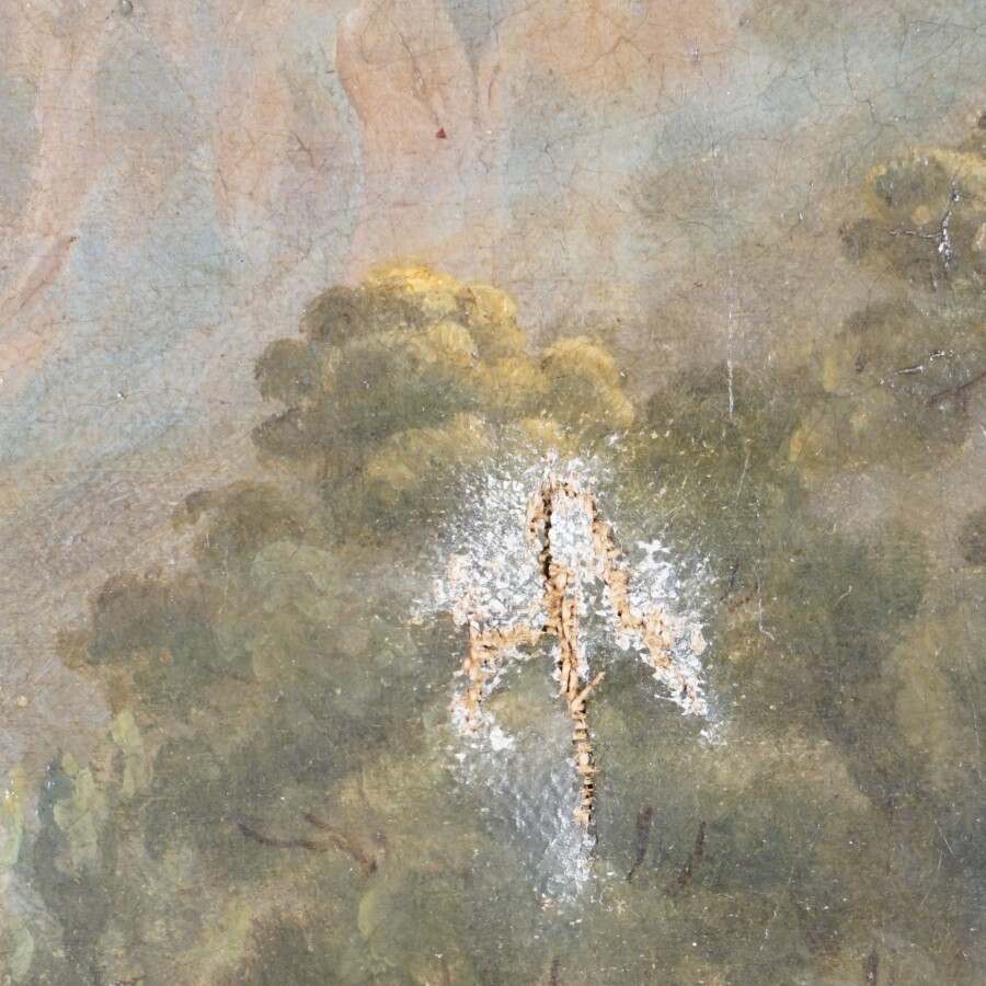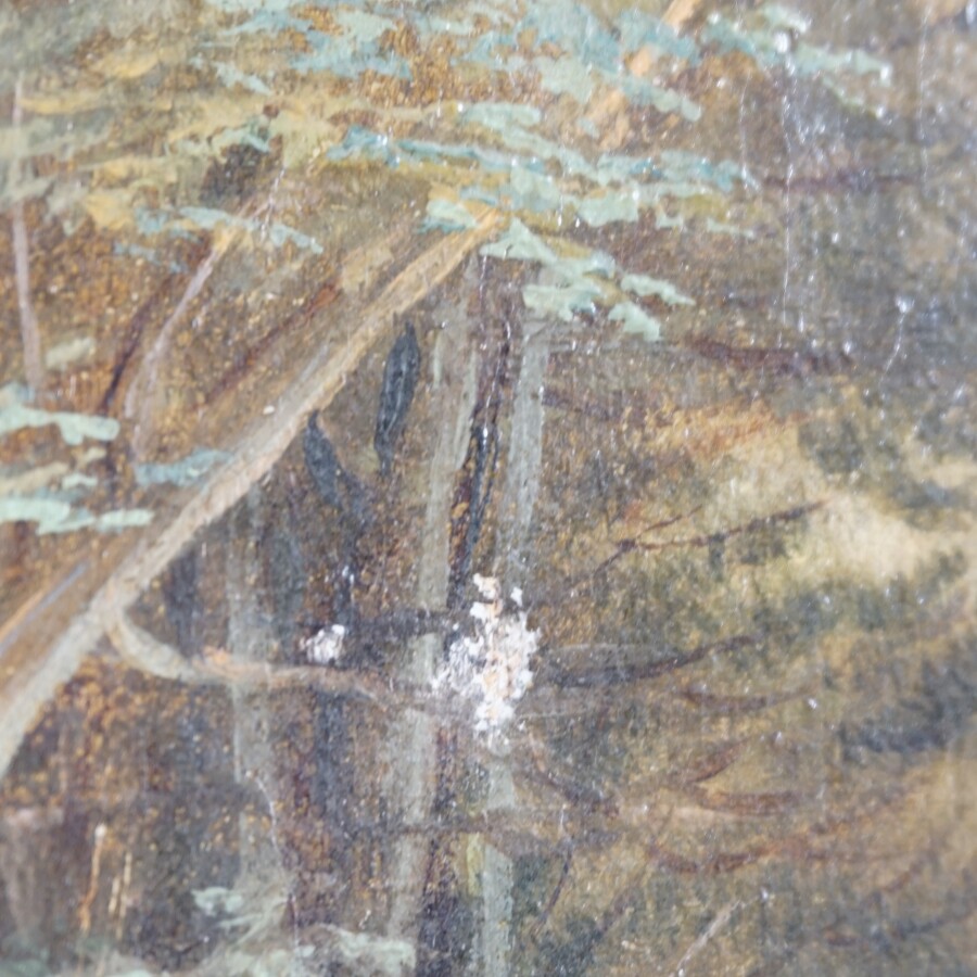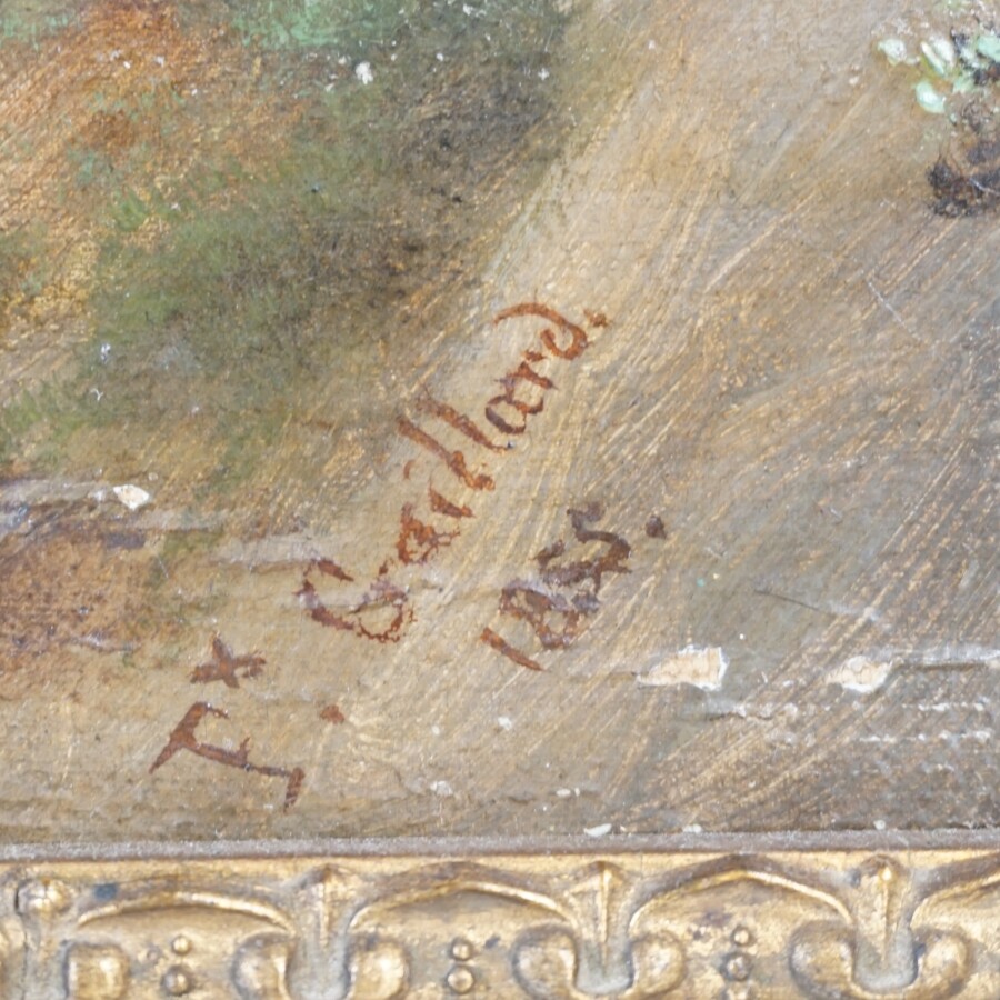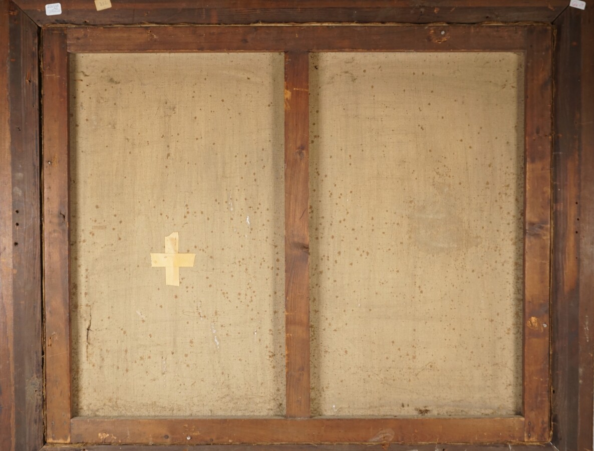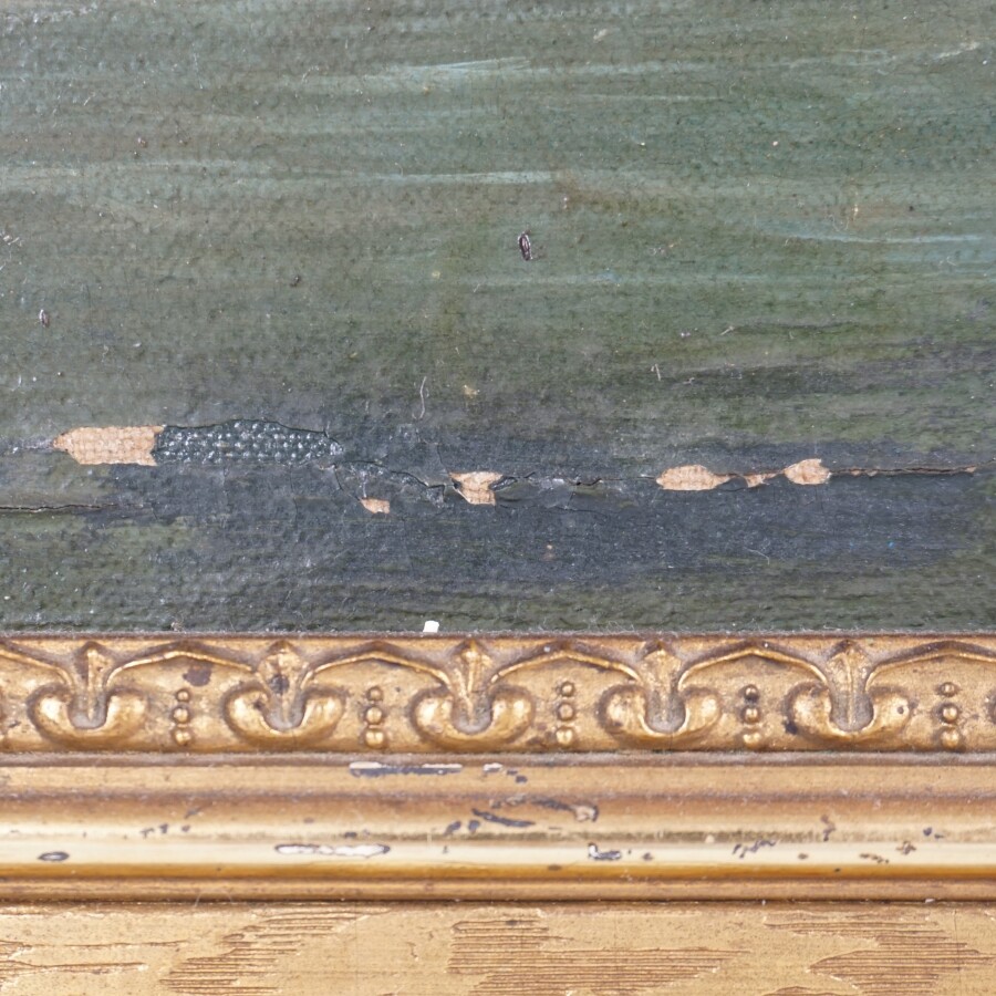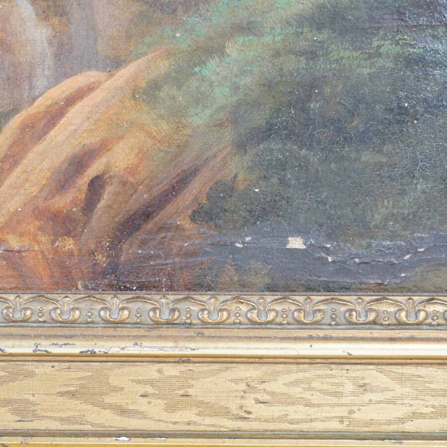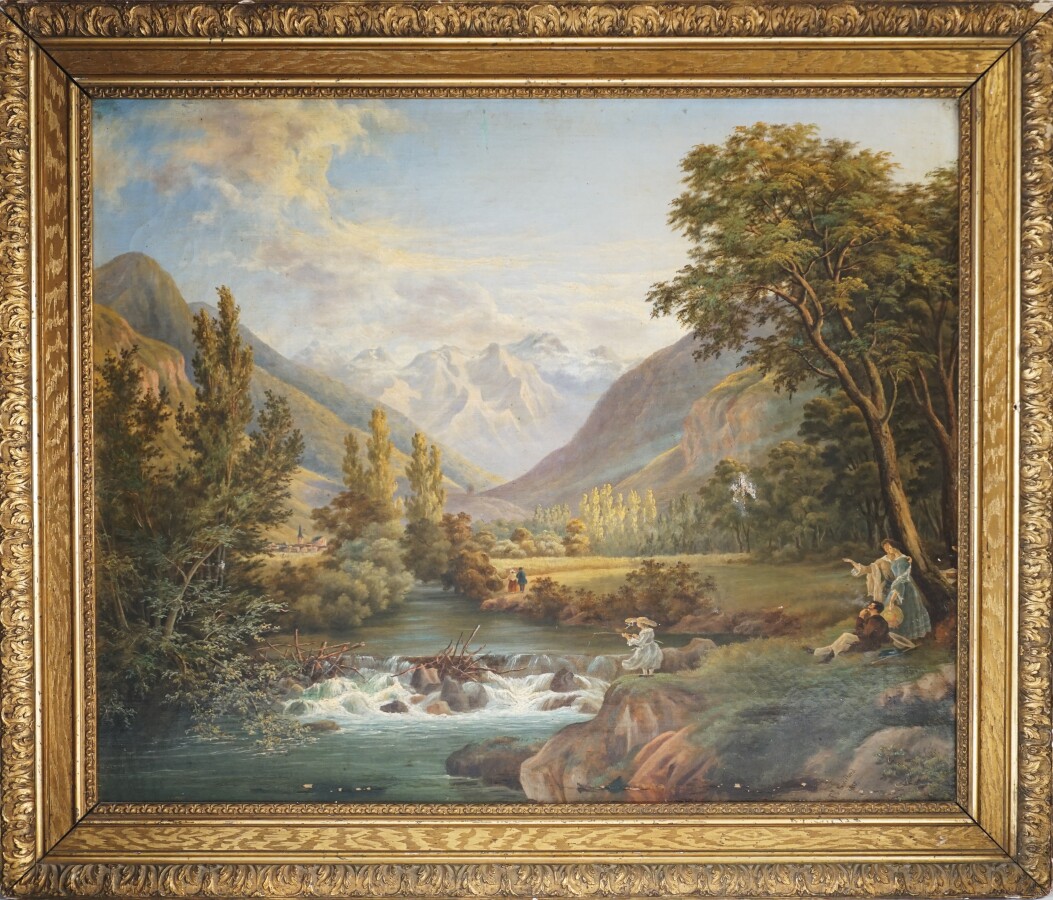 P. GAILLARD (XIXe), "Scène de pêche près du déversoir" 1855, huile sur toile signée et datée en bas à droite, 60 x 73 cm (accidents et peinture écaillée).