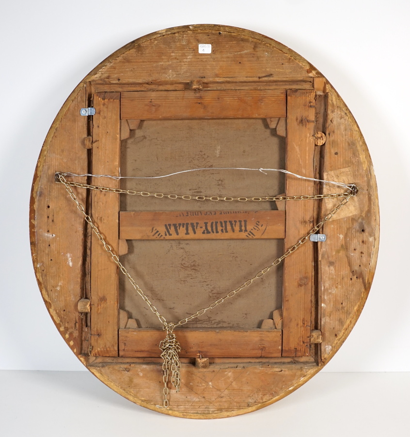 P. LEBRUN (XIXe), "Portrait de femme au roses" 1881, huile sur toile en médaillon, signée et datée en bas à droite, D. 46 x 38 cm.