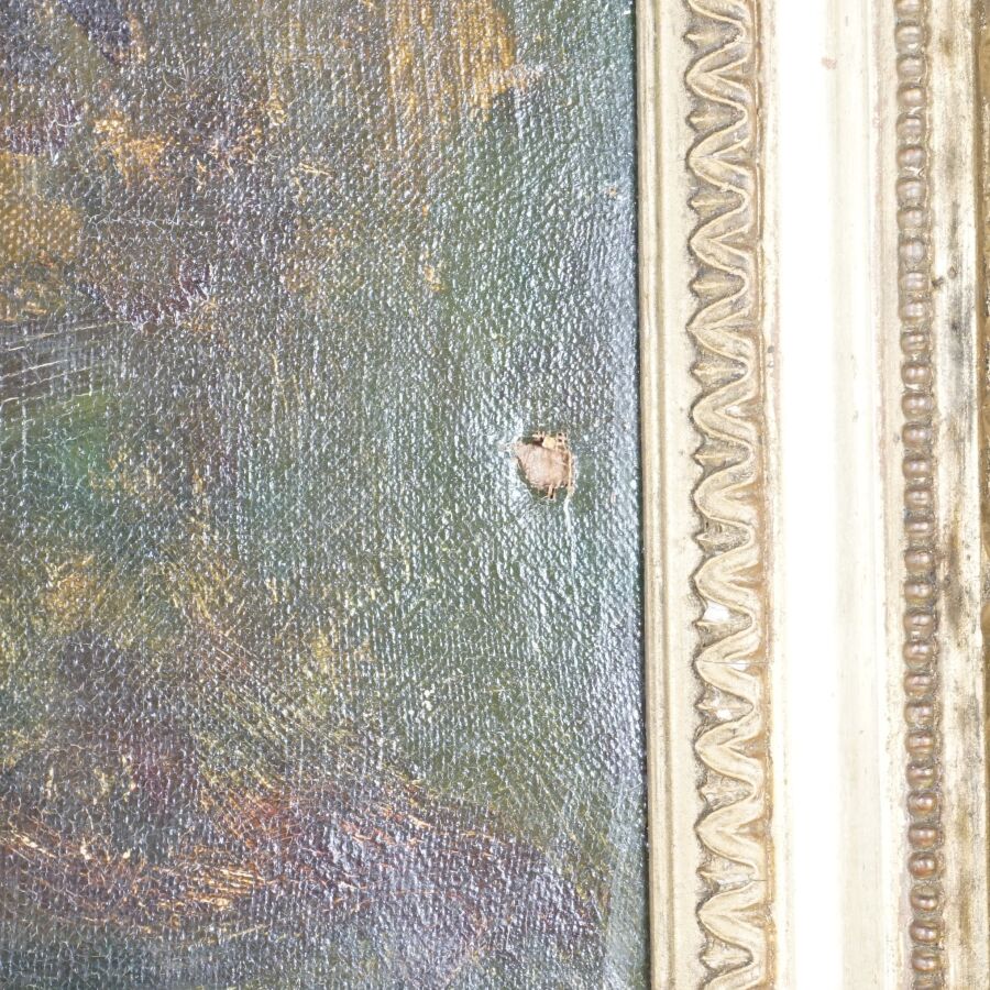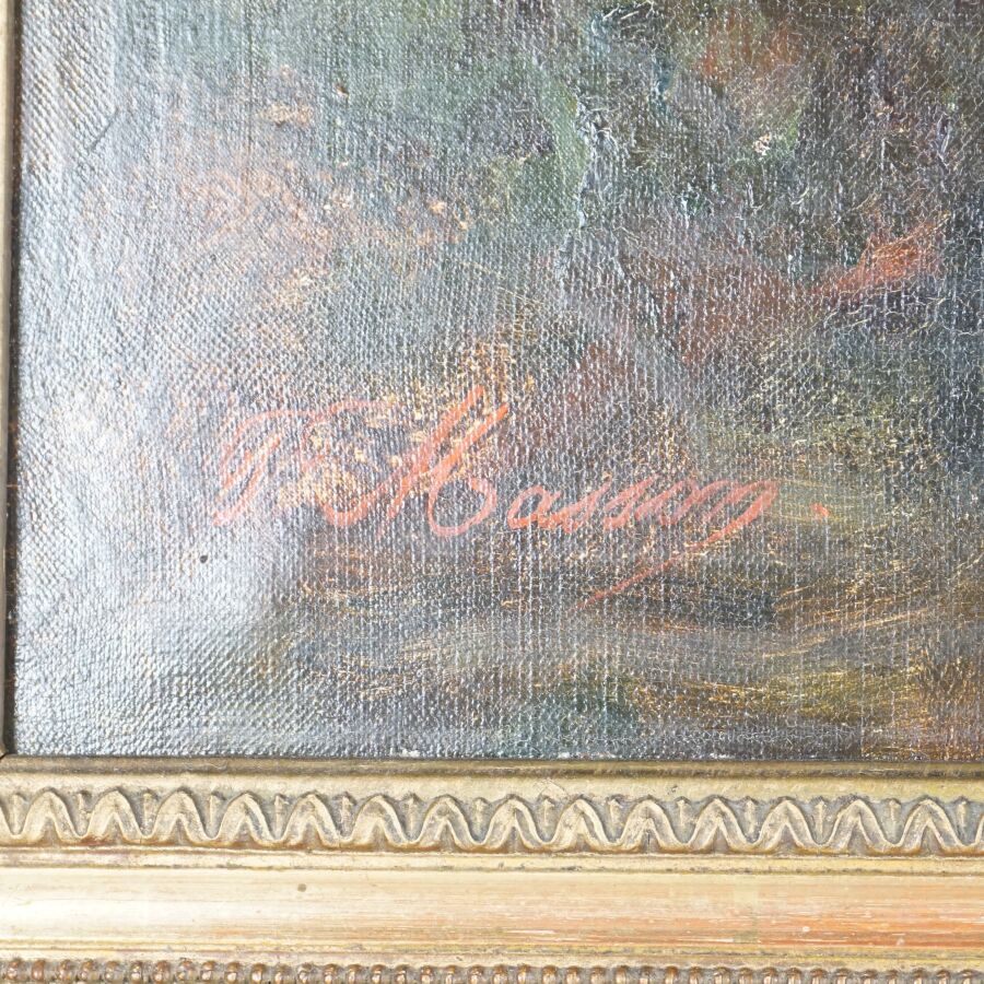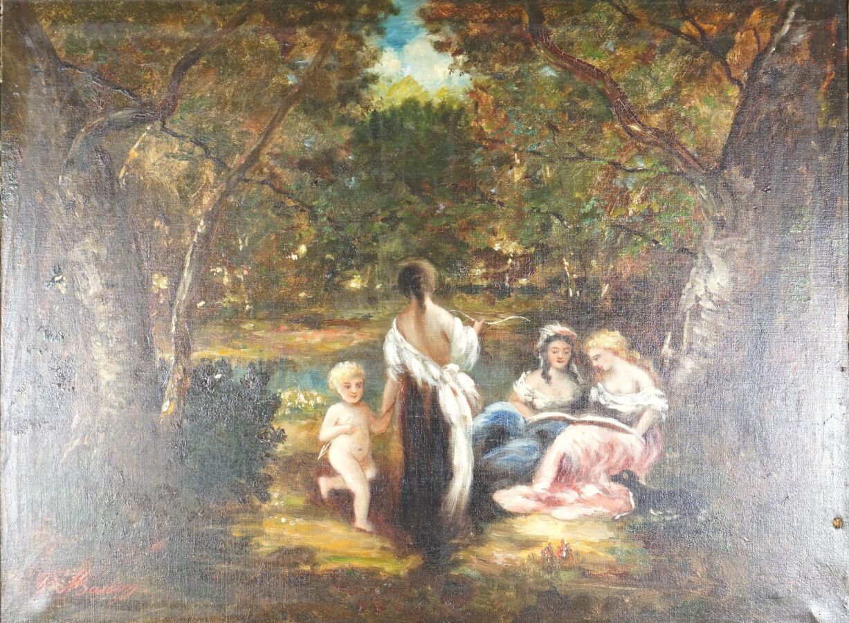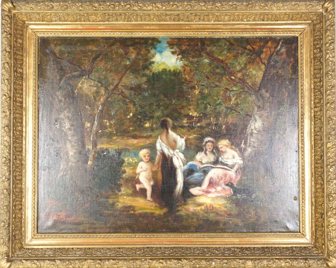 P. MASSON (XXe), "Repos sous les arbres", huile sur toile signée en bas à gauche, 49 x 65 cm (un trou en bas à droite).