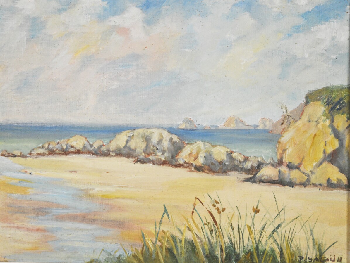 P. SALAÜN (XXe), "La côte rocheuse", huile sur toile marouflée sur carton, signée en bas à droite, 27 x 34.5 cm (accident à la toile).