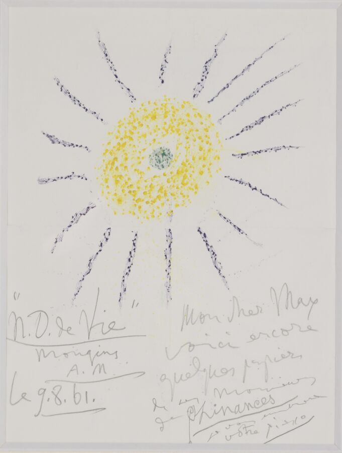 Pablo PICASSO (1881-1973), "Soleil", 1961, dessin au crayon de couleur noir et jaune représentant un soleil rayonnant surmontant une lettre autographe écrite à la mine de plomb, envoyée de N.D. de Vie, Mougins, le 9.8.61, signée en bas à droite dans laquelle l'artiste envoie à Mon cher Max un papier des contributions, 27 x 21 cm.