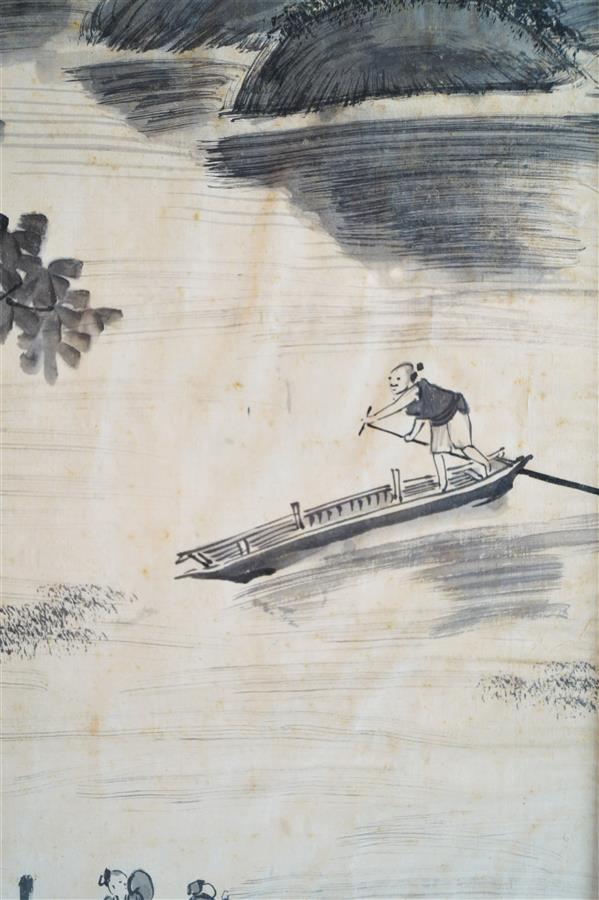 "Pagode dans un paysage montagneux", dessin à l'encre, Chine, 19e siècle, 110 x 38 cm (verre cassé, usures).