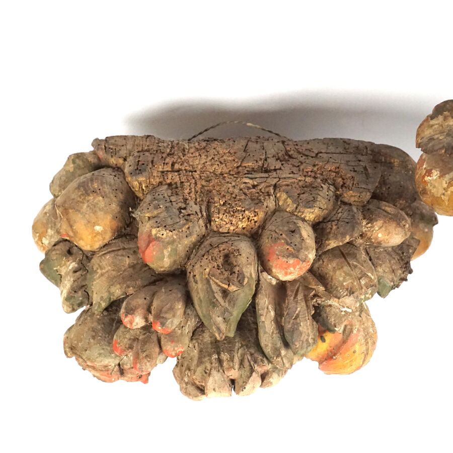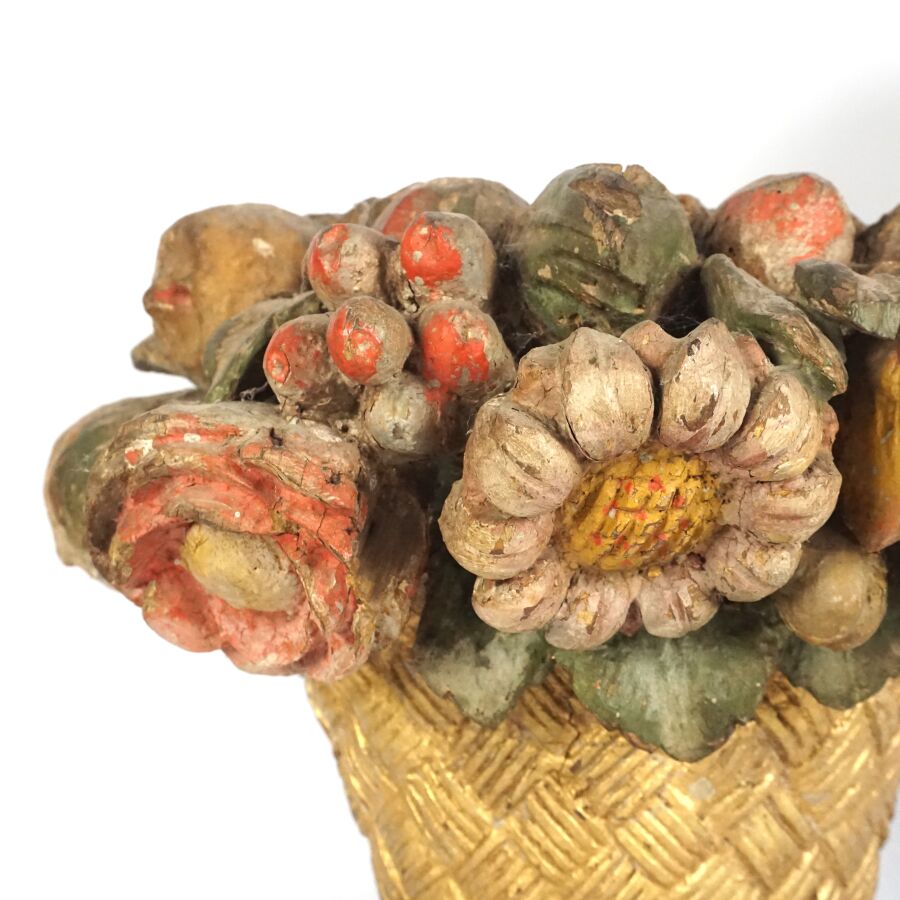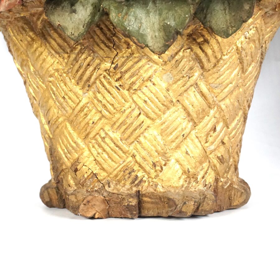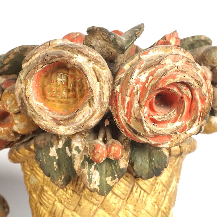 Paire d'appliques murales en bois sculpté, doré et polychrome à motif de paniers fleuris et fruits en trompe-l'oeil, 18ème siècle, 26 x 33 cm (accidents, manques, usures).