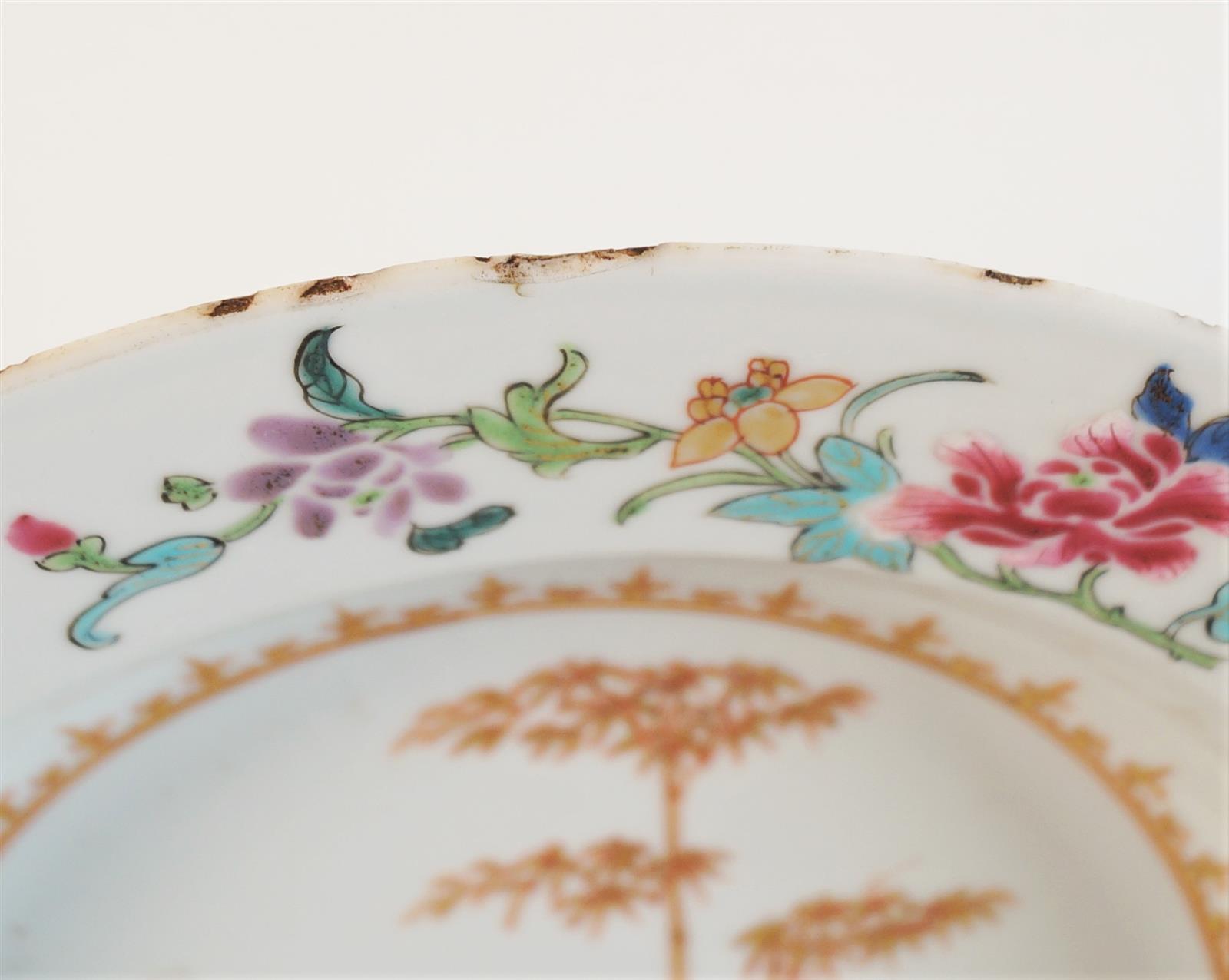 Paire d'assiettes creuses en porcelaine de la Compagnie des Indes à décor végétal en émaux de la famille rose, Chine, 18e siècle, D. 23.4 cm (égrenures). On joint une paire d'assiettes en porcelaine à décor en émaux polychrome de la famille verte, Chine, 18e siècle, D. 22.7 cm (chocs et égrenures, deux fêles au fond).