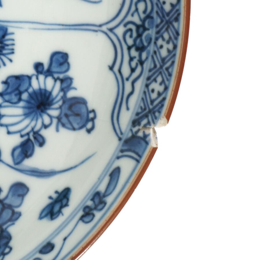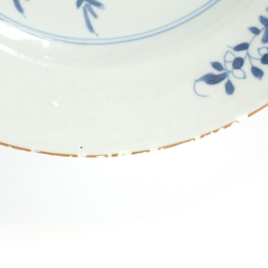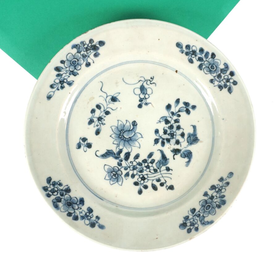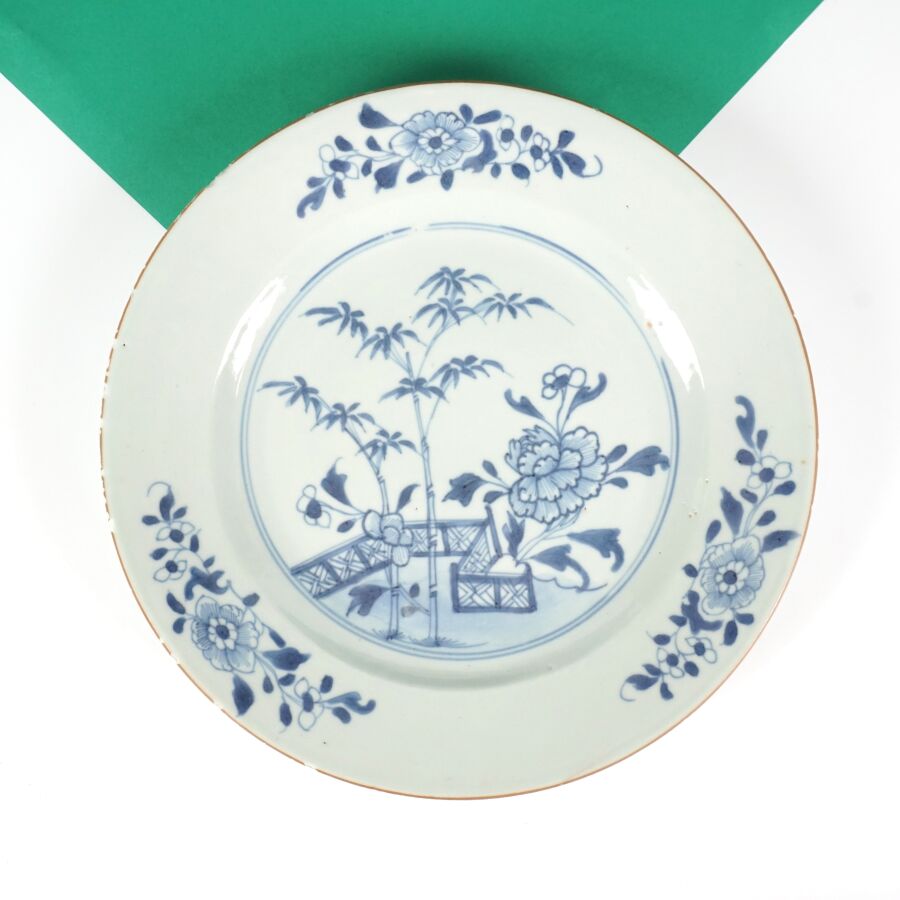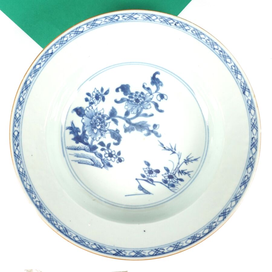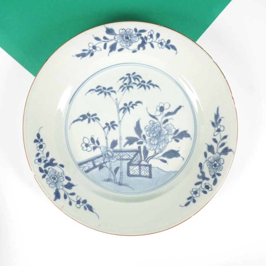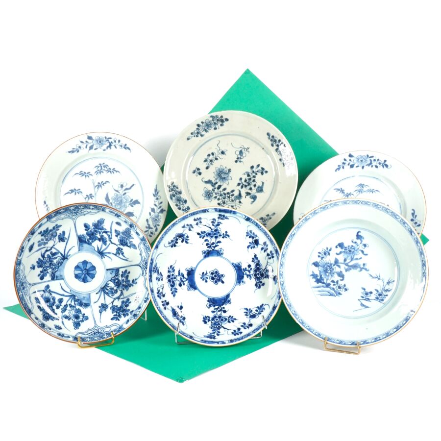 Paire d'assiettes en porcelaine émaillée en bleu à décor d'un pivoinier en fleurs et de bambous. On joint 4 assiettes en porcelaine émaillée en bleu à décor de fleurs, Chine, Compagnie des Indes, 18ème siècle, D. 22 cm et 23 cm (éclats et égrenures).
