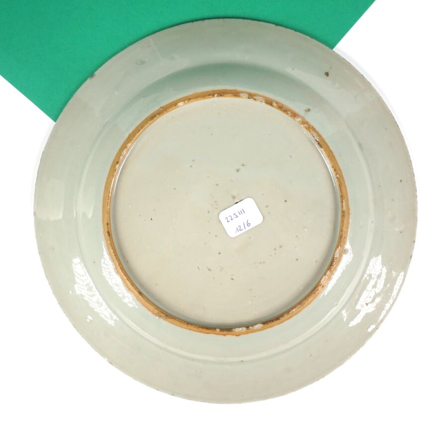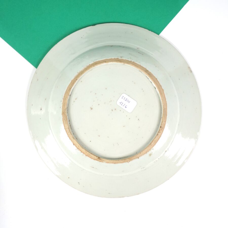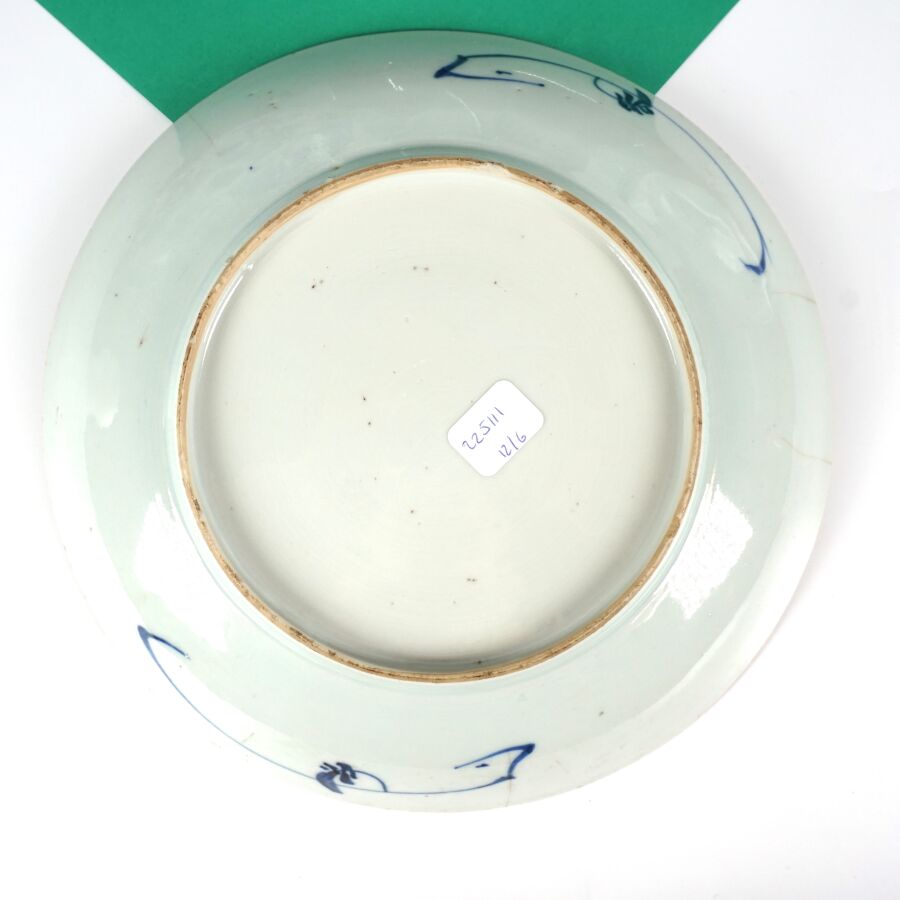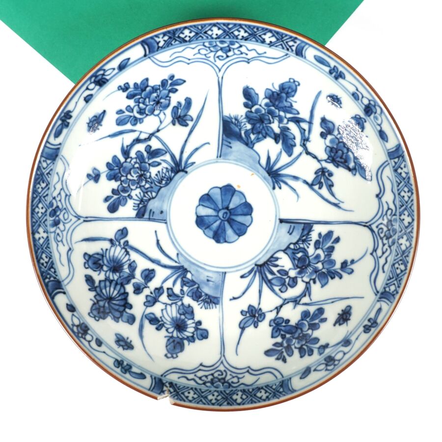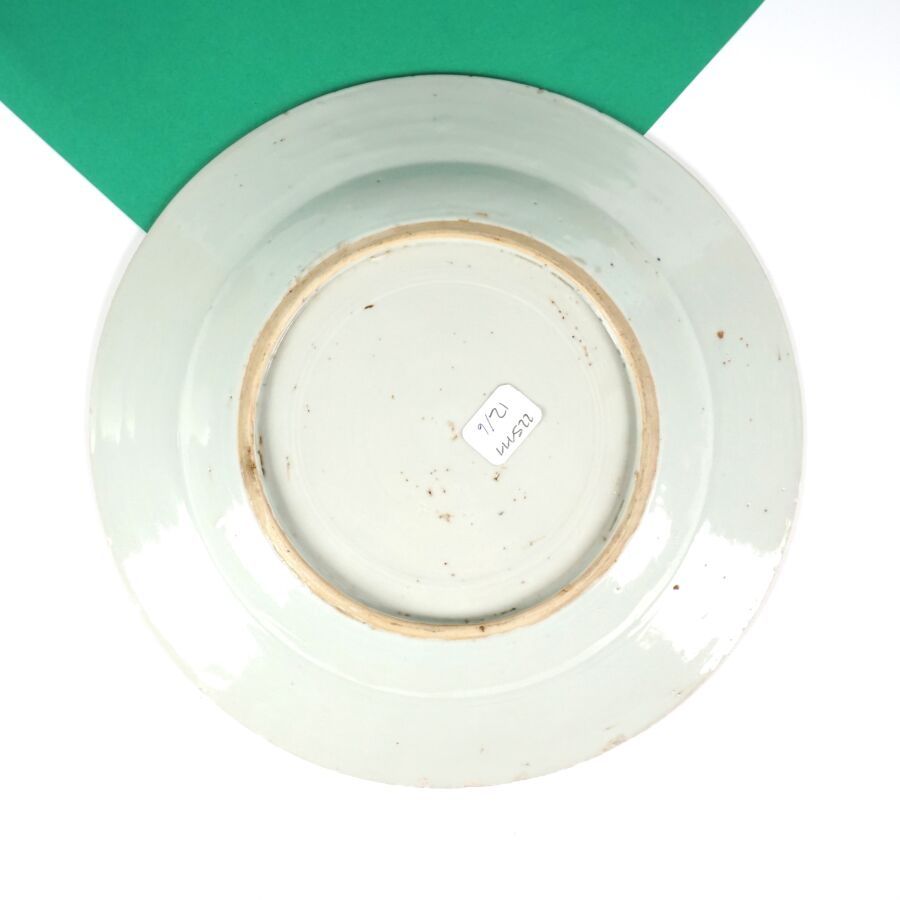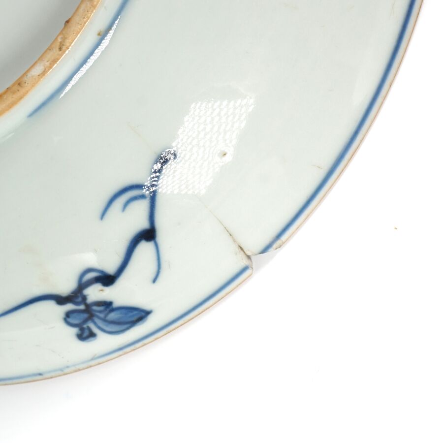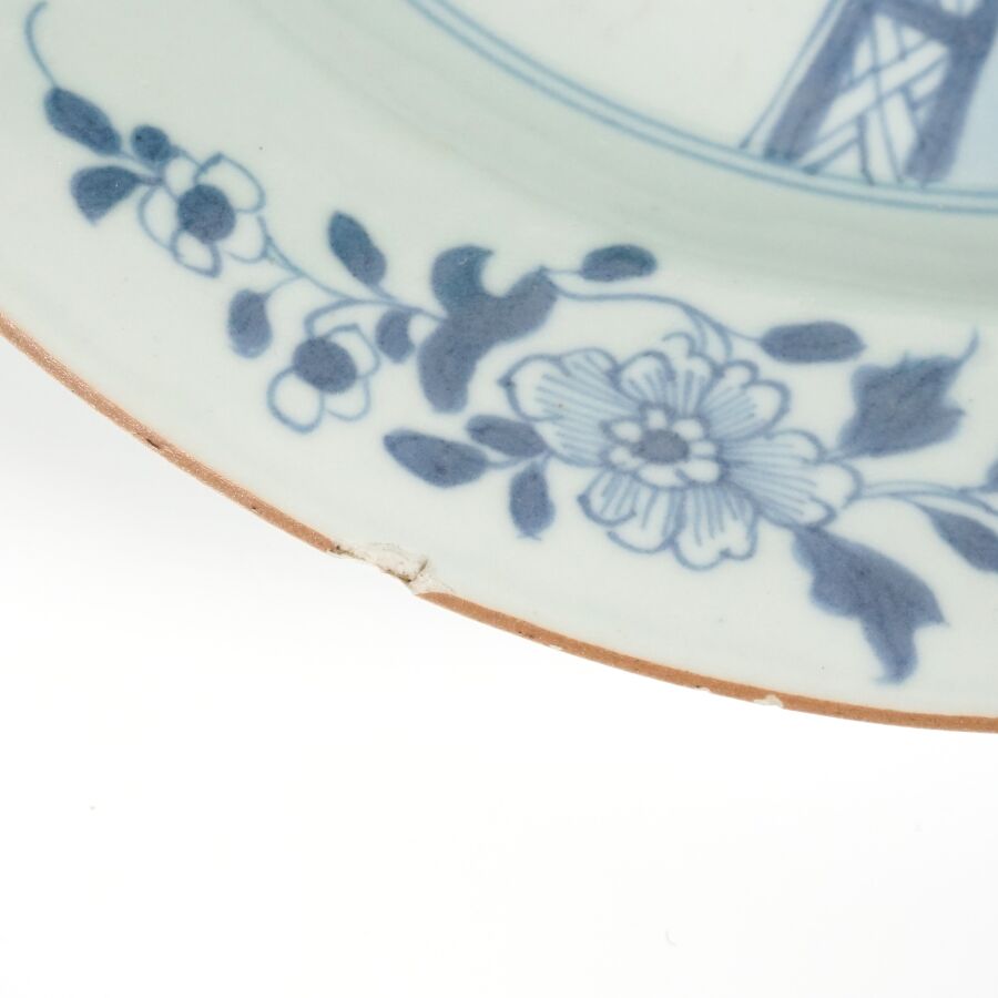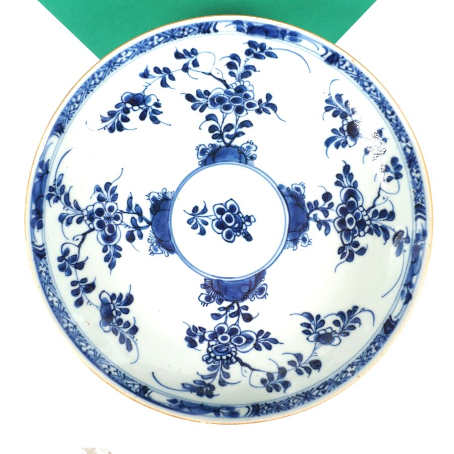Paire d'assiettes en porcelaine émaillée en bleu à décor d'un pivoinier en fleurs et de bambous. On joint 4 assiettes en porcelaine émaillée en bleu à décor de fleurs, Chine, Compagnie des Indes, 18ème siècle, D. 22 cm et 23 cm (éclats et égrenures).