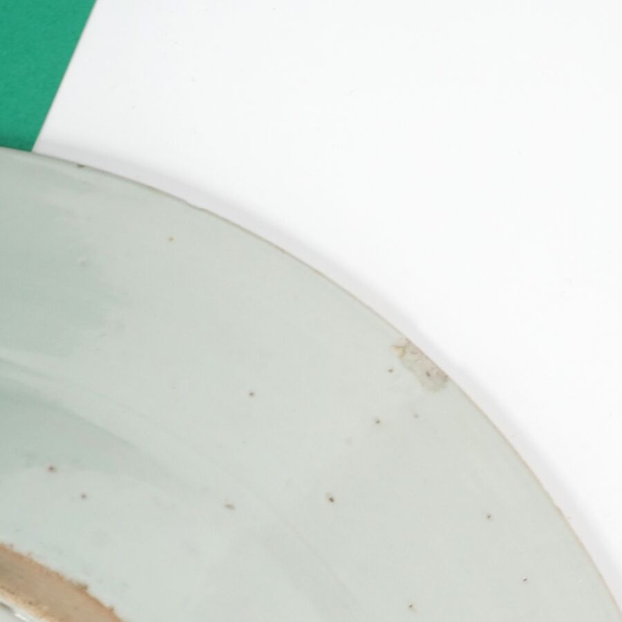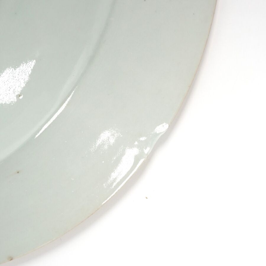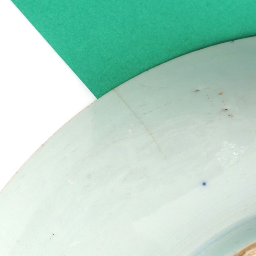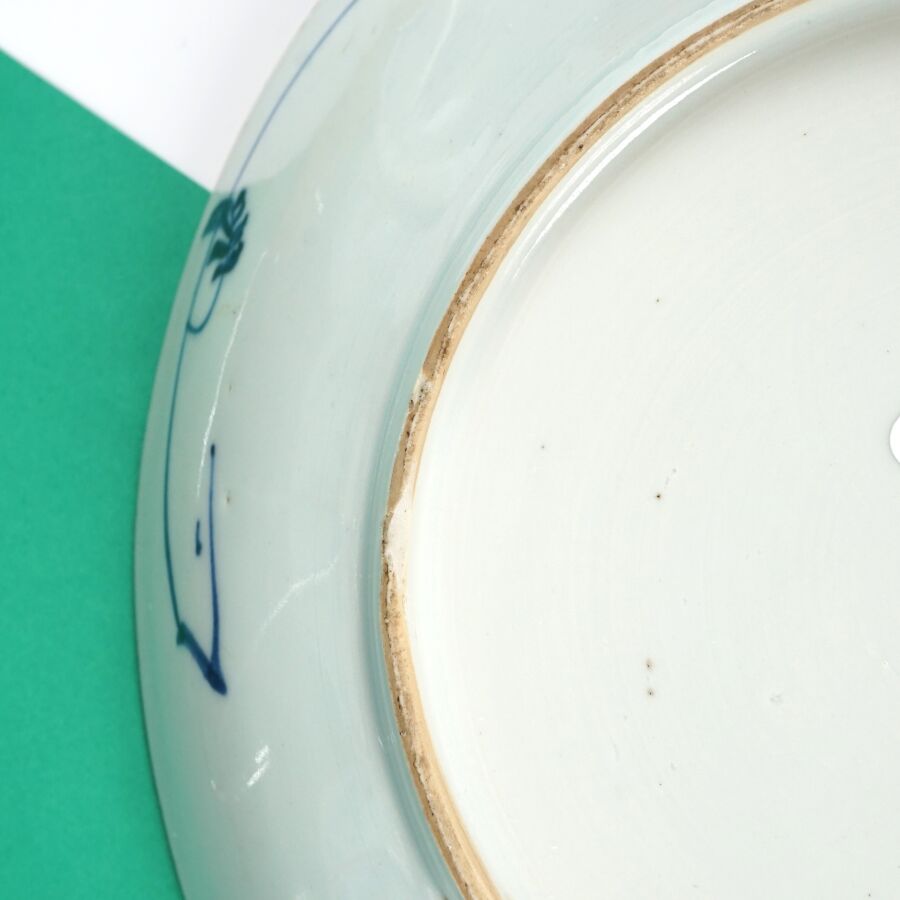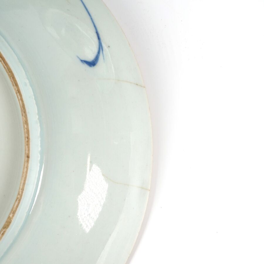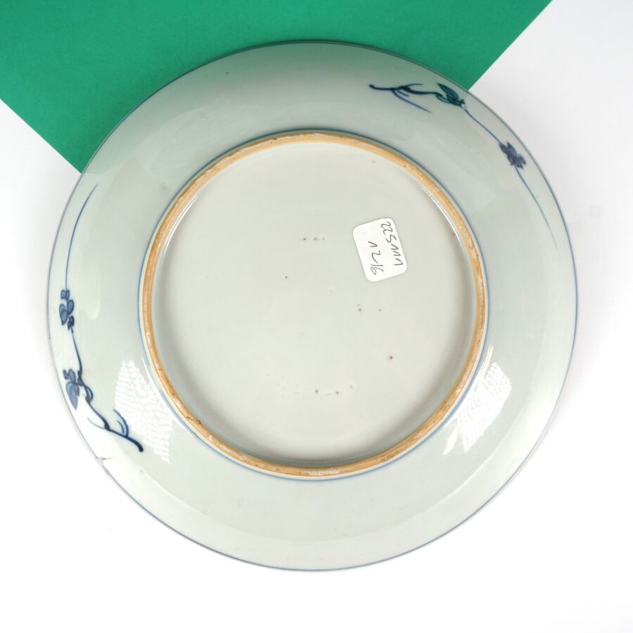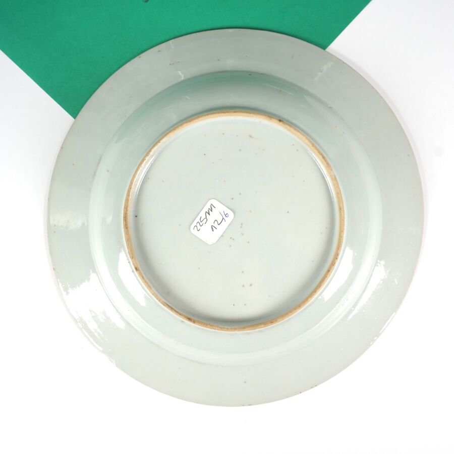 Paire d'assiettes en porcelaine émaillée en bleu à décor d'un pivoinier en fleurs et de bambous. On joint 4 assiettes en porcelaine émaillée en bleu à décor de fleurs, Chine, Compagnie des Indes, 18ème siècle, D. 22 cm et 23 cm (éclats et égrenures).