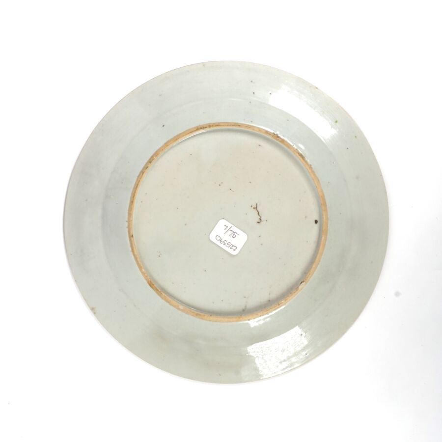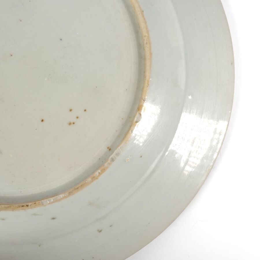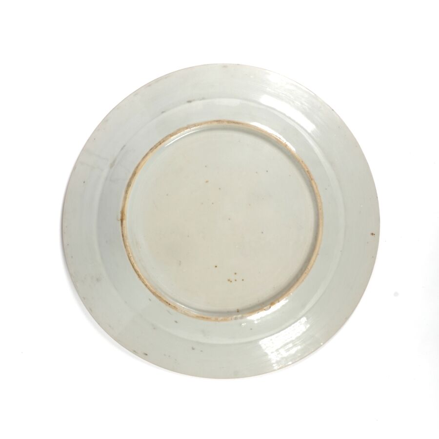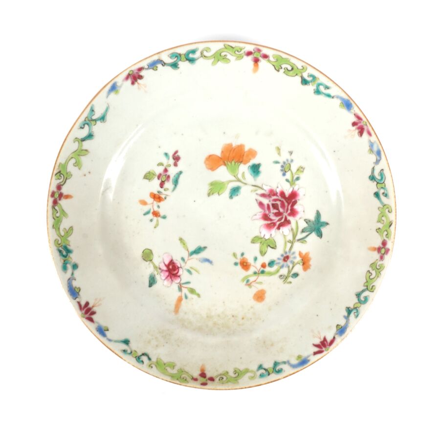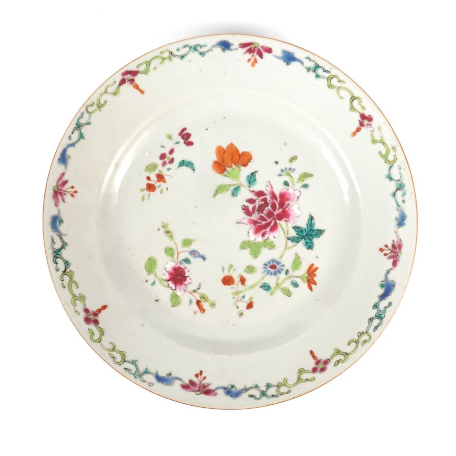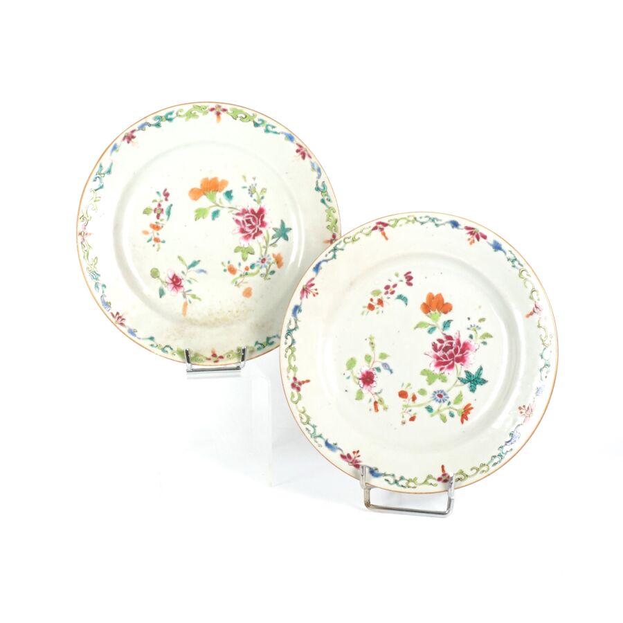 Paire d'assiettes en porcelaine et émaux de la famille rose, à décor de chrysanthèmes et de fleurs, l'aile bordée de rinceaux, Compagnie des Indes, Chine, 18ème siècle, D. 22.8 cm (petites usures à l'émail).