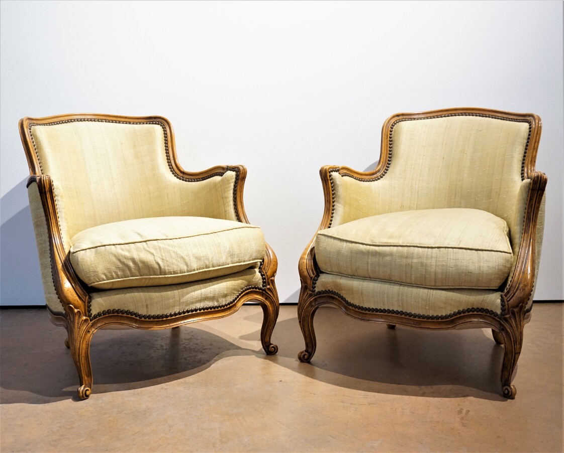 Paire de bergères de style Louis XV, montants en bois naturel mouluré, piétement cambré à motif feuillagé, garniture de tissu orcre avec assise coussin, 58 x 55.5 x H. 72 cm.