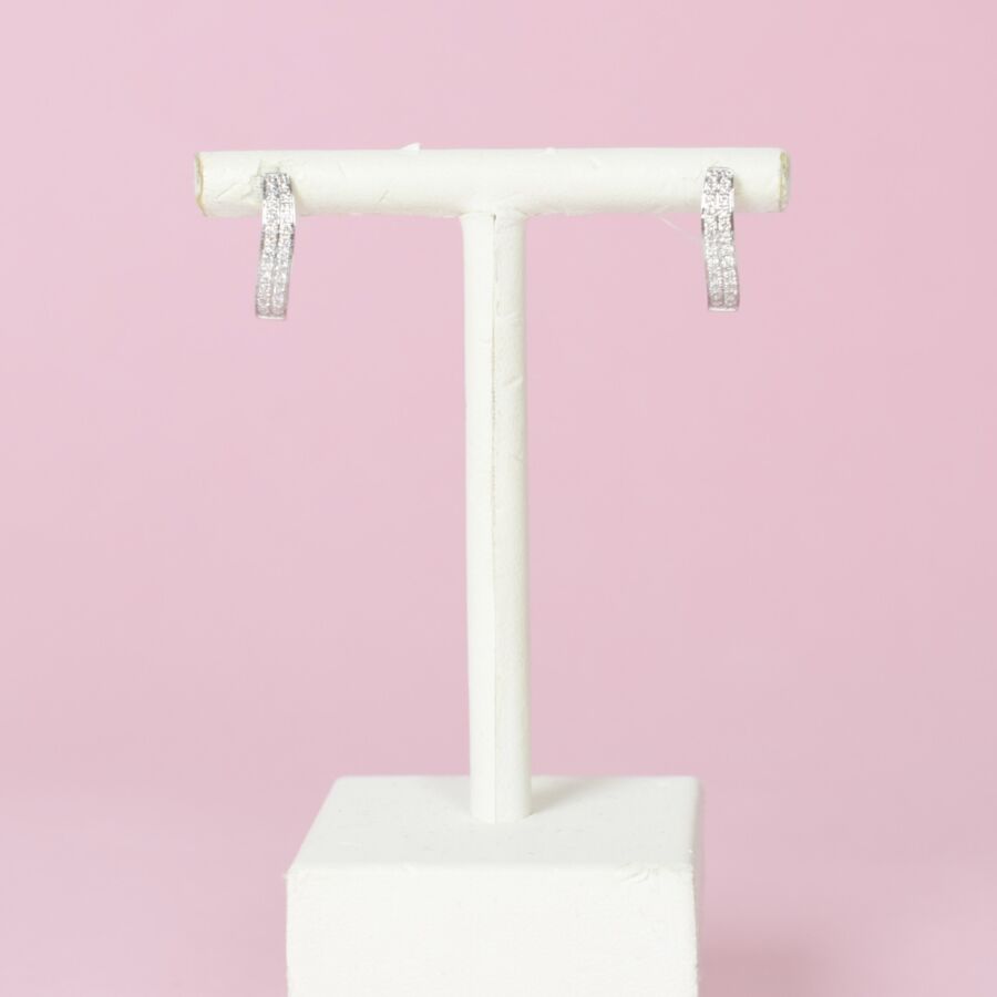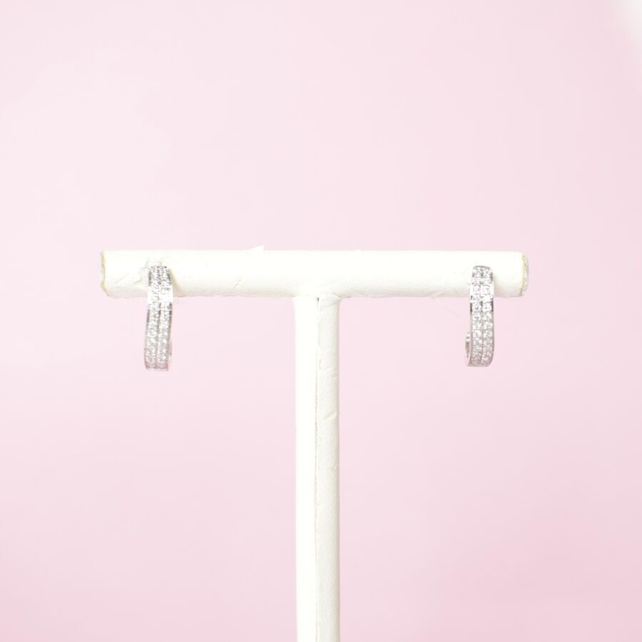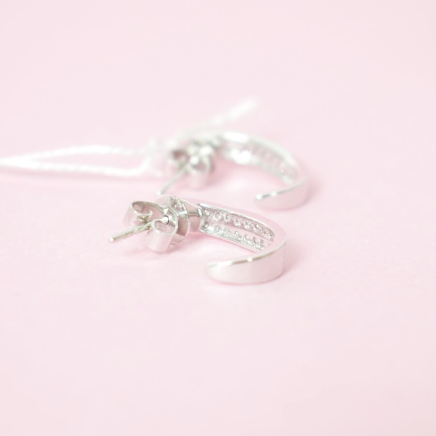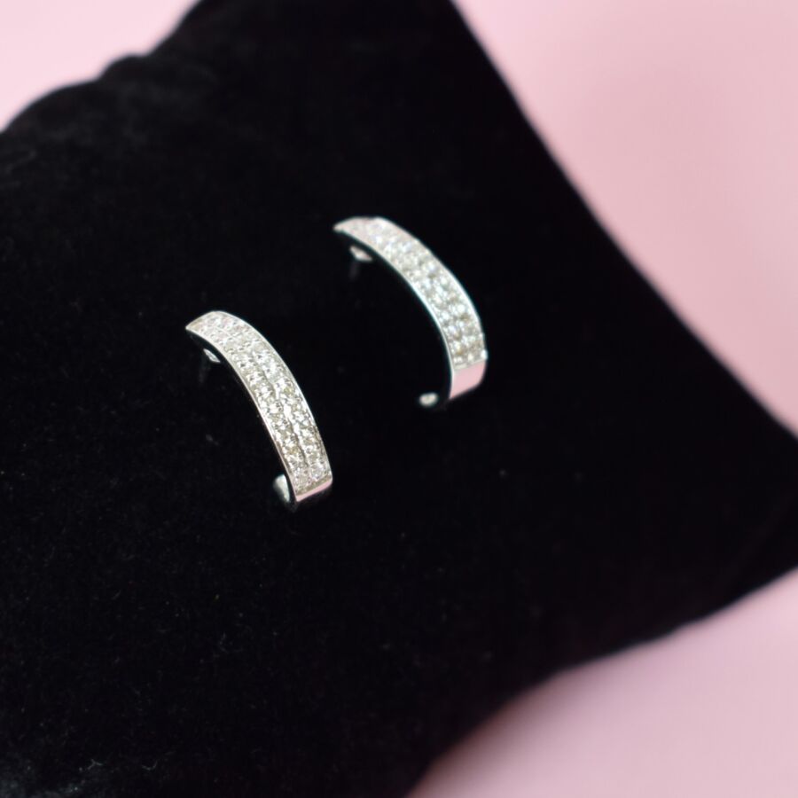Paire de boucles d'oreilles "Double lignes" en or blanc 18K (750/oo) serties de cinquante deux diamants blancs taille moderne pour 0.3 ct environ, fermoirs poussettes belges, Dim. 15 x 4 mm. Poids brut : 2.1 g environ.