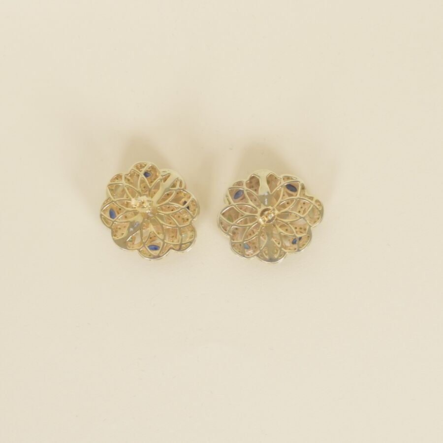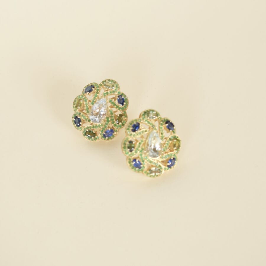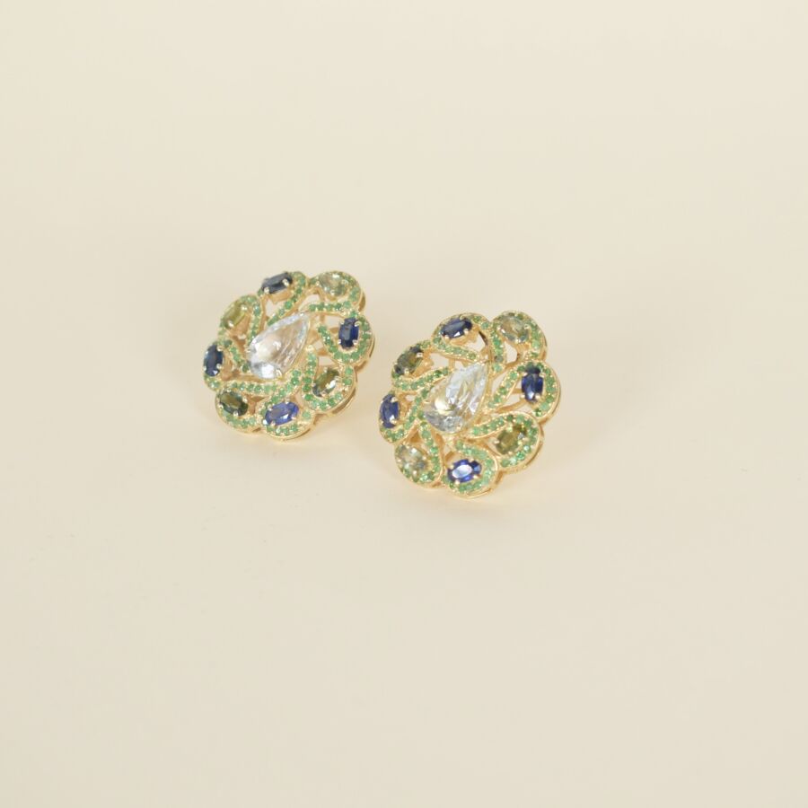 Paire de boucles d'oreilles stylisant des fleurs en argent vermeil (925/oo), ornées de deux aigues marines taille poire (Dim. 12 x 7 mm), dans un décor d'arabesques serties de grenats verts et saphirs pour un total de 13.1ct, Dim. 3 x 2.5 cm. Poids brut : 15.2 g environ