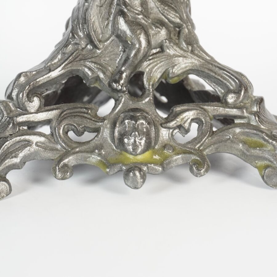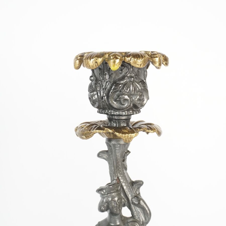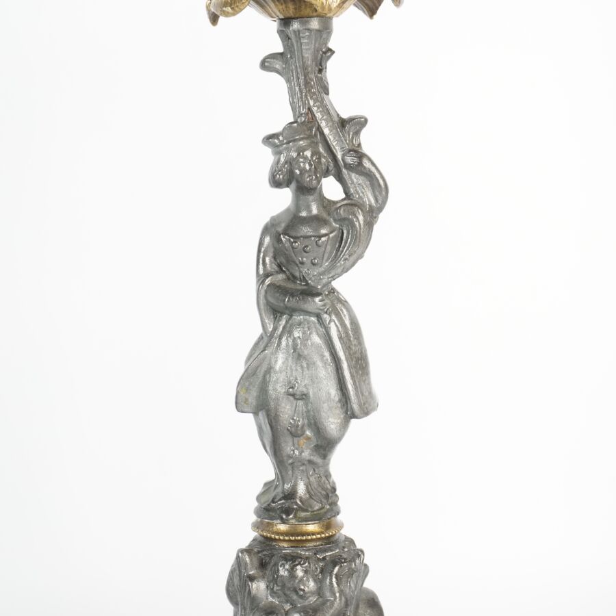 Paire de bougeoirs de style renaissance en régule à patine argentée et dorée à l'imitation du bronze, le fût orné de personnages tenant un bouton de fleurs, piètement rocaille tripode, H. 26 cm.