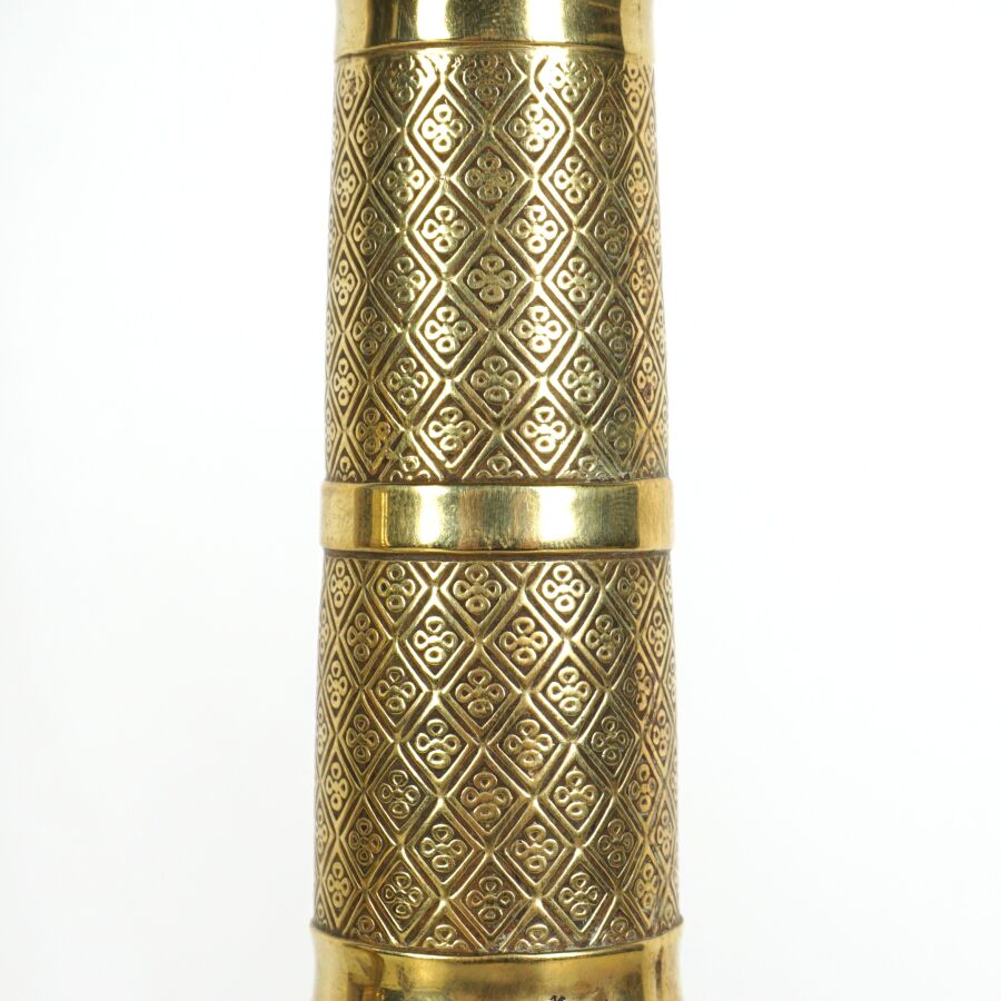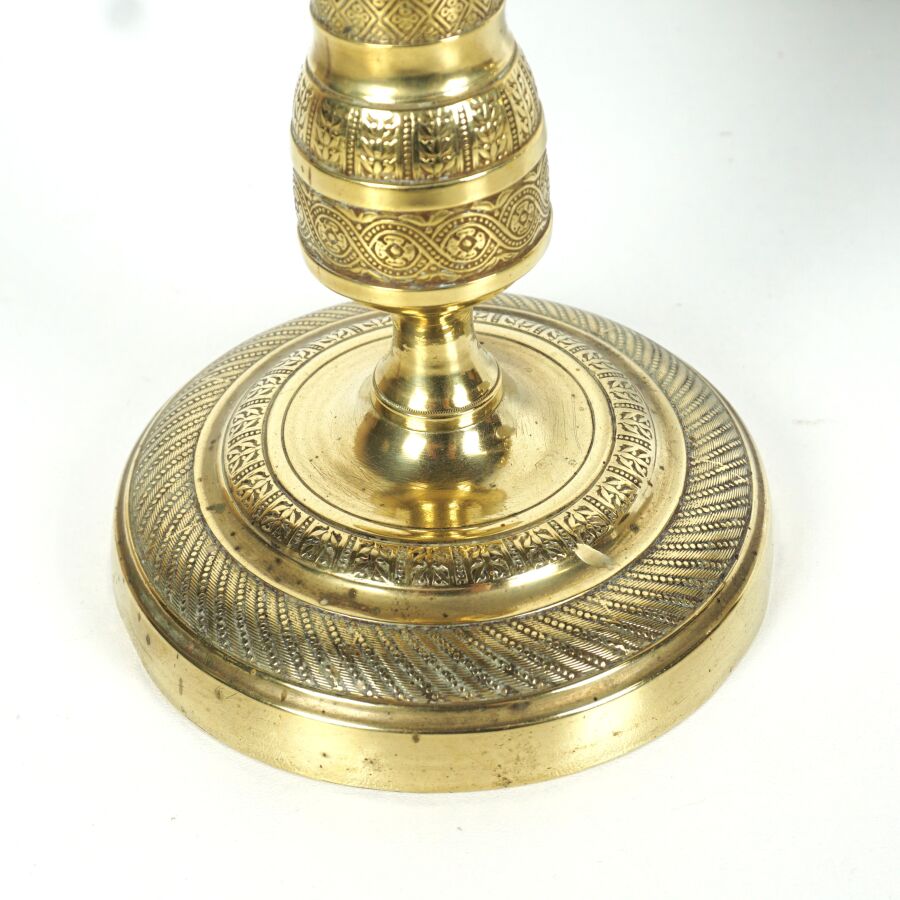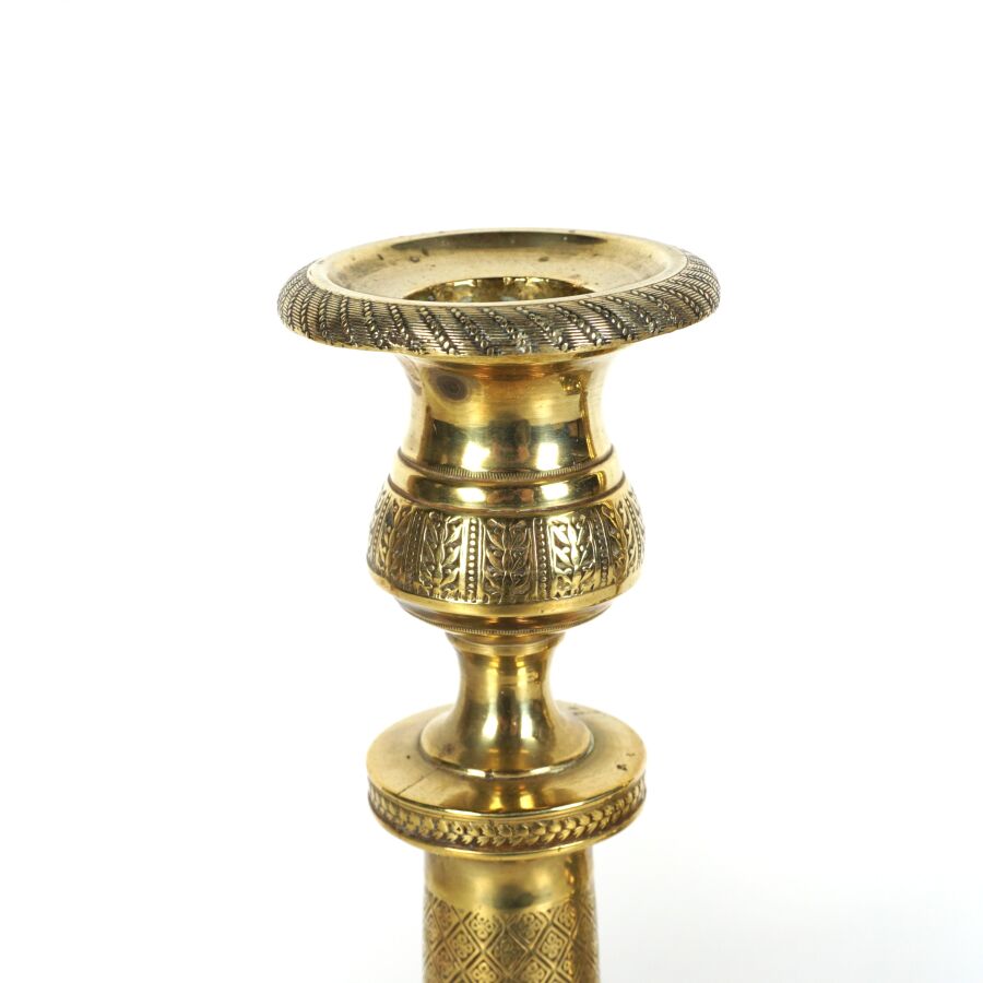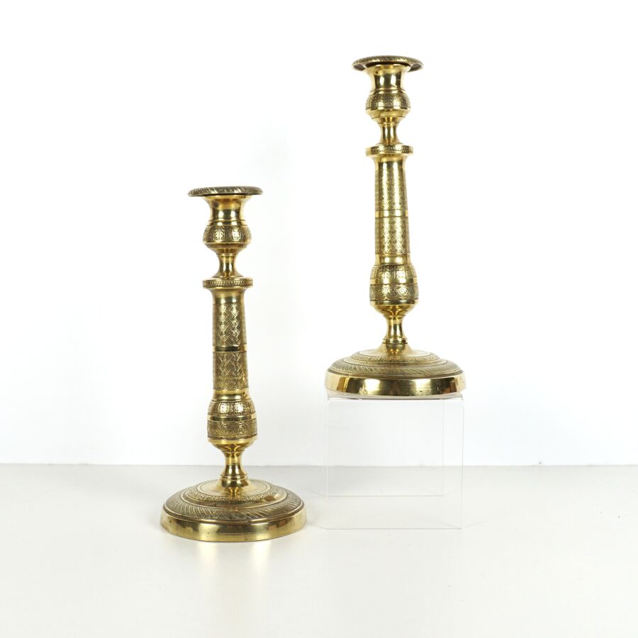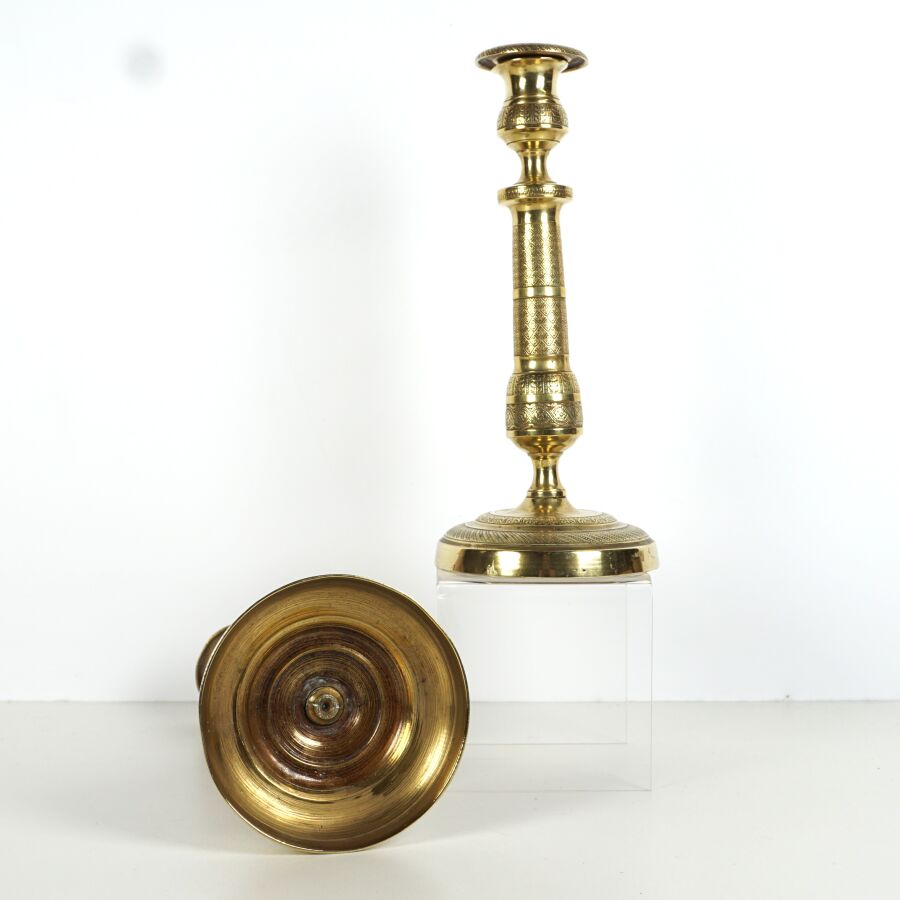 Paire de bougeoirs en laiton à décor gravé de palmettes, frises feuillagées et géométriques, époque Louis-Philippe, H. 25.5 cm.